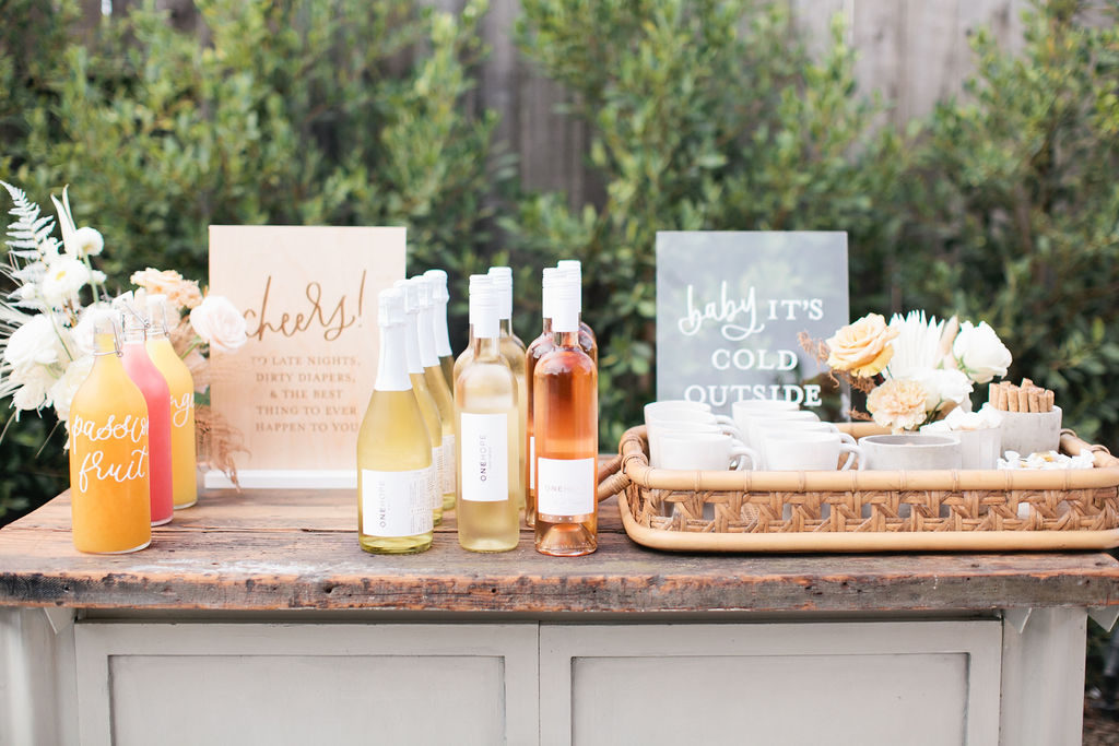 Nice little segue to the bar set up, right?! We of course served our favorite One Hope wine! Guests had the option of Champagne with yummy mixers for a mimosa, Pinot Grigio and Rosé! How great is the sign by Poppy Jack as well?!