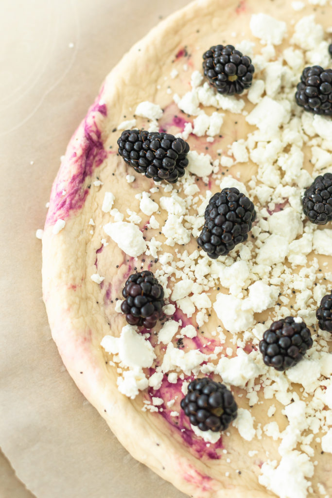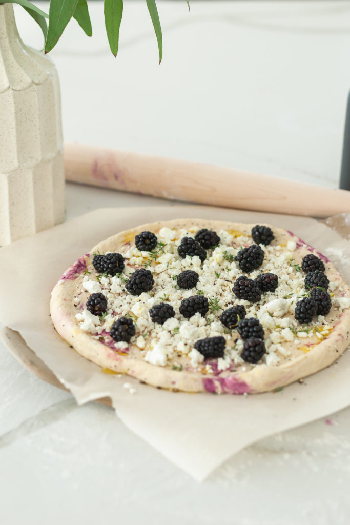 The weather is heating up, and summer is on my mind! Summertime randomly brings around more pizza for the Guido family. It would make sense if we had a pizza oven in the back, but we don’t. Maybe we embrace our Italian side more in the summer? Who knows! But none the less, we love pizza. My kids are at the age now where I can get a little more creative with the ingredients for our pizzas. My favorite is taking pizza and making it into more of a dessert pizza. And this blackberry goat cheese pizza screams summertime goodness!