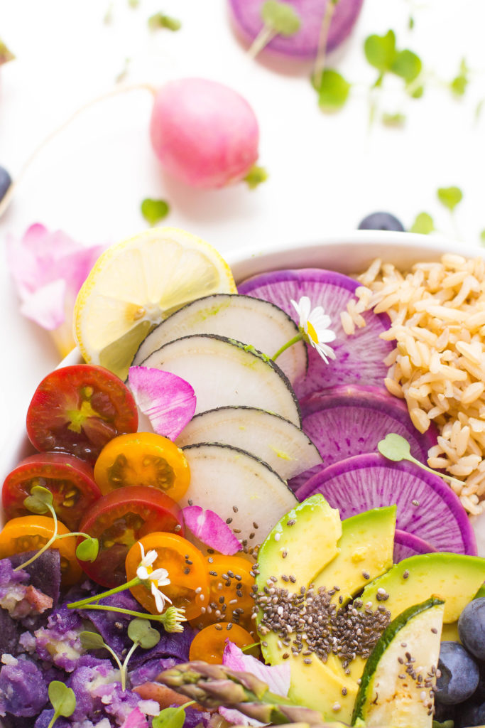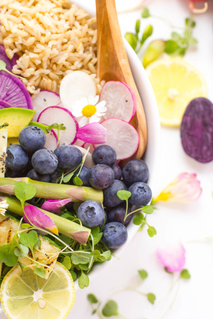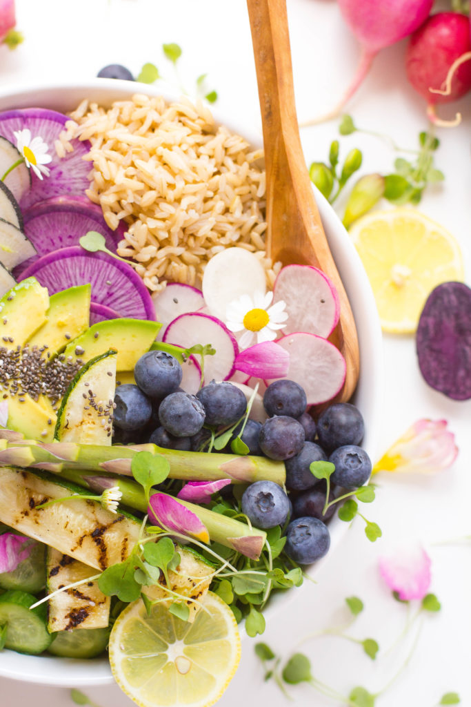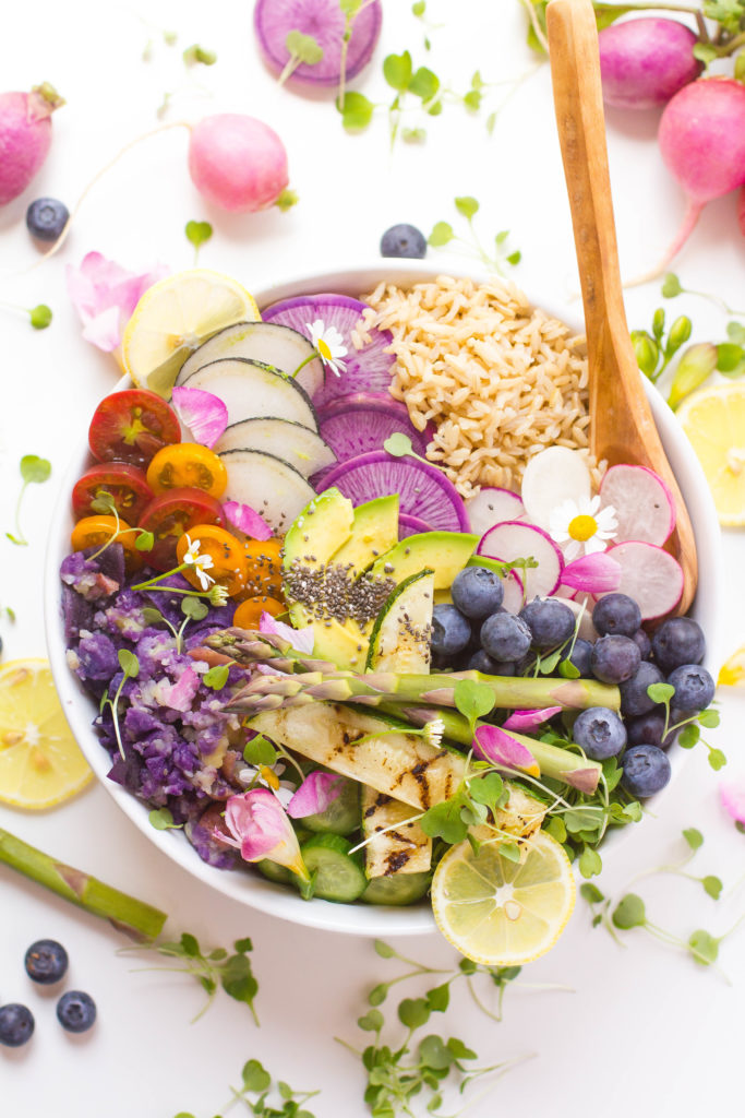These bonding memories not only teach them about what it is in season, but also creates an opportunity to discuss the senses (taste, sight, smell, touch), boosts self-esteem, and encourages creativity which I love. All I can say is that I’m doing something right cause my kids eat more vegetables than my husband and myself combined. One of our favorite things to make is buddha bowls or hippie bowls. Also, these bowls allow each of us to put in our favorite ingredients. This is my take on a spring Buddha bowl.