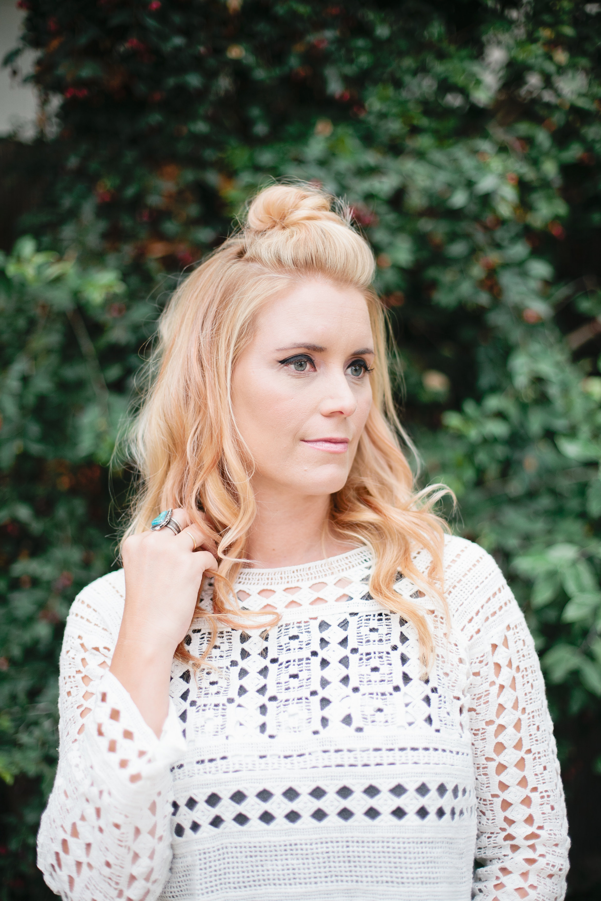 For the top knot, grab a handful of hair at the crown of the head and apply a pomade. Twist up and then down into a knot. Once you secured it with bobby pins, pull out small pieces to make it messy.