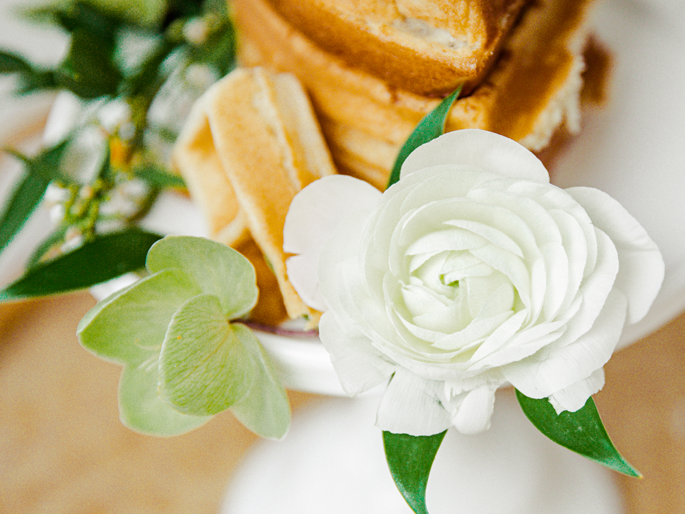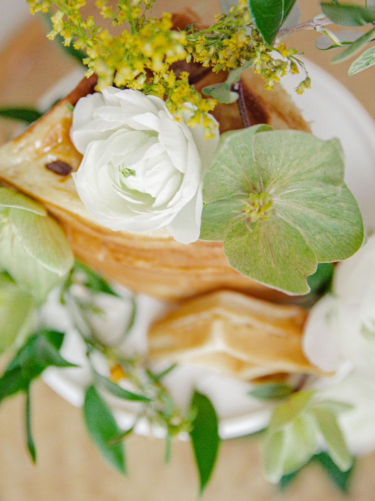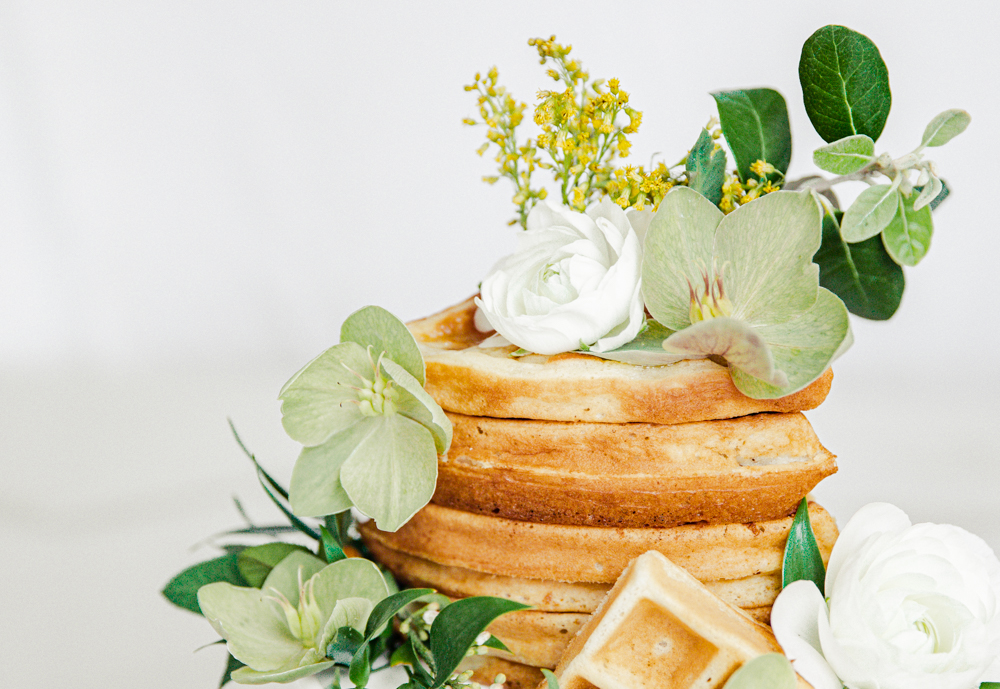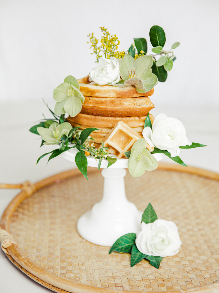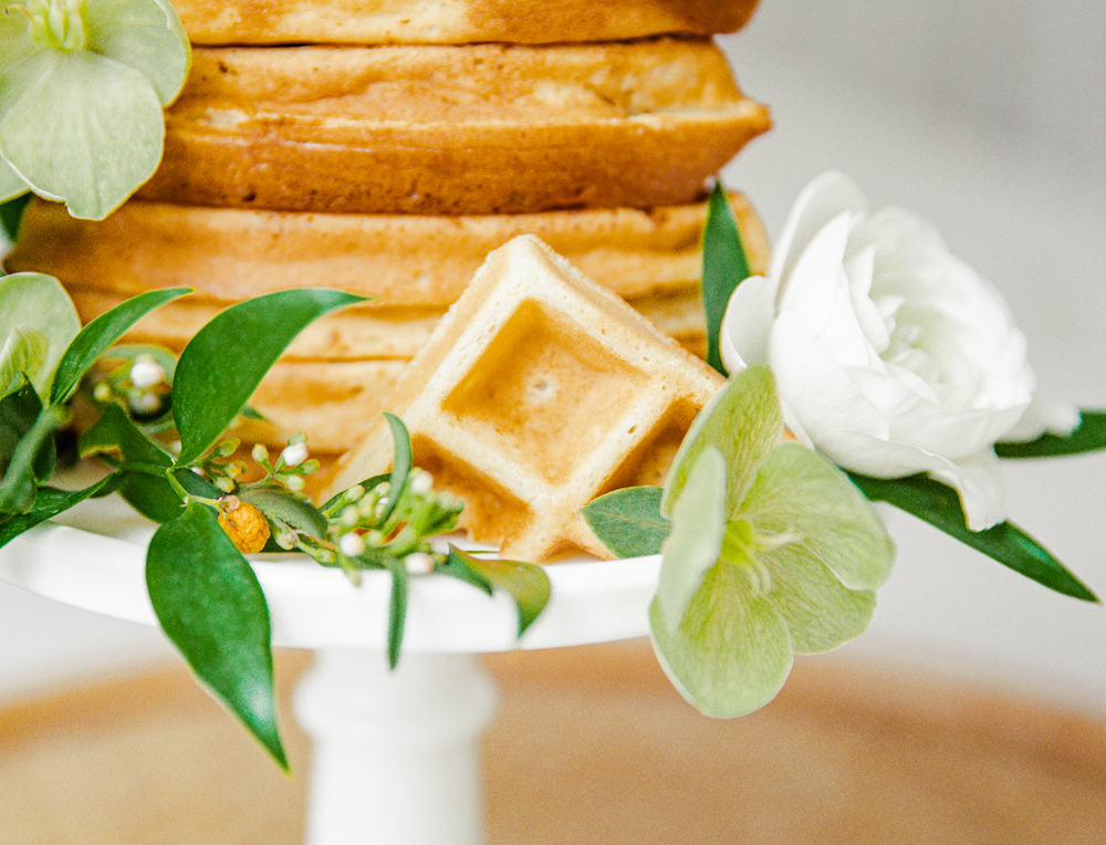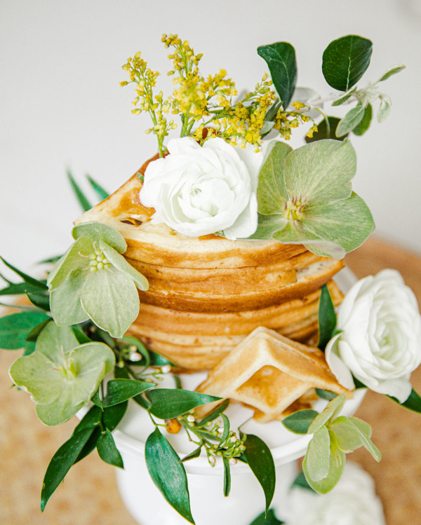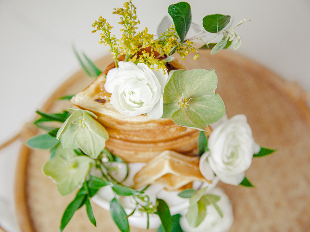 Super easy! Just layer your waffles on top of your cake stand. For the waffles, I did make my own, but I used a boxed waffle mix. See my favorite waffle mixes below. You can totally use frozen, a boxed kit, or from scratch. Then simply apply flowers on them. I used a little bit of honey to help make them stay in place. You can also incorporate herbs and flowers that are edible. For that extra touch, drizzle syrup down the sides when serving! All ages will enjoy it! Defintely a fun way to eat your waffles.