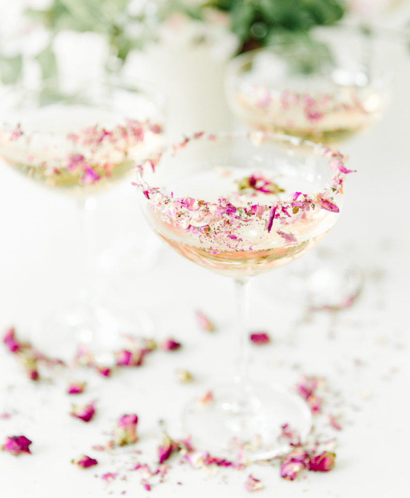 Let’s dress up our martini coupes. Sprinkle some of the dried rose petals into a small bowl. Using some of the simple syrup, coat part of your glass. Then gently, press in the rose petals.