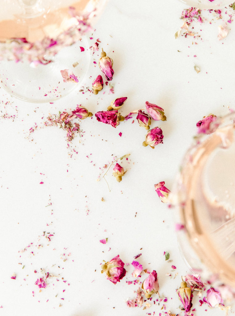 Trick: Crush up the rose petals to they have a better chance of sticking to the glass. You don’t need to coat the whole glass. They are really just that romantic look.
