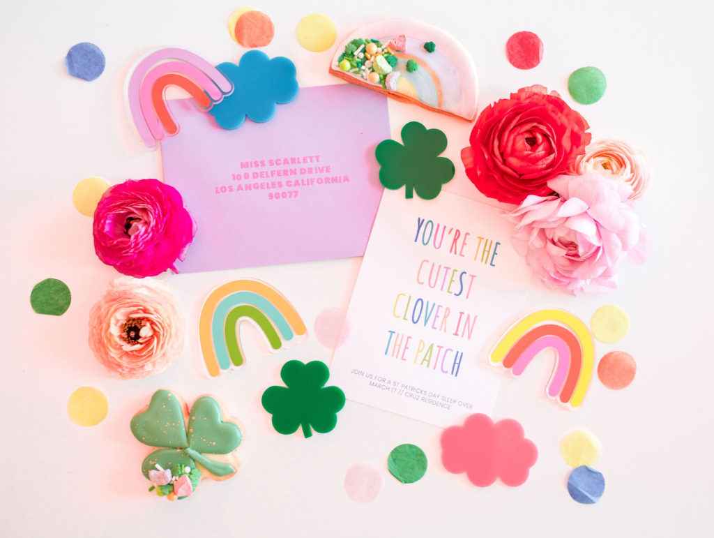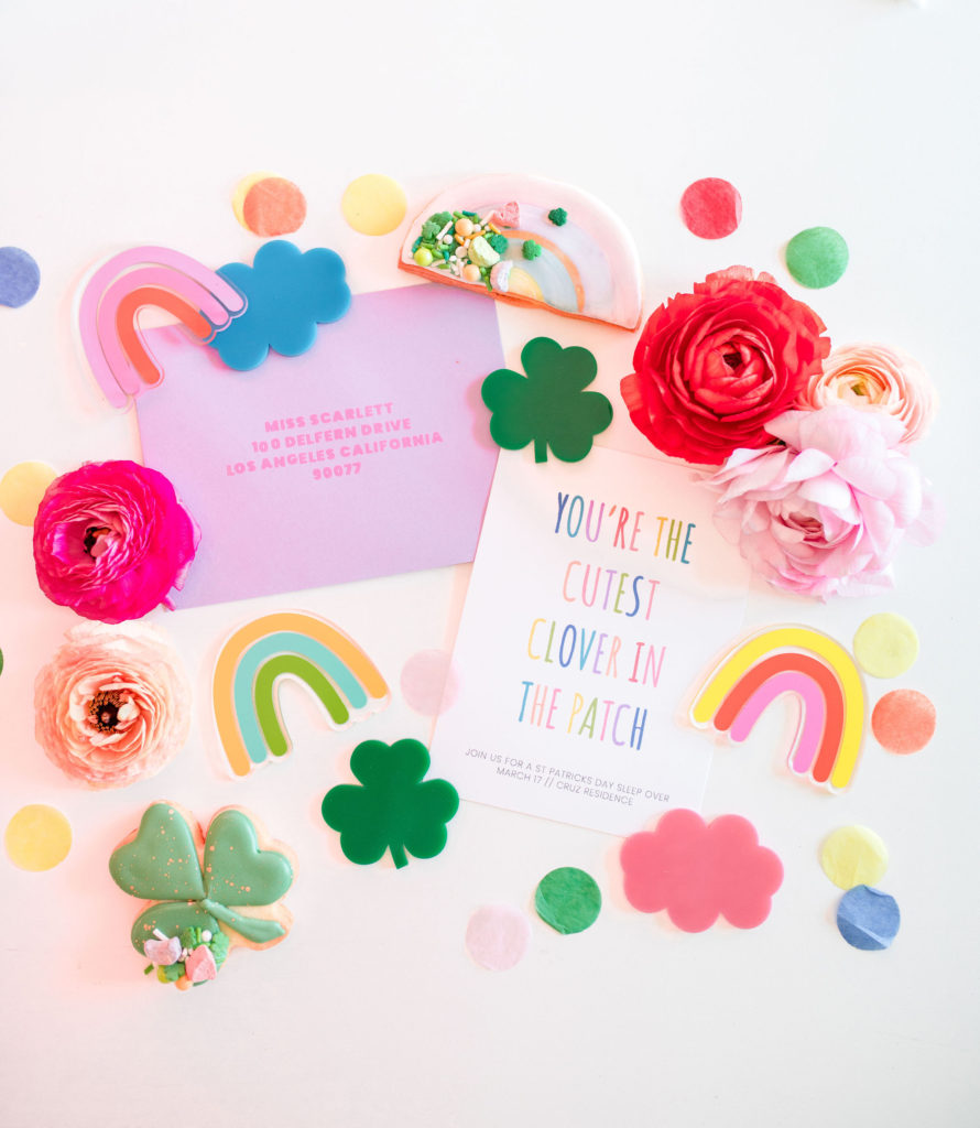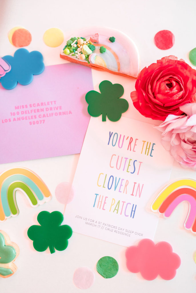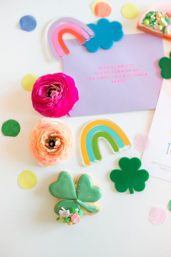 Lots of pops of color for this one! Starting with the adorable invitation by David & Leanna! The cutest clovers in the patch are coming to this party and I can’t wait! We styled it up with cute acrylic cut outs she also designed and cookies from Frost Your Cookie – more on those later…