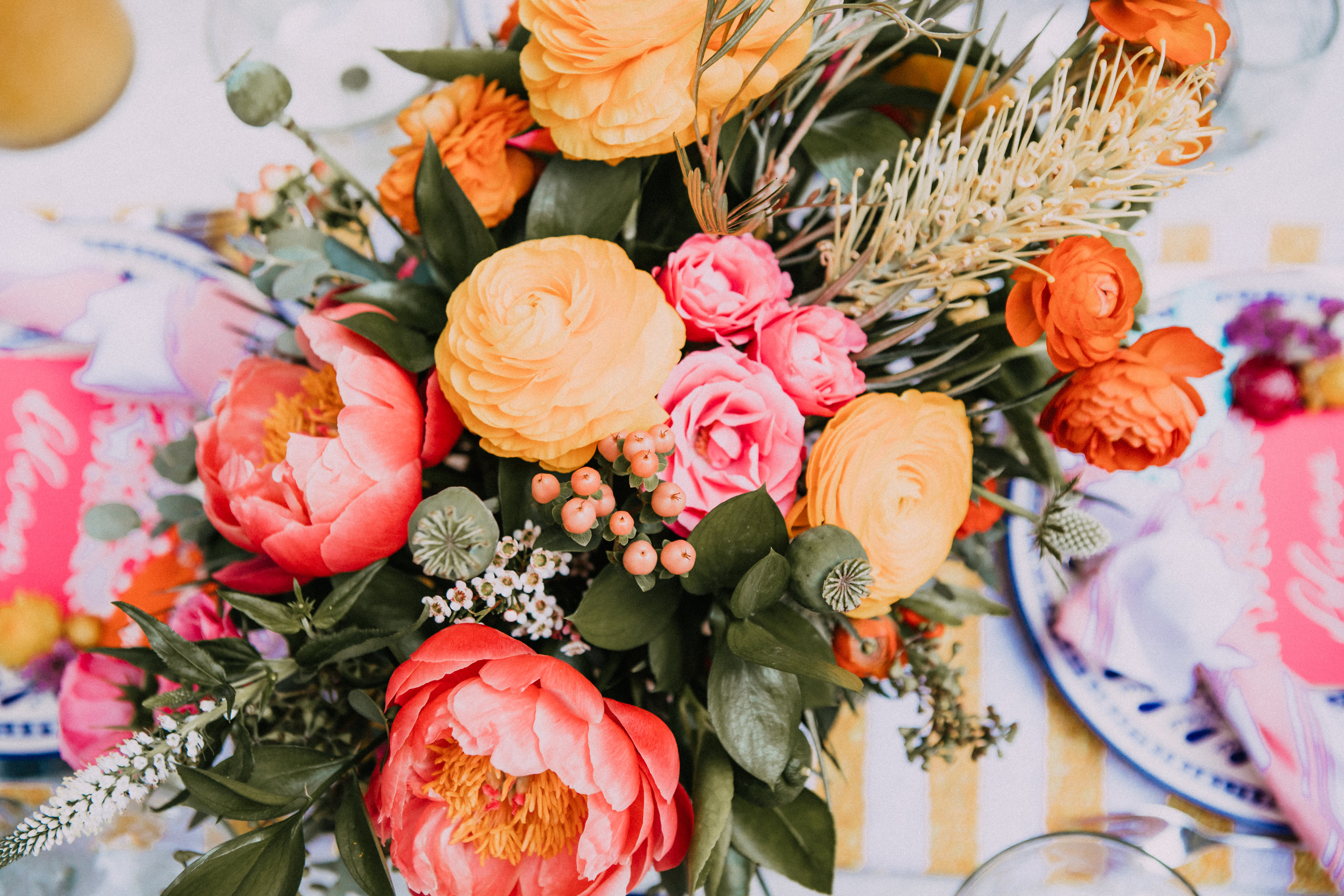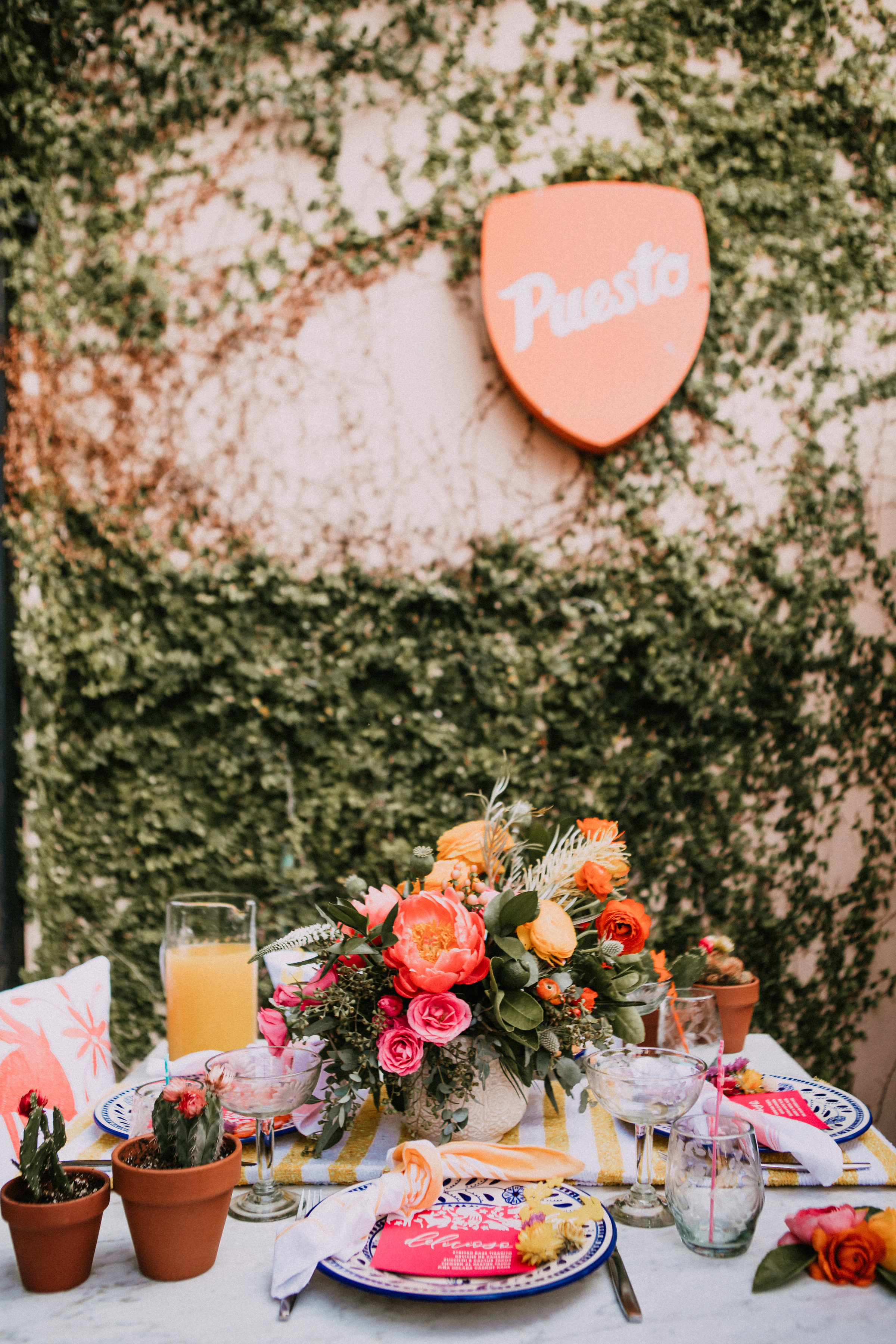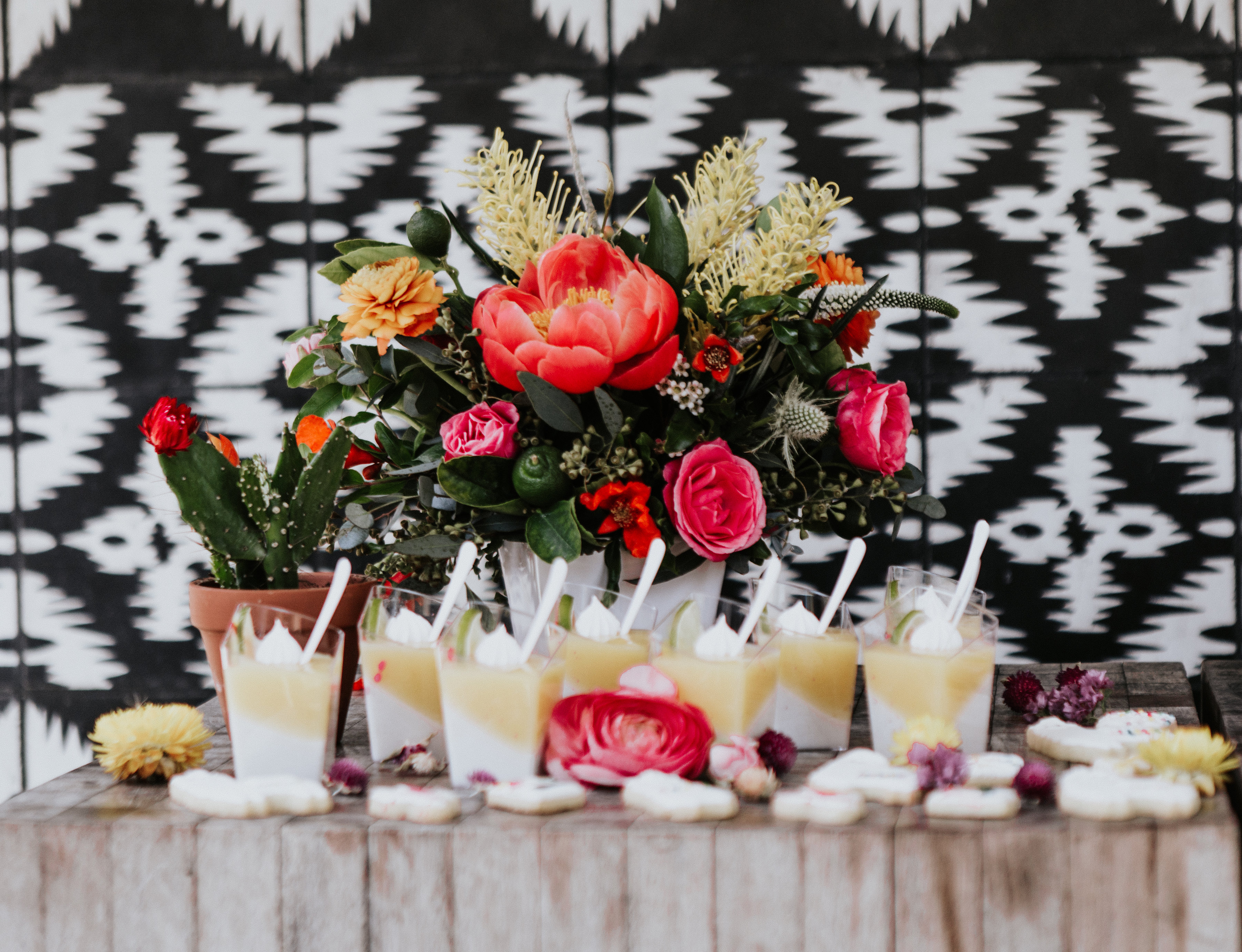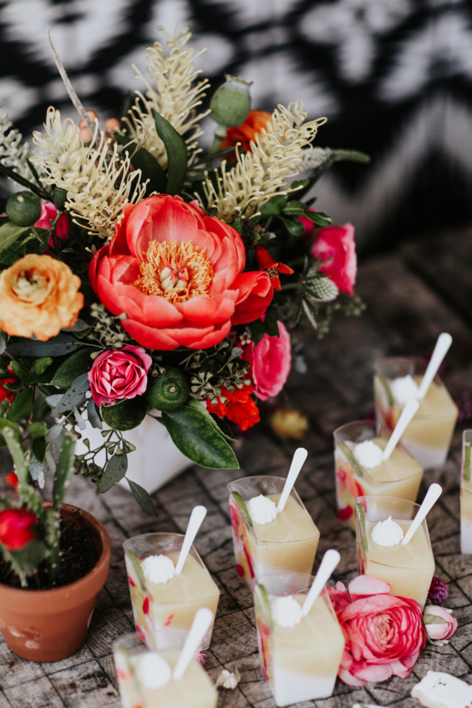 There are so many things about this table that I love… The flowers by Wallflower Inspiration are beyond gorgeous, she had just the right amount of Mexican flair mixed with bohemian goodness. The pops of color, the limes and those peonies are beyond amazing. She even added little pots of succulents and brought some fun straw flowers for me to use, which I am now obsessed with!