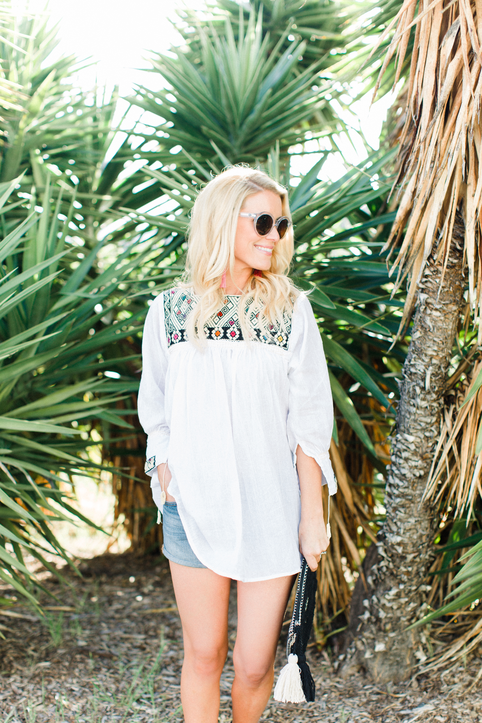 Here is Abby’s cute look below… She went with the San Andres Top, which is more like a tunic.  Abby paired it with her favorite Levis’s cut offs.  So fun because it can definitely be casual, but Abby dresses hers up with fun accessories.  I love her Vanessa Mooney Astrid earrings (so much so that I have them in green!), adorable Sole Society clutch, Target black sandals and D’Blanc lucite sunnies.  Perfectly accessorized and ready for some chips and guac!!