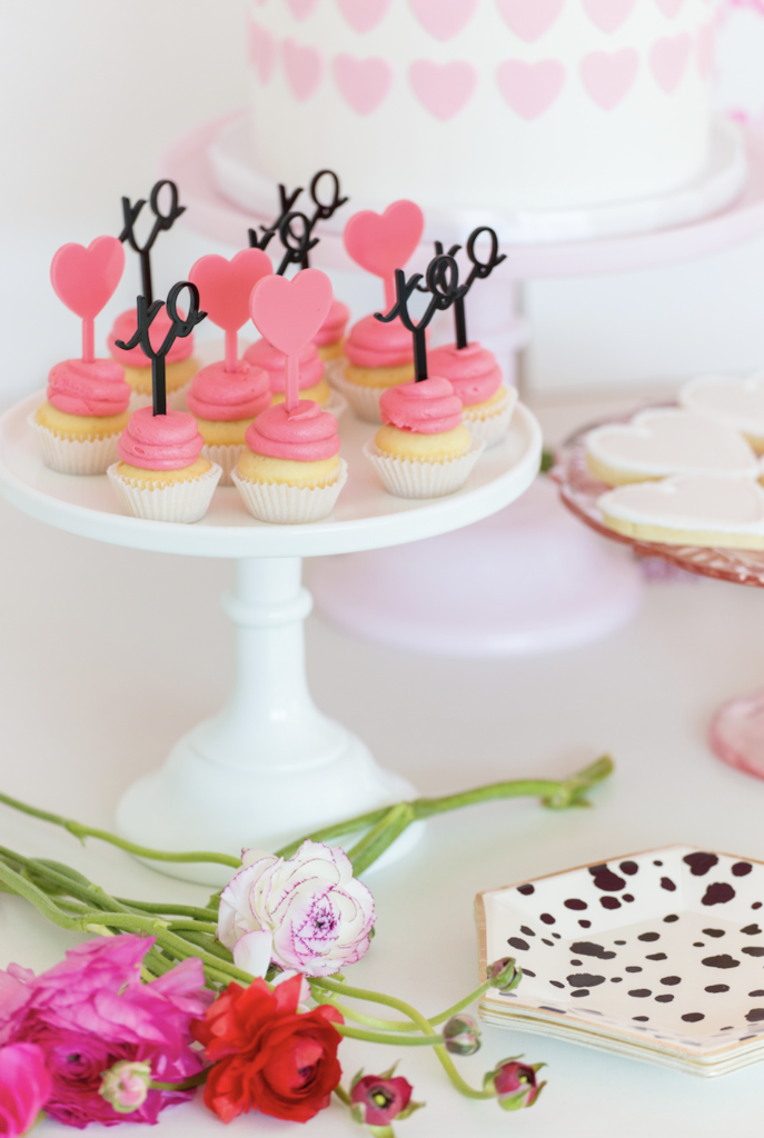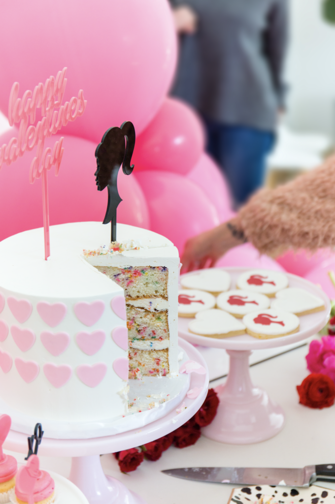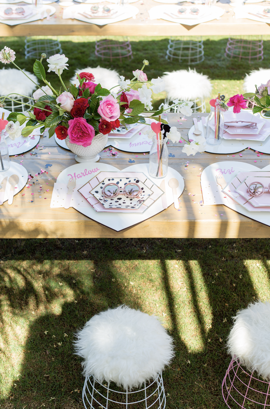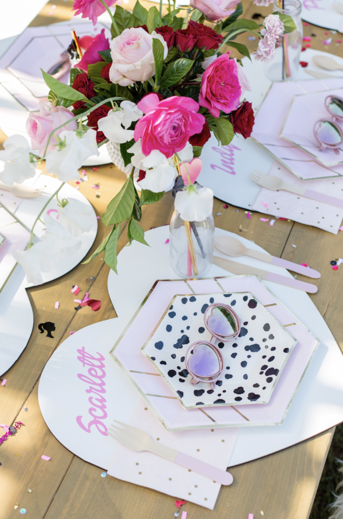 To begin with, these rentals are just to die for. Teak and Lace has the cutest fur stools, they were truly a must for this one. For the tables we had fun mixing prints and using pink, white, black, and gold with the tableware. Next, Poppy Jack Shop created the cutest heart placemats with each little one’s name as a place setting. Along with the most adorable heart and barbie drink stirrers!