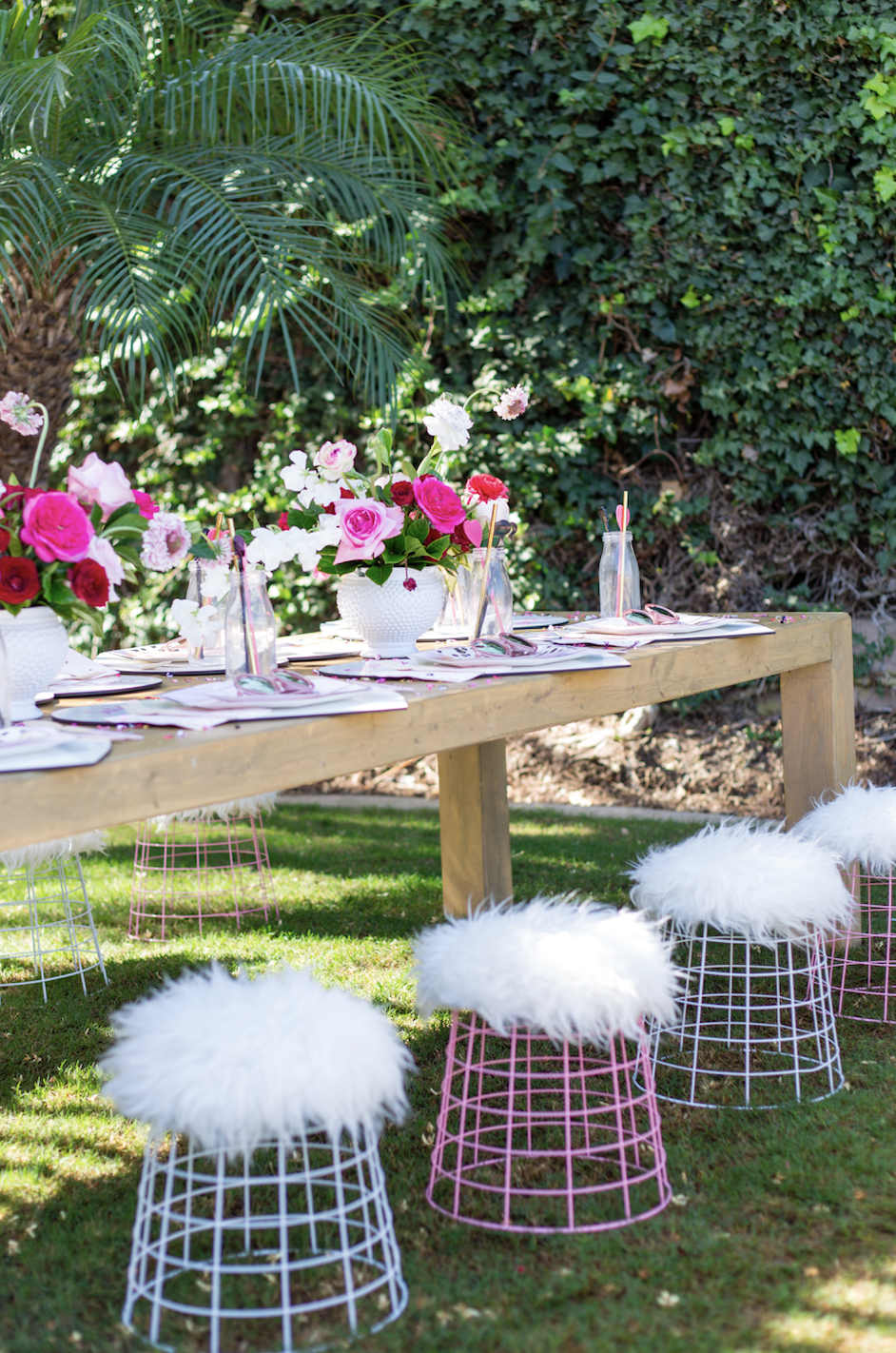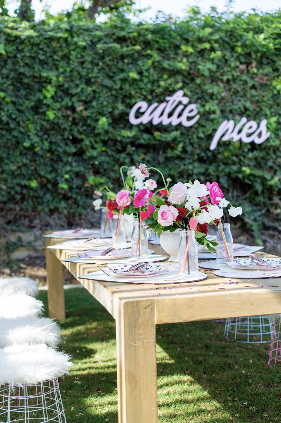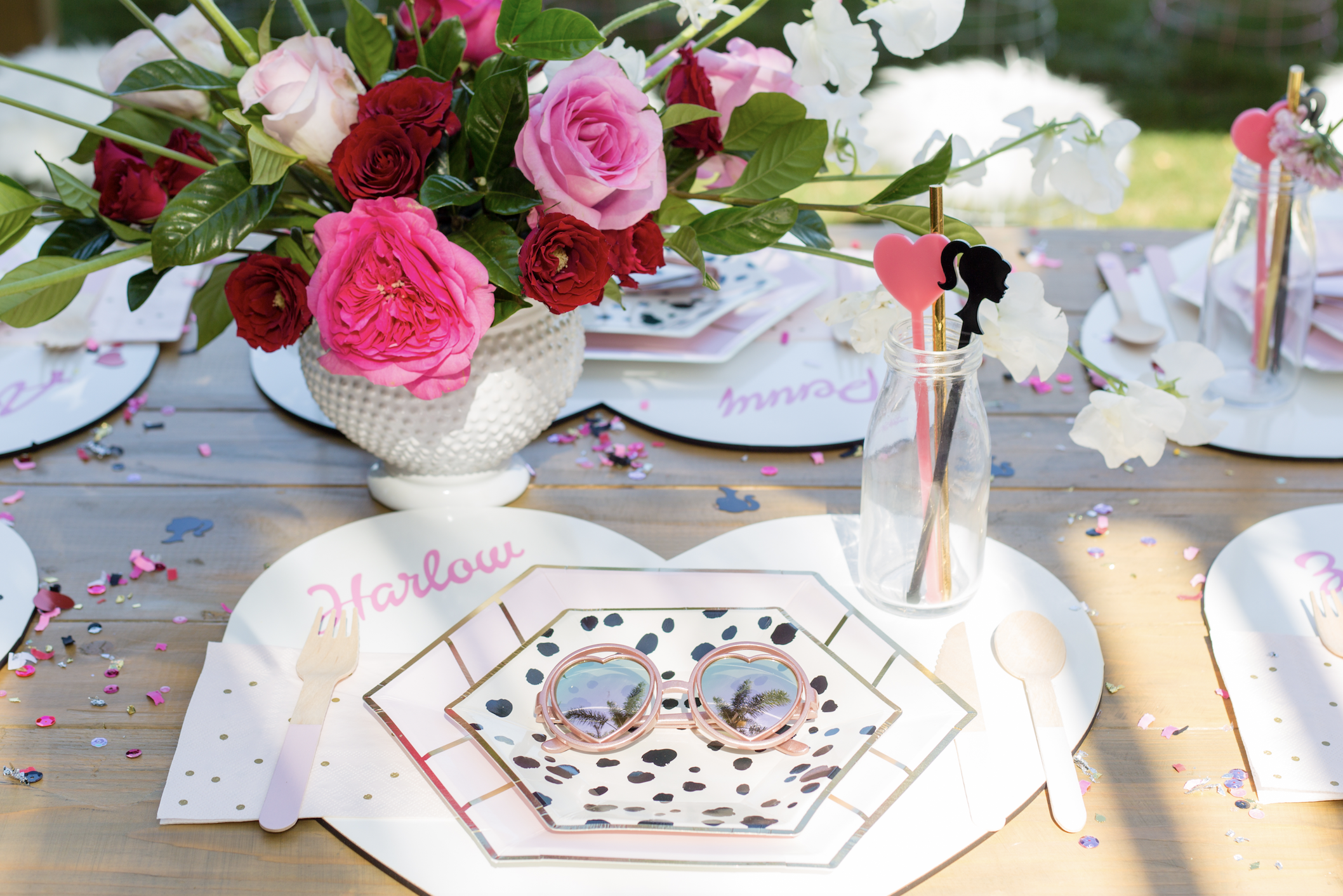 To begin with, these rentals are just to die for. Teak and Lace has the cutest fur stools, they were truly a must for this one. For the tables we had fun mixing prints and using pink, white, black, and gold with the tableware. Next, Poppy Jack Shop created the cutest heart placemats with each little one’s name as a place setting. Along with the most adorable heart and barbie drink stirrers!