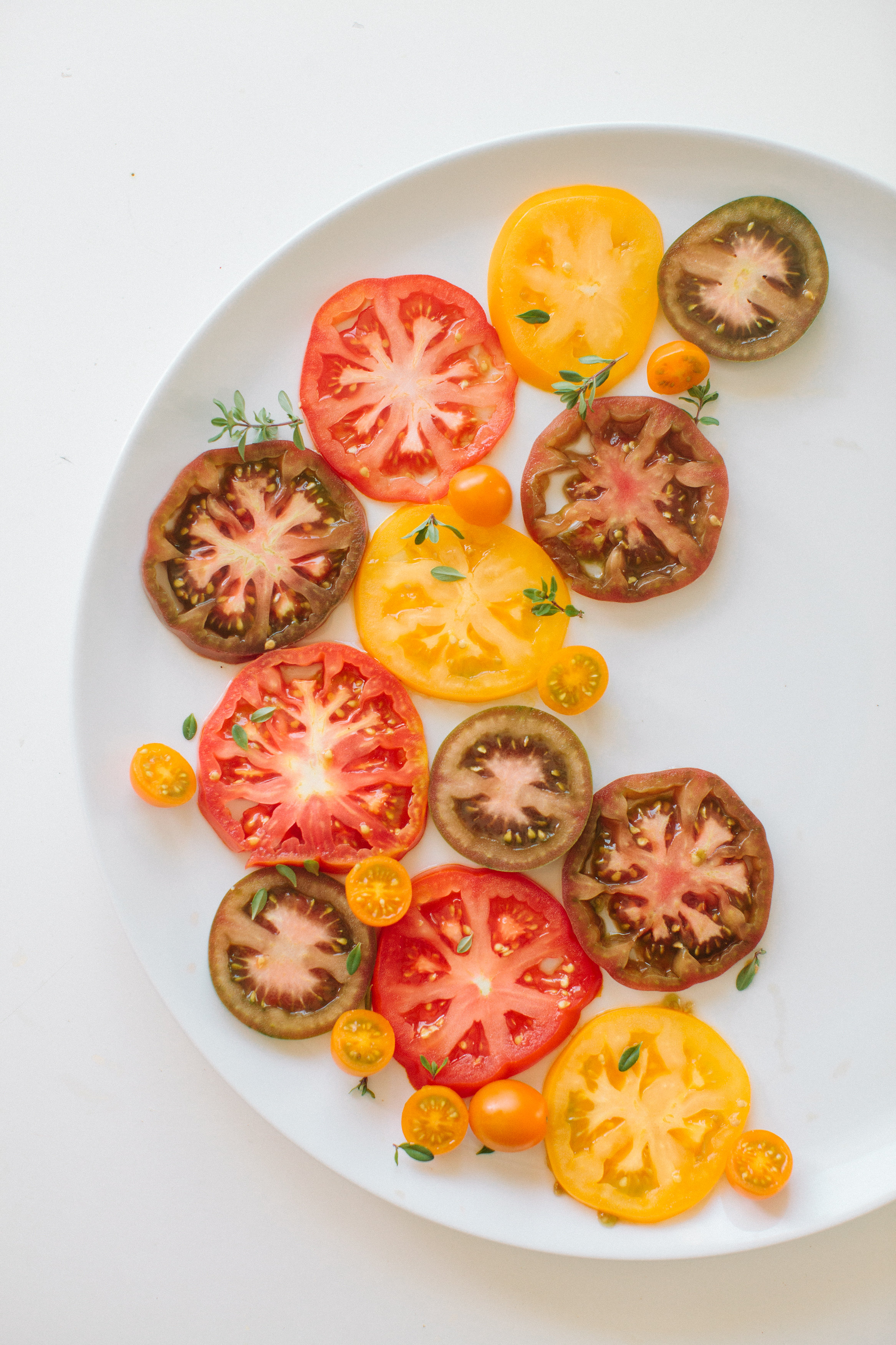 Slice your various colors of heirloom tomatoes and place on top of arugula.