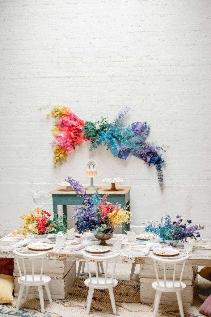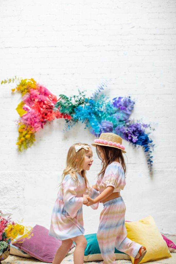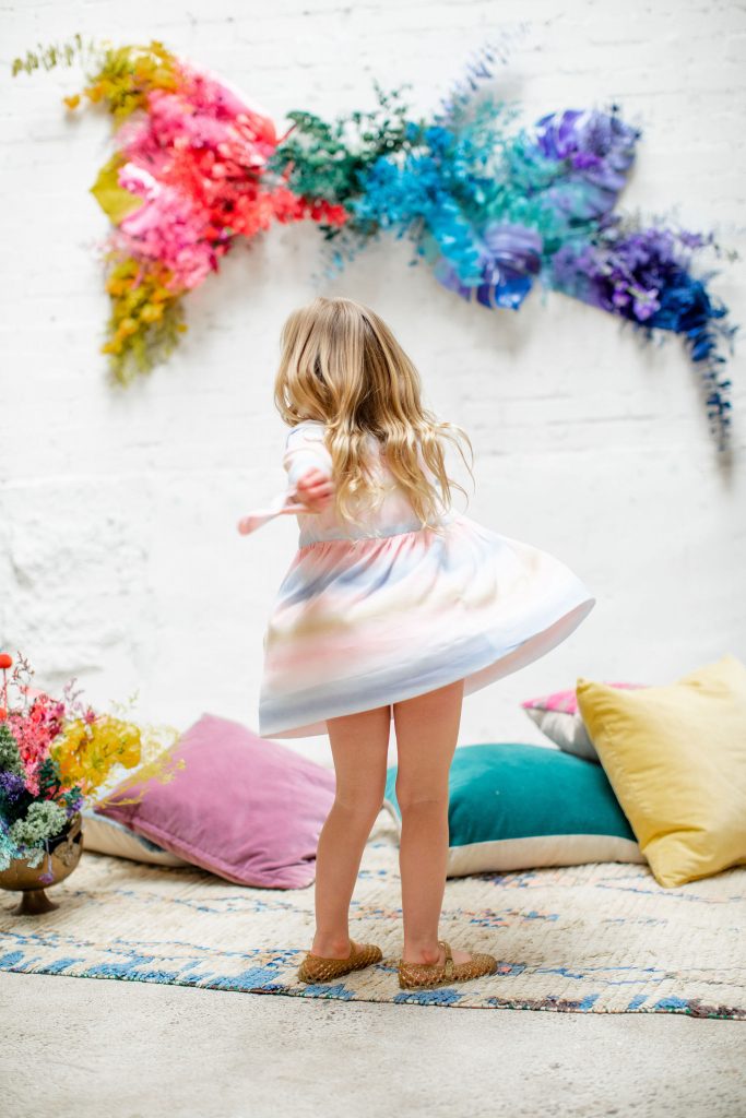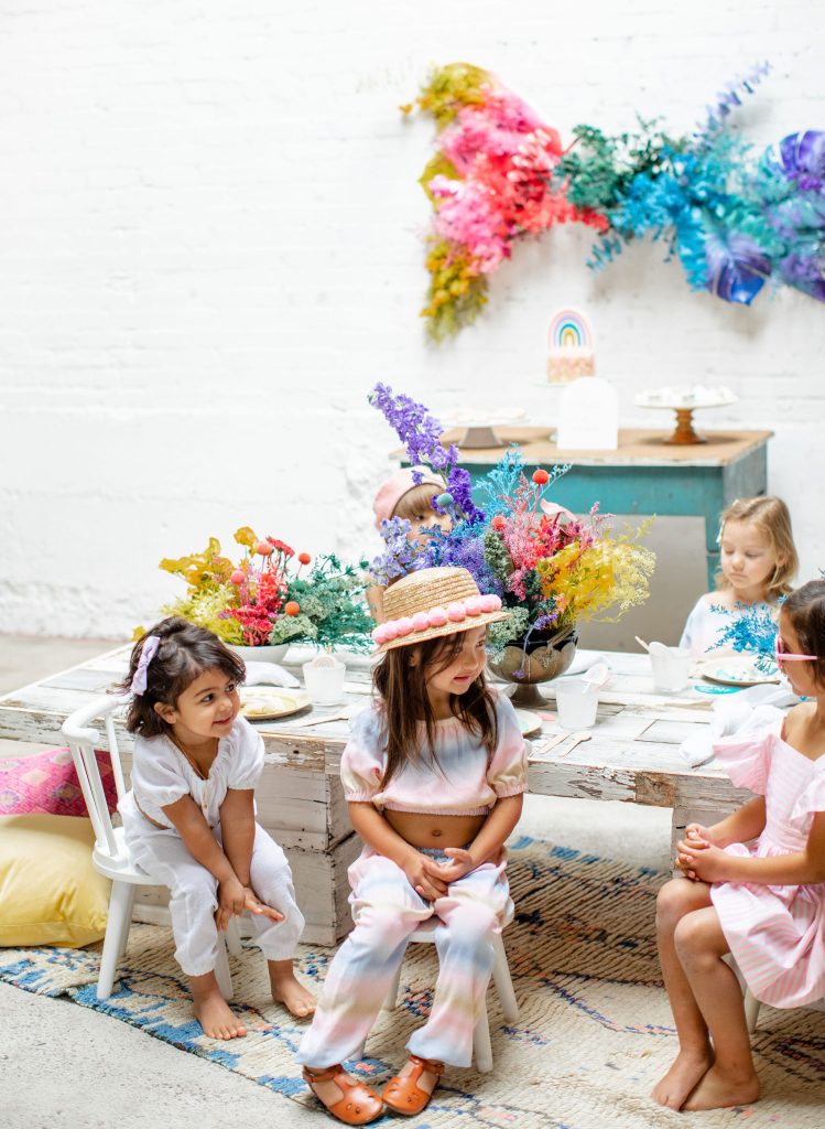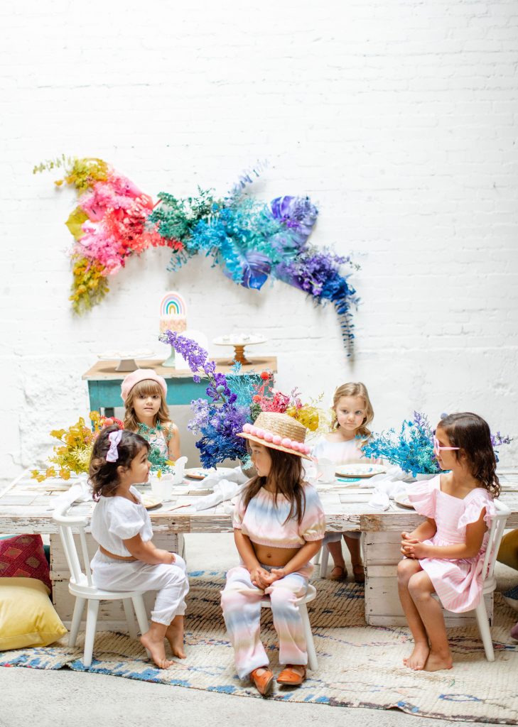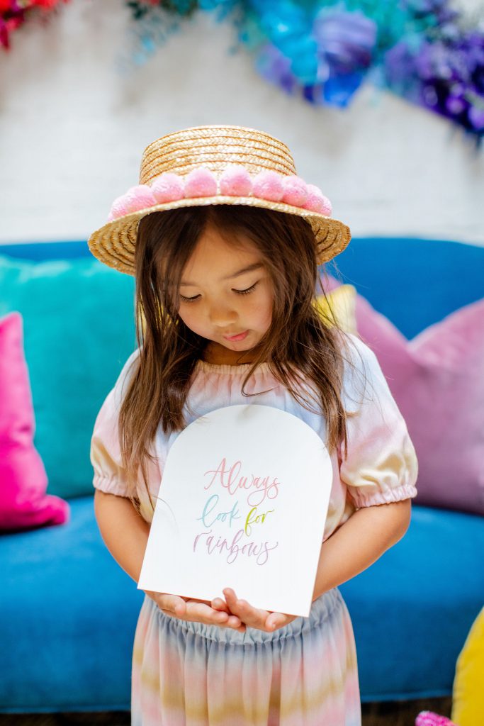 We’ve celebrated women a lot this past week, now it’s time to celebrate our minis!!! The little ladies need some parties too, and this one is perfect for Spring or a little rainbow version of St. Patrick’s Day! I always love a good rainbow-themed party, we did a few last year here, here, and here! But this one comes with more vibrant tones which I love. Plus, I can’t get enough of that beautiful wall piece by Sprig & Spring and the adorable outfits from Wild &. Rae. Keep scrolling to see more!!