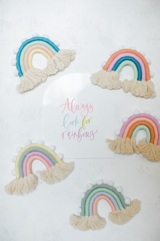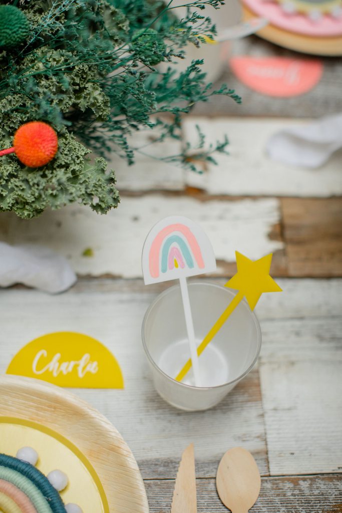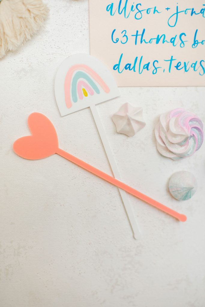 My favorite part of these place settings has to be those super cute macrame rainbows by The Neutral Knot. They actually are what inspired me to do this shoot! Nicole, who makes these beauties, is such a sweetheart and a former Beijos Bride! And of course, The Proper Letter’s place cards and stir sticks complete the cuteness, don’t you think?!