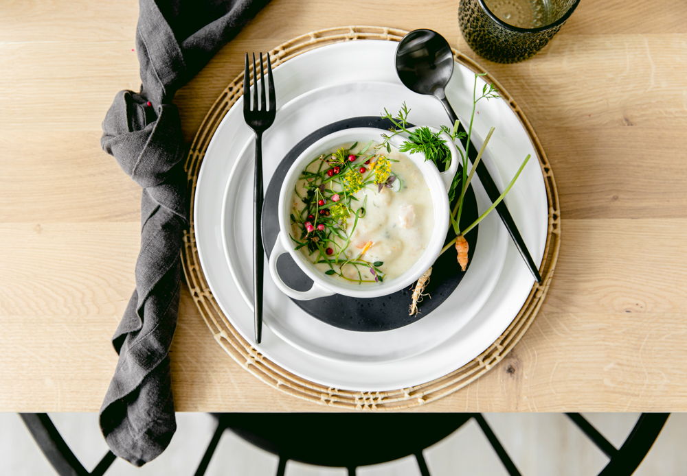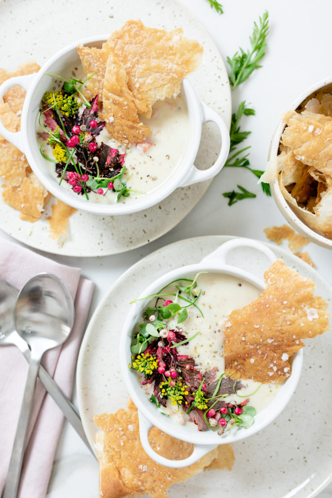 One last step! Throw in your shredded turkey, and give it a good stir. Let everyone hang out for a bit, and season with salt and pepper if you need too! The timing should be around 5 minutes or serve. Then its time to serve it up! Serve with fresh herbs and the puff pastry crackers you made ahead of time!