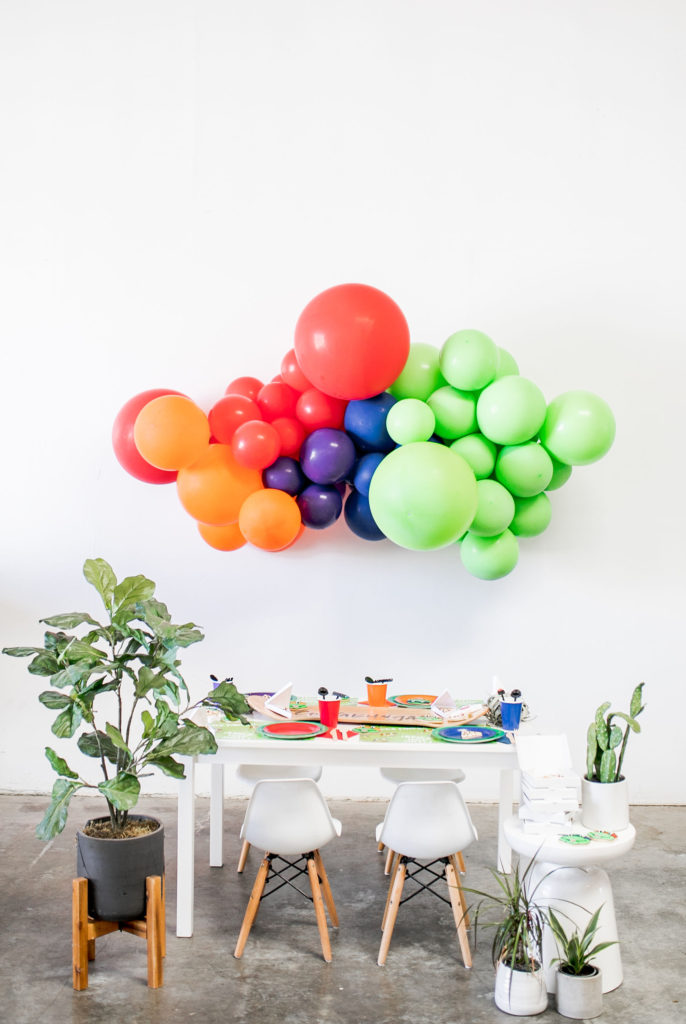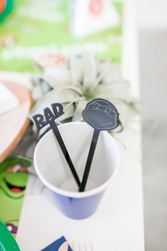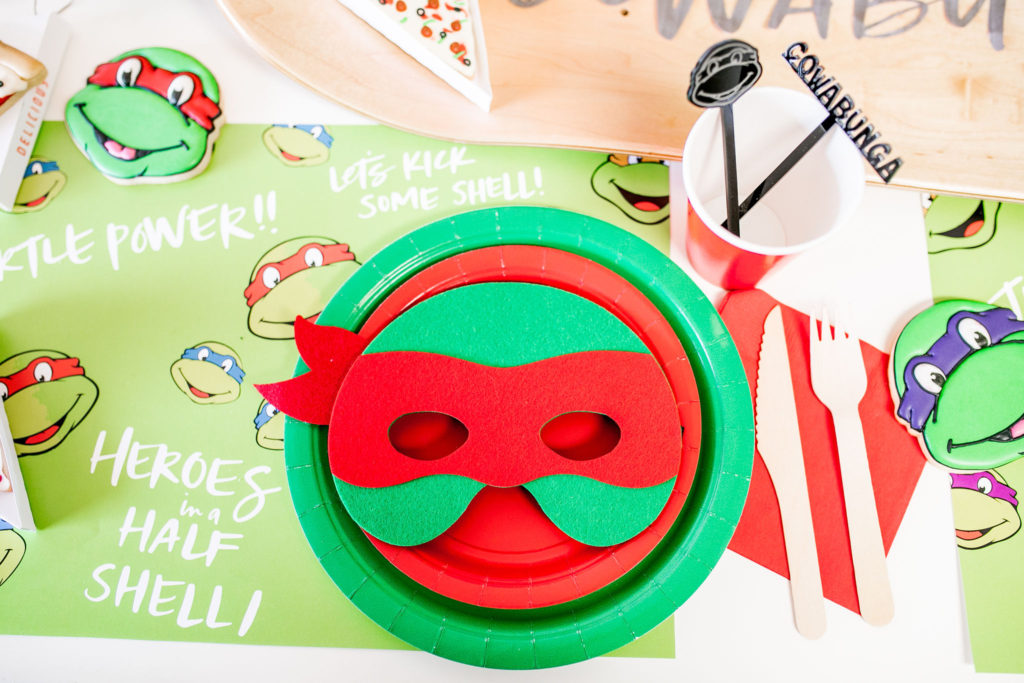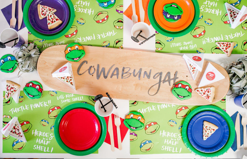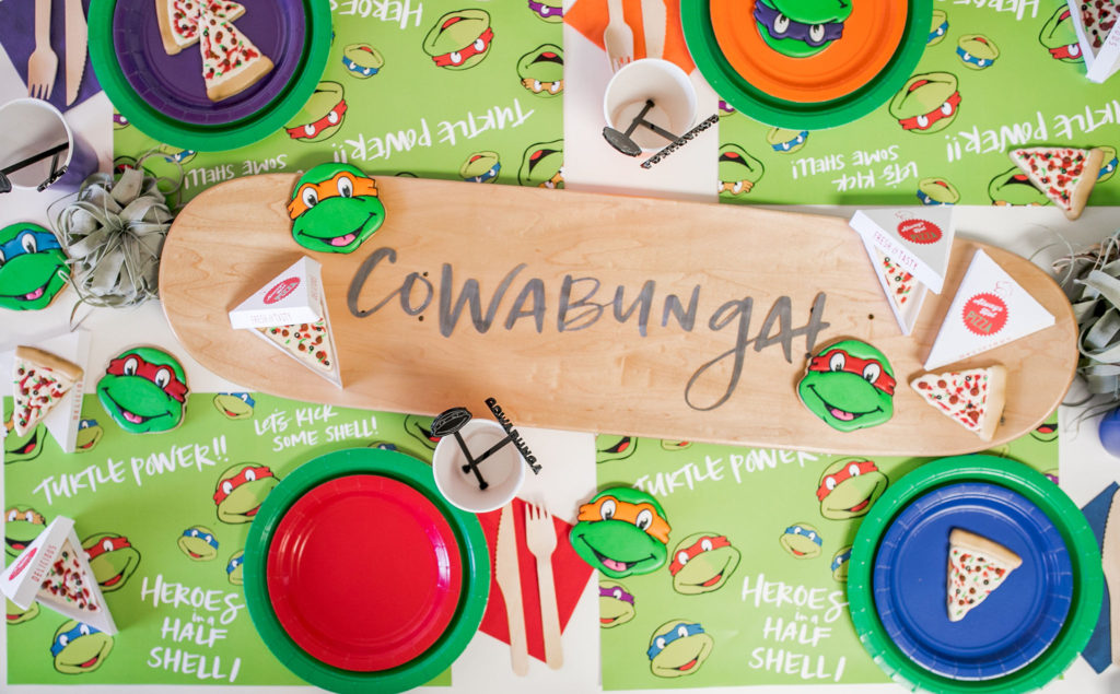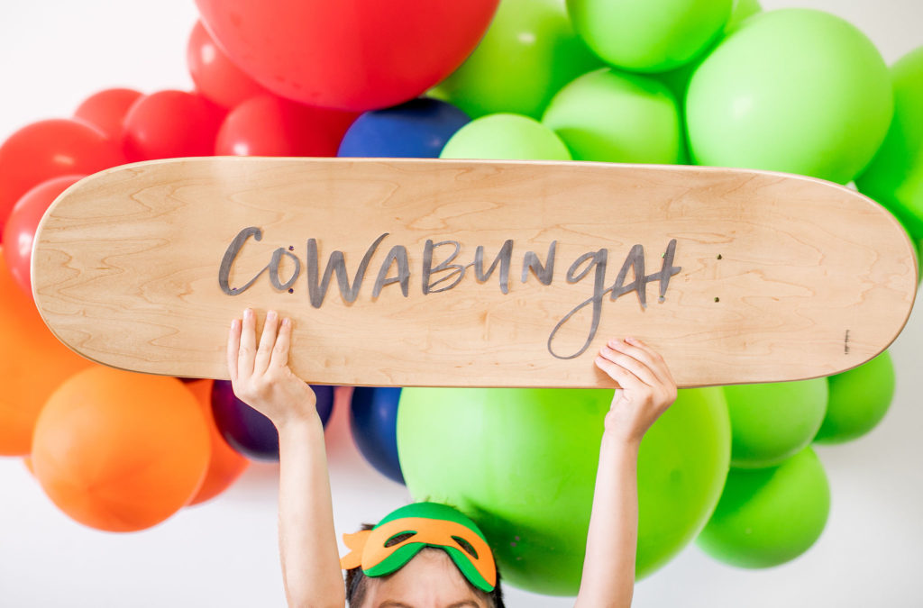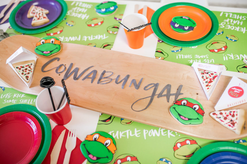 Cowabunga!! The boys went nuts for this fun table! I love all the color – not our usual color scheme but it’s all for the TMNT!! I got the skateboard deck here, such a great idea for a signage piece, right?! And you can use it again in their bedroom, I plan to!