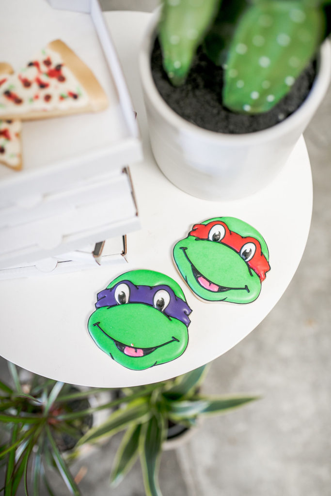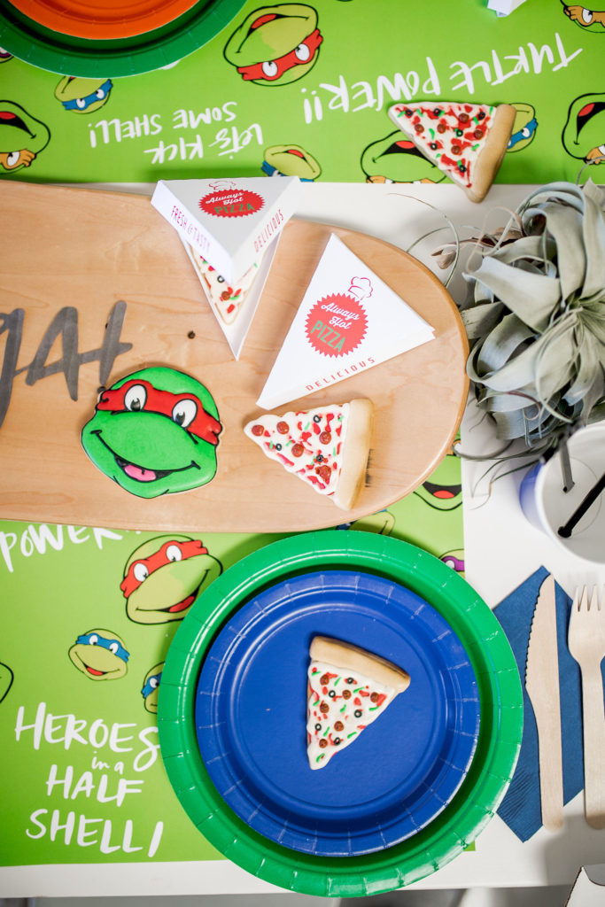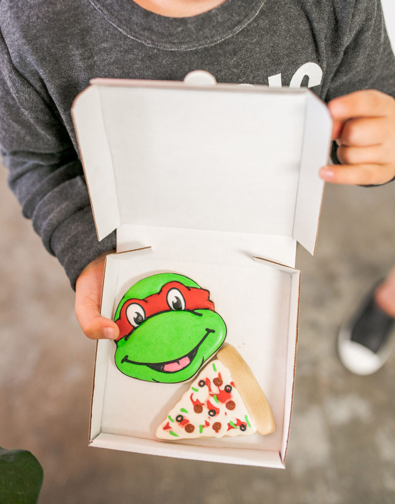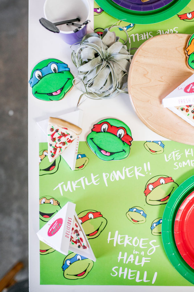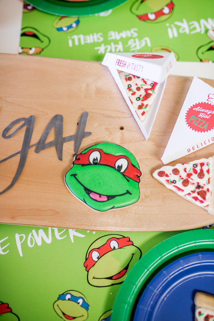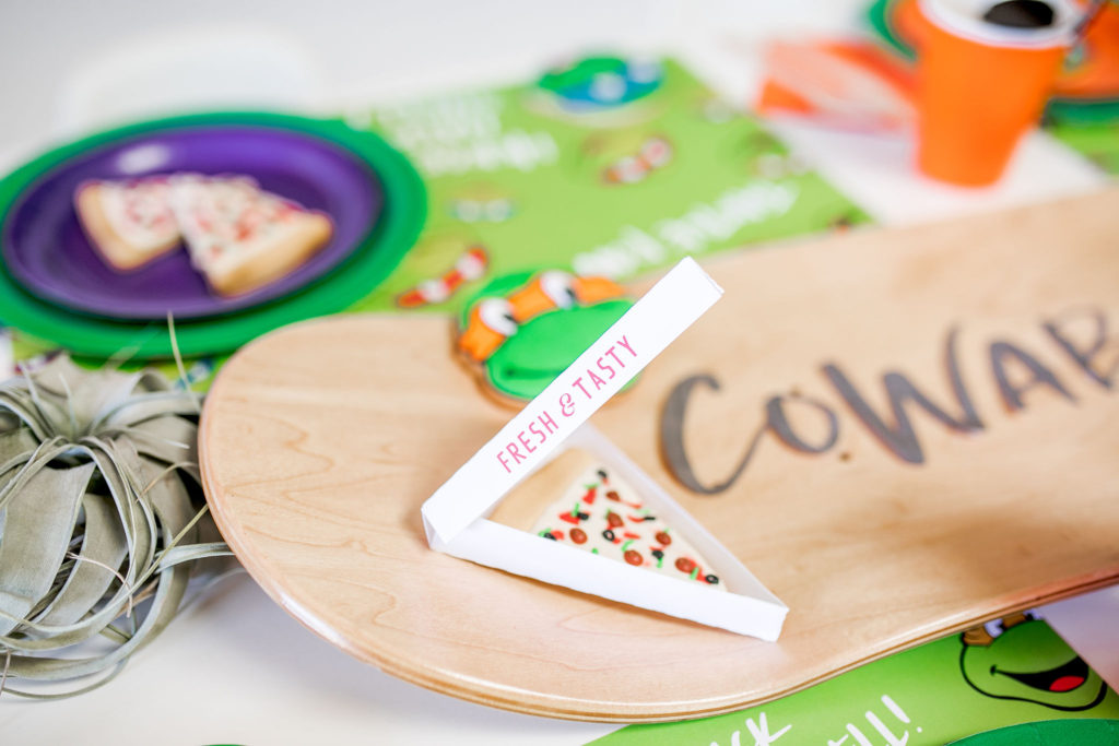 All of the plates, napkins and cups are from our friends at Oh Happy Day, while the cute placemats are again by Meghann Miniello! The stars of the show are the cute cookies by Alicia Long. She went above and beyond with Raphael, Donatello, Leonardo and (my boys favorite) Michelangelo cookies plus pizza cookies!! We had to have the turtles favorite food! She even made custom mini pizza boxes for them, how cute!!!
