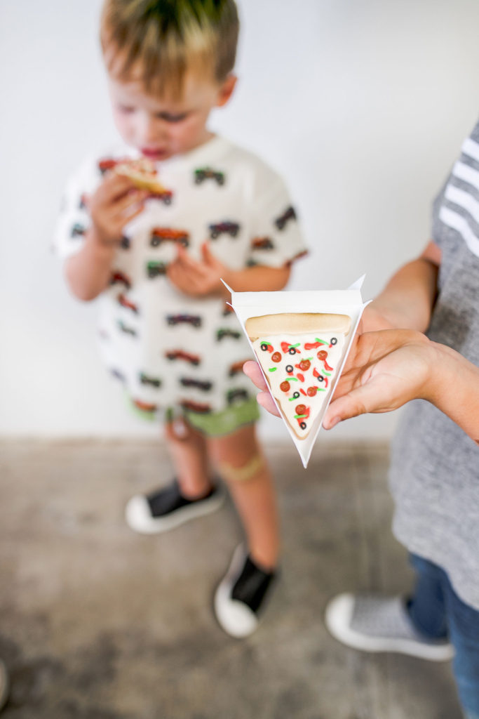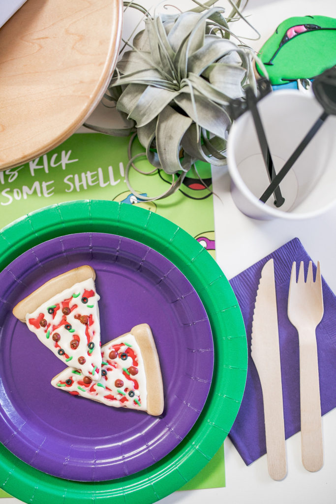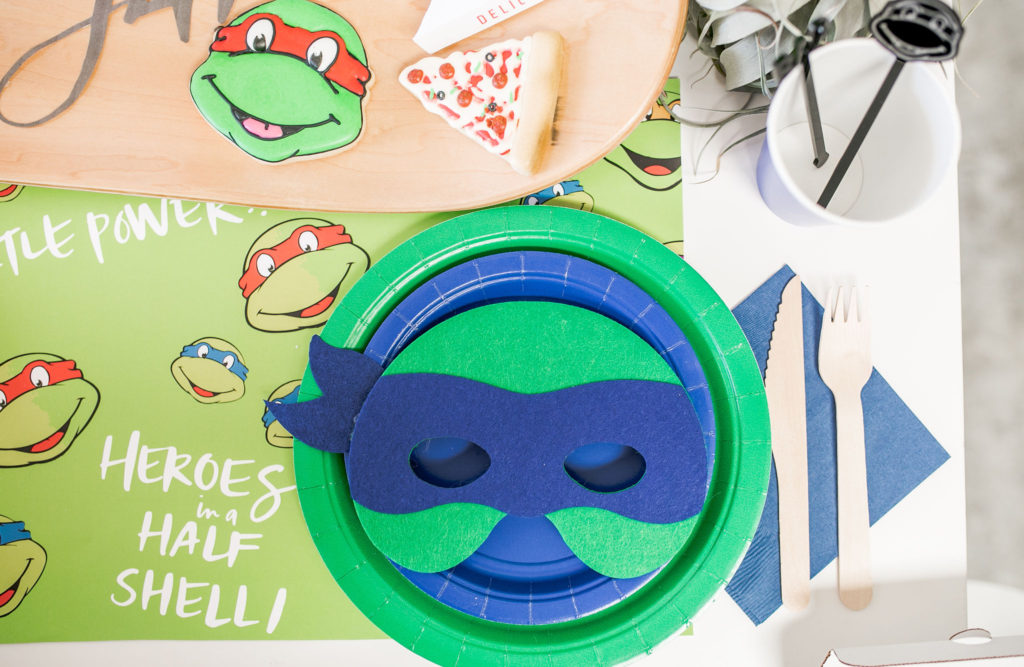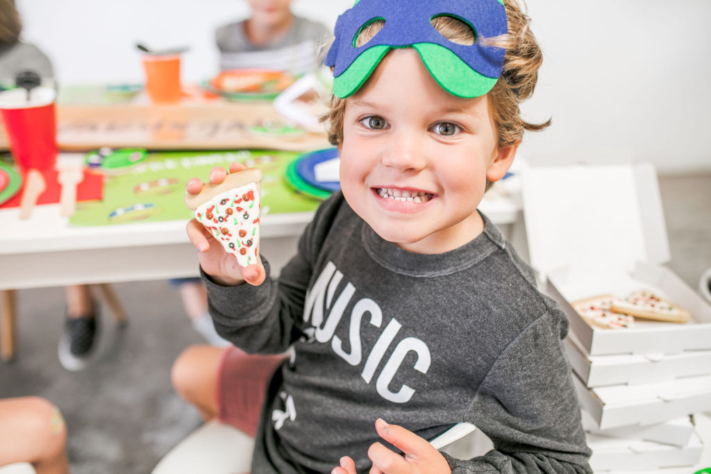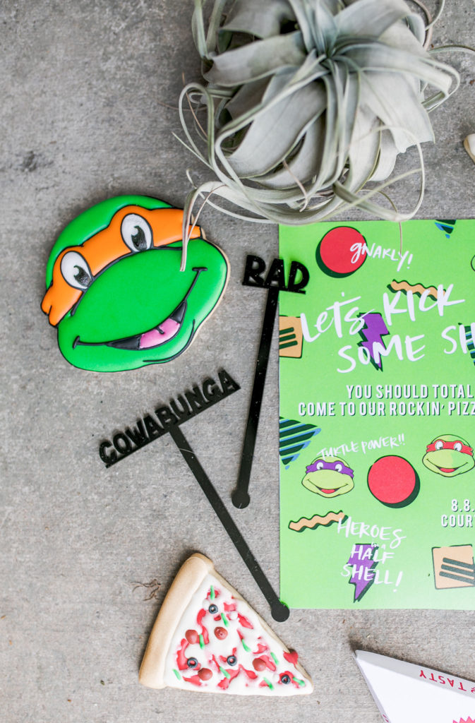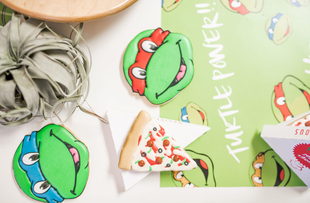 All of the plates, napkins and cups are from our friends at Oh Happy Day, while the cute placemats are again by Meghann Miniello! The stars of the show are the cute cookies by Alicia Long. She went above and beyond with Raphael, Donatello, Leonardo and (my boys favorite) Michelangelo cookies plus pizza cookies!! We had to have the turtles favorite food! She even made custom mini pizza boxes for them, how cute!!!