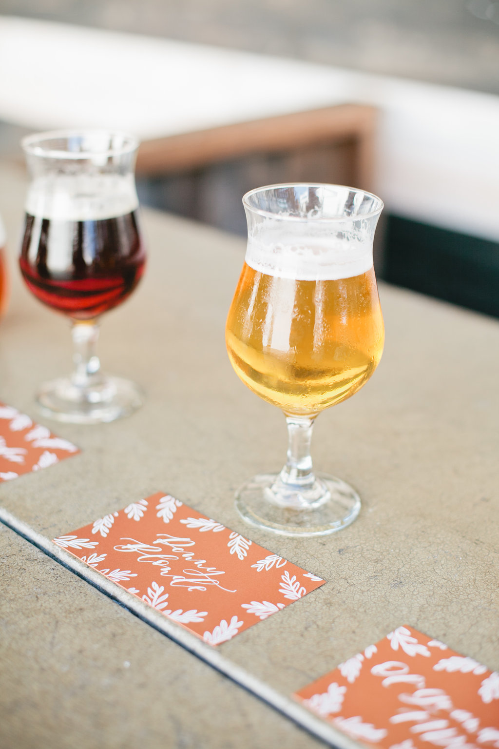 We were all pretty excited, some of us frequent breweries and some of us had never been…imagine that!! So the seasoned few taught us a few things about why craft beer is so special and some of the fun rituals that go with it. Here they are lined up all pretty with their name tags of course! The difference in glass has to do with the alcohol content, the higher it is graduates it into the glass with no stem.