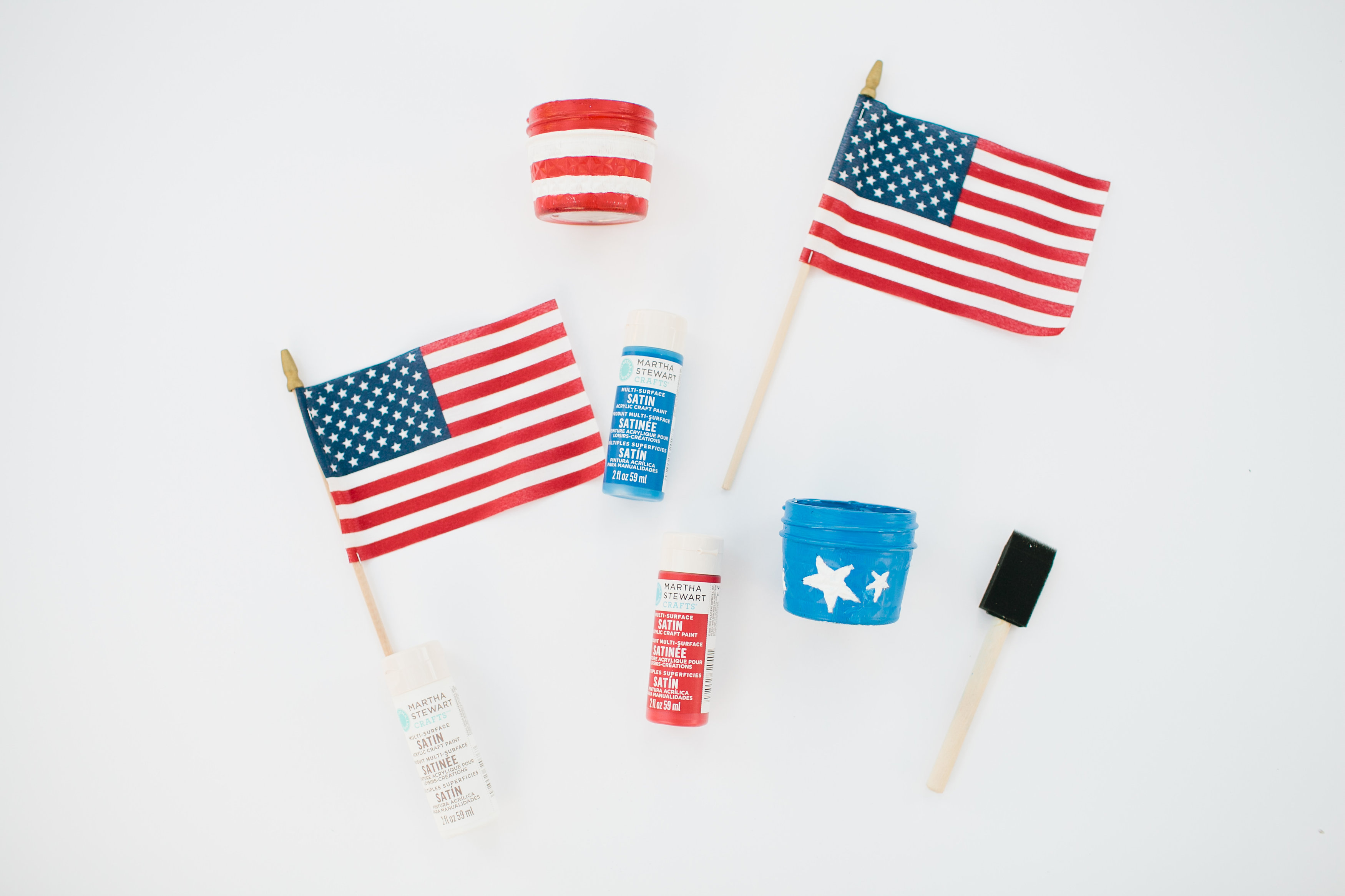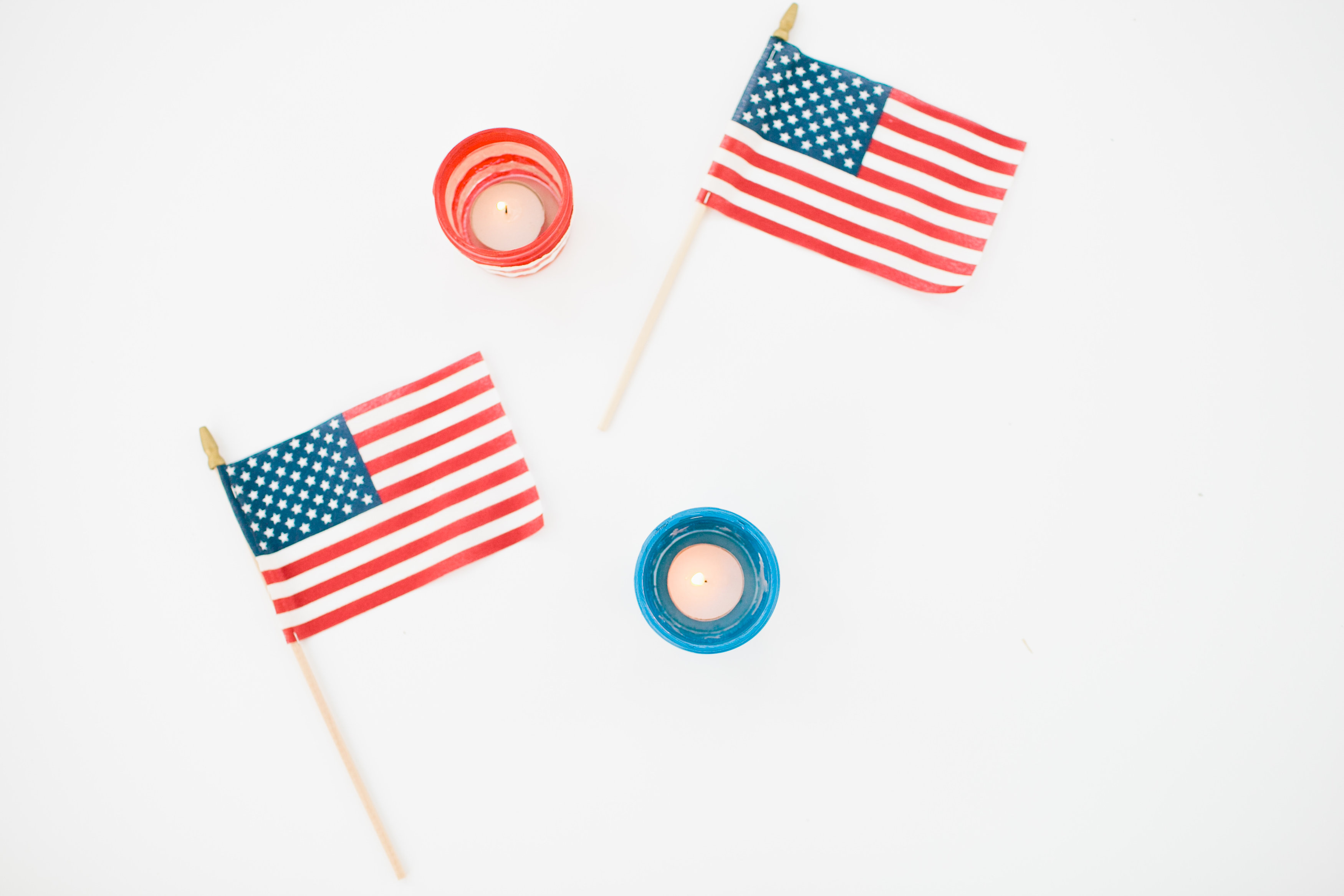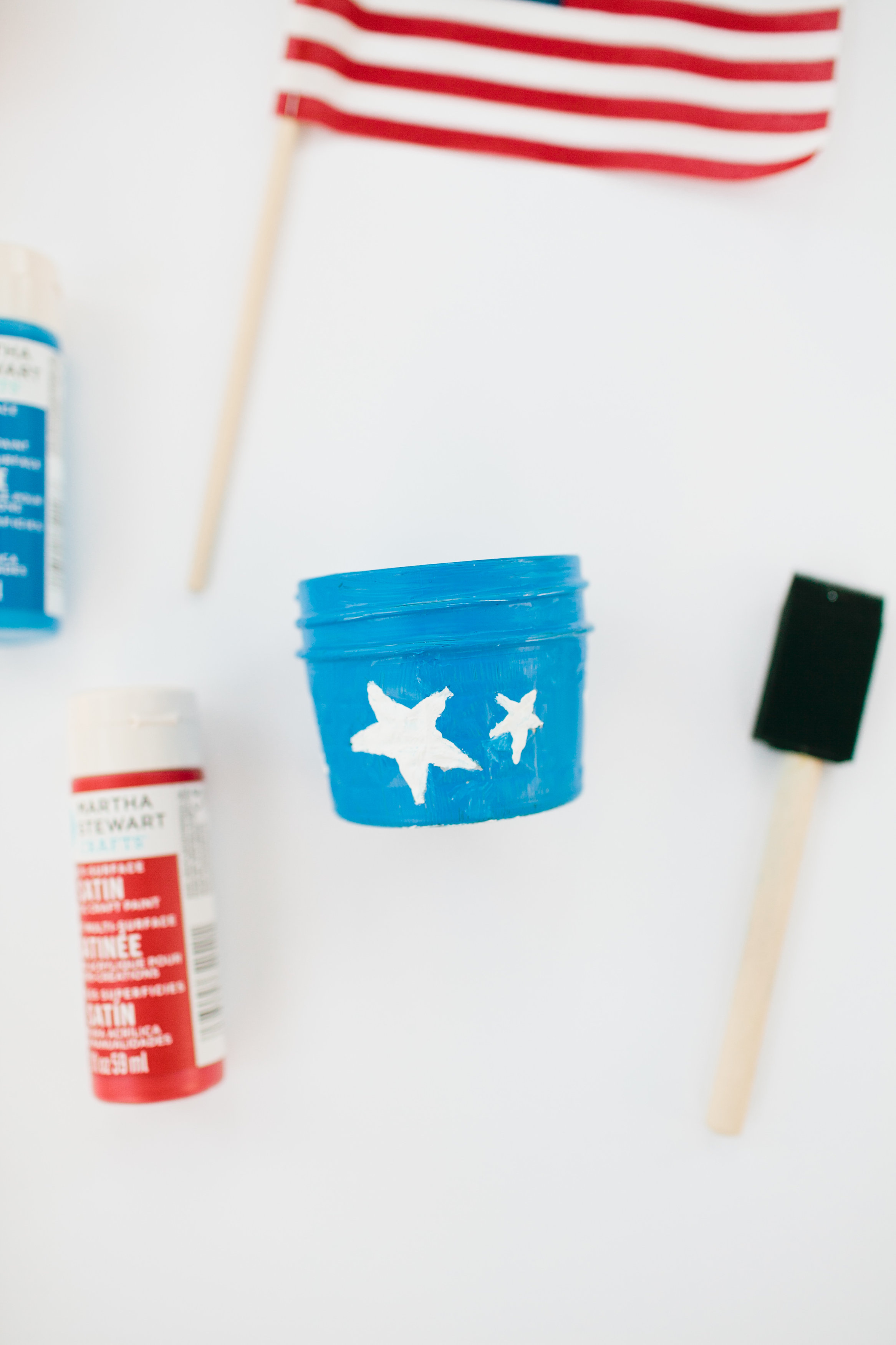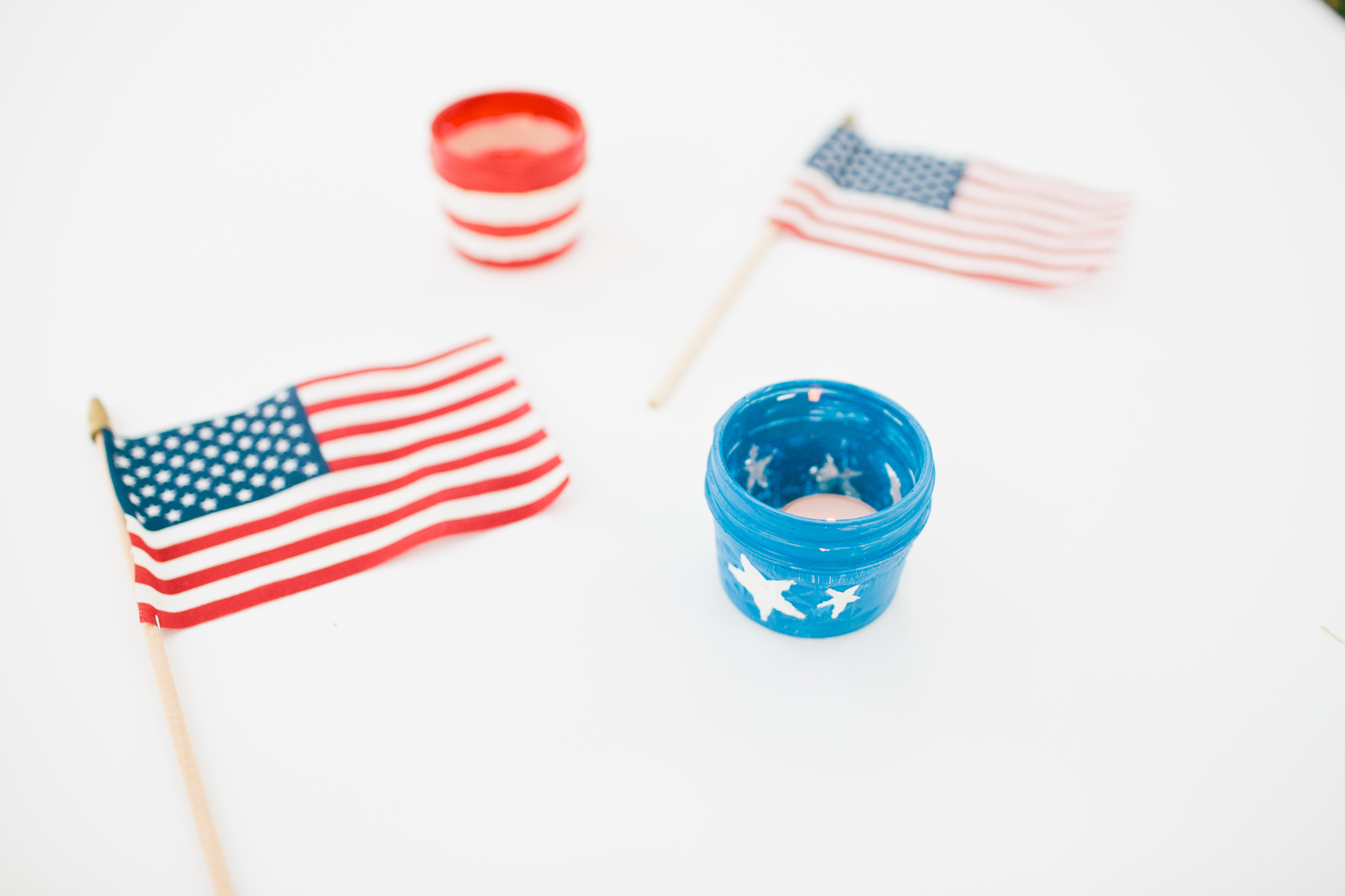 First we drew stars on painters tape and cut out the shapes for the blue votives. Then painted the jar blue with the taped stars on. Once the paint dried, we peeled off the taped starts and painted the shape white. With the red and white stripe votive we lined the painters tape for each color.