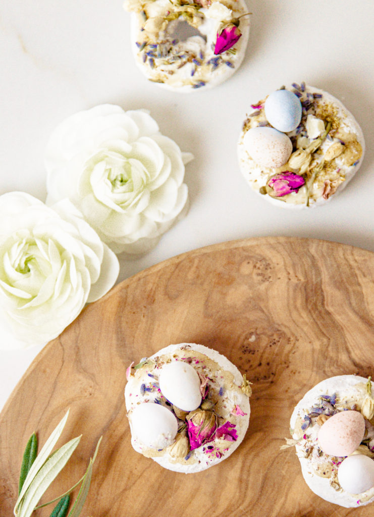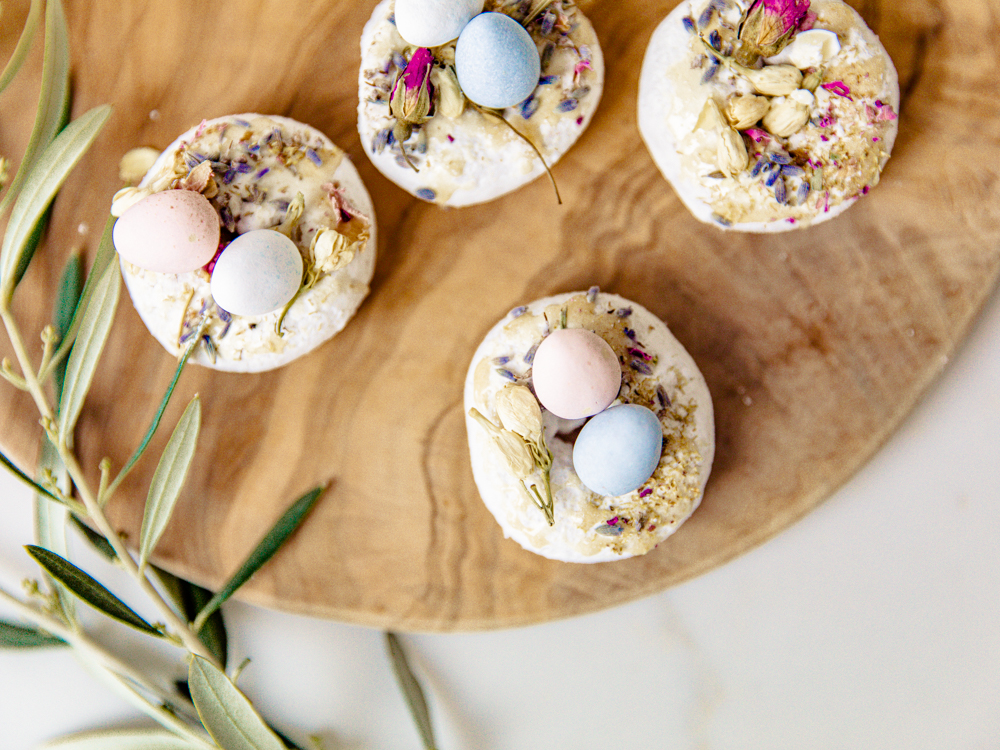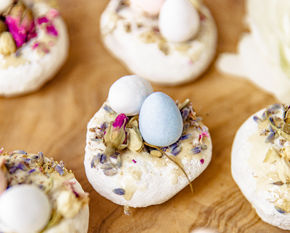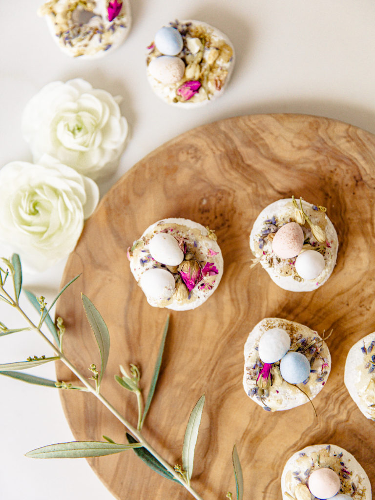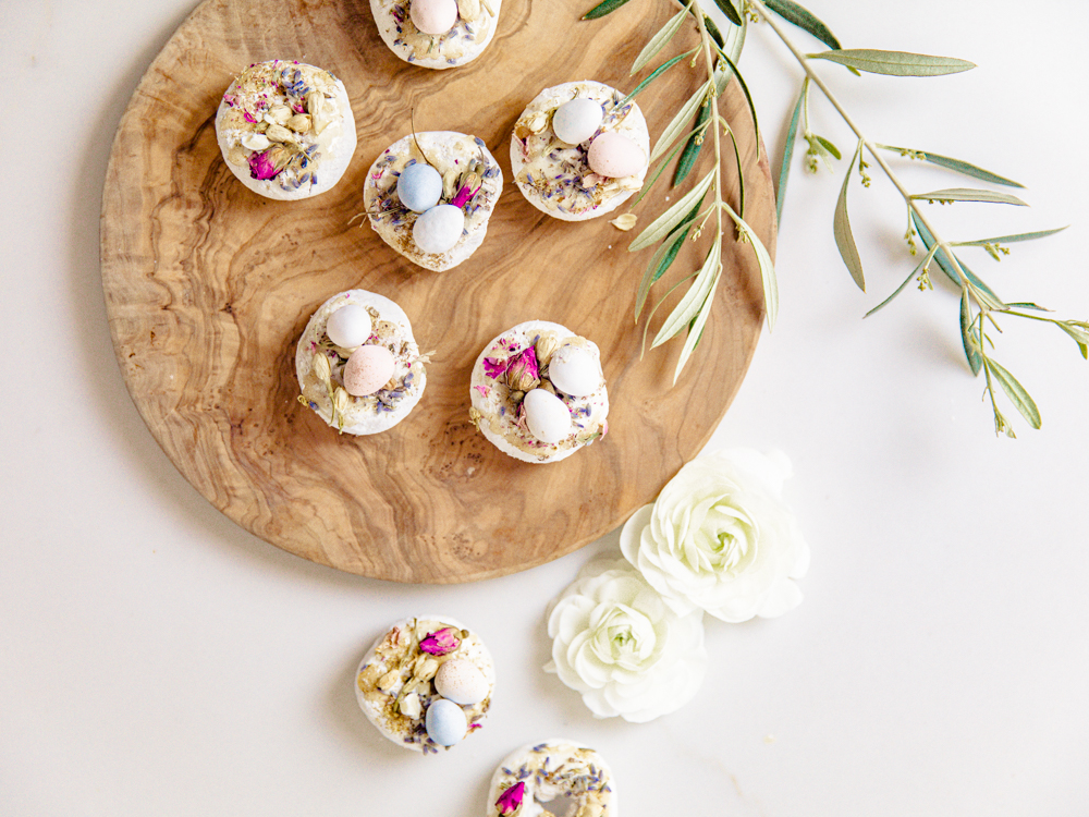 A little trick, I used a little bit of honey on top for a sweet touch; it also helps to keep the dried florals and chocolate eggs on top of the donut. Sprinkle some edible flowers on top for a fun and delicate touch! You can omit this section for the kids. Then place a couple of robin’s eggs on top of the donut. I let them sit a bit so they would stick to the donut. These little guys lasted maybe 6 minutes in my house.