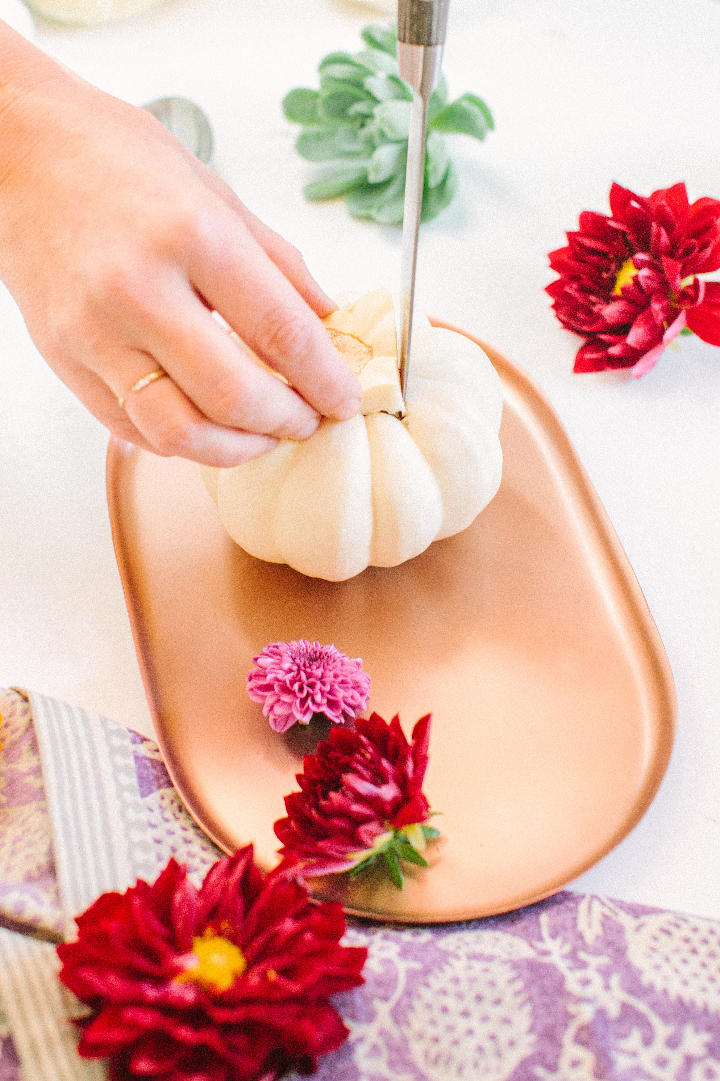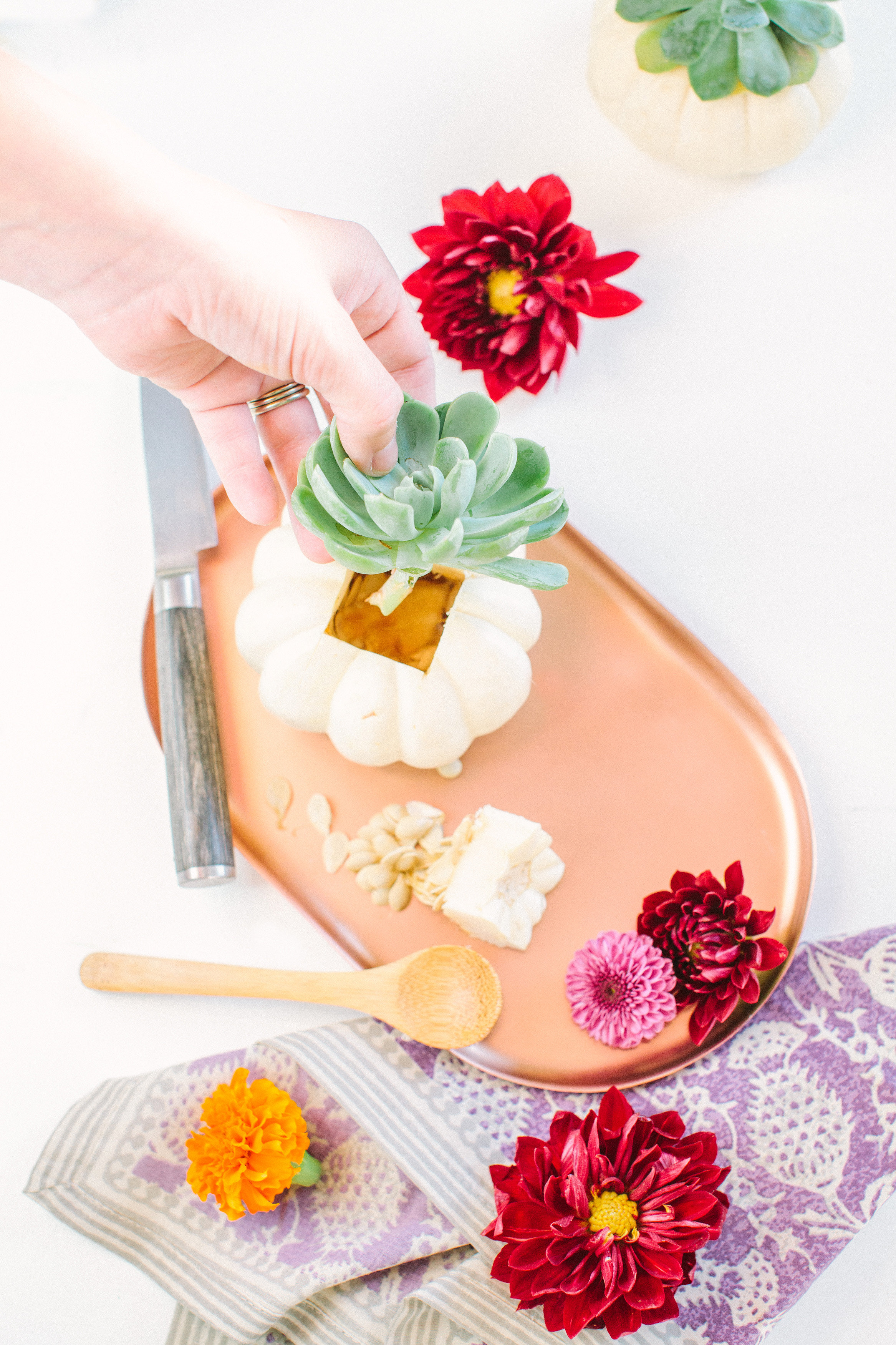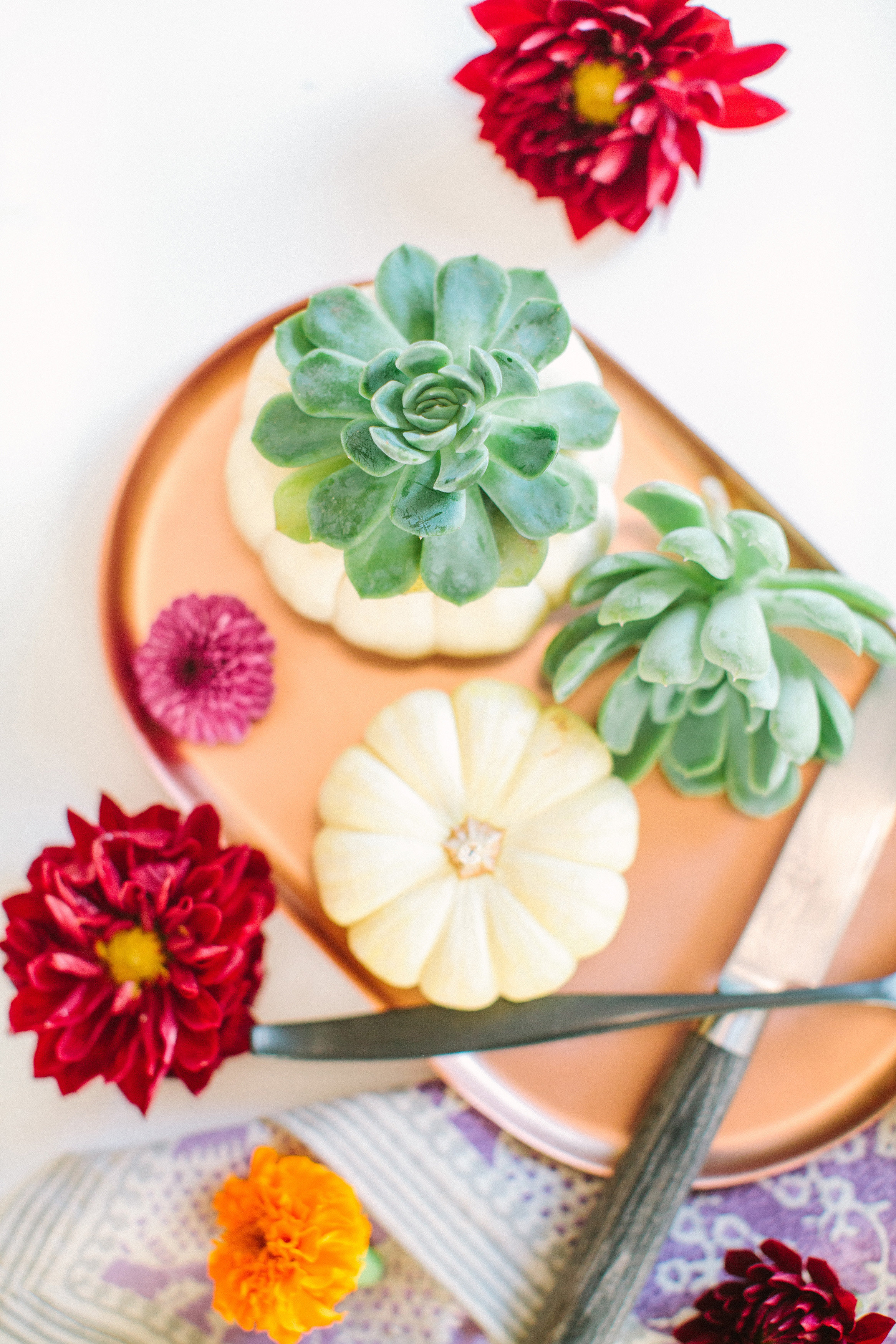 A fall DIY that is sure to be loved by everyone. Not only is it easy to do but its a pretty modern twist on a classic idea! You can be creative as you want! We went with a simple planter for our tablescape, but feel free to get a bigger pumpkin and fill it with various types of succulents to achieve a full succulent planter. This would be perfect for centerpiece for your table or decoration piece around your home.