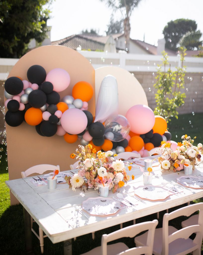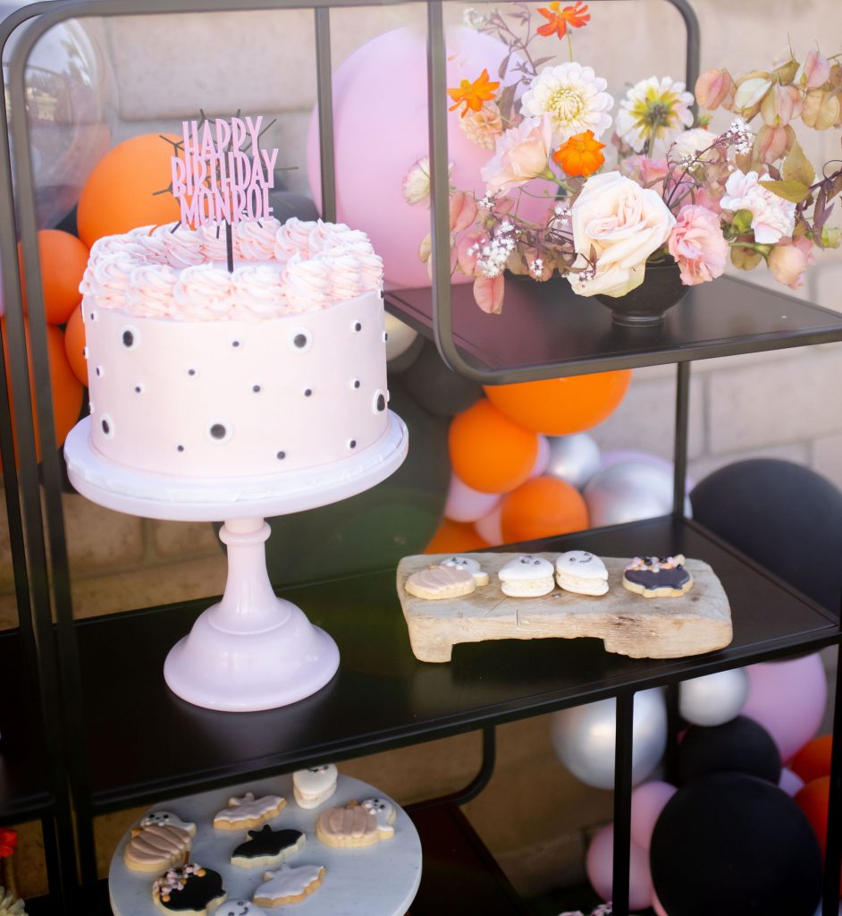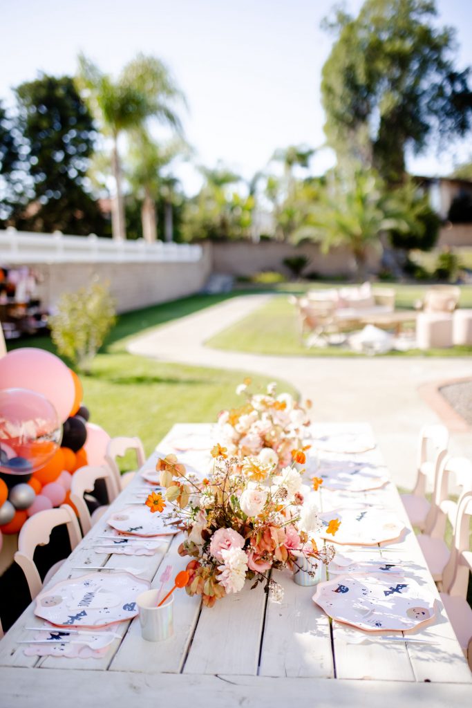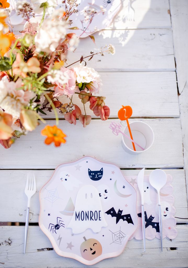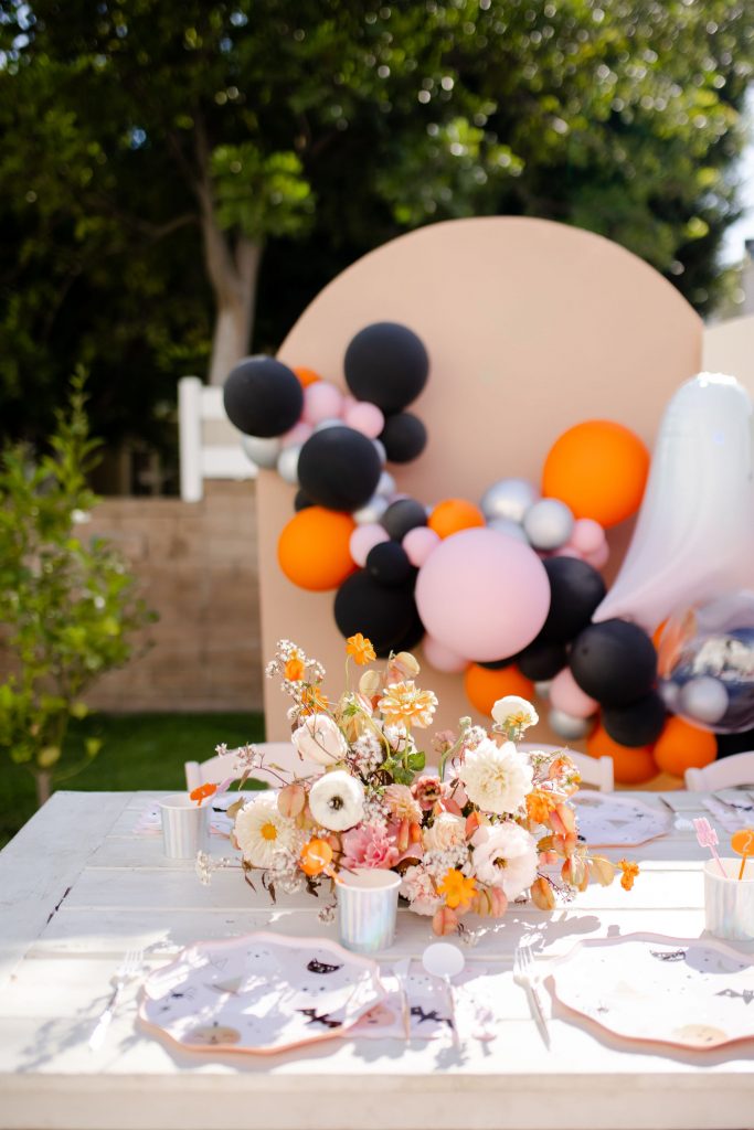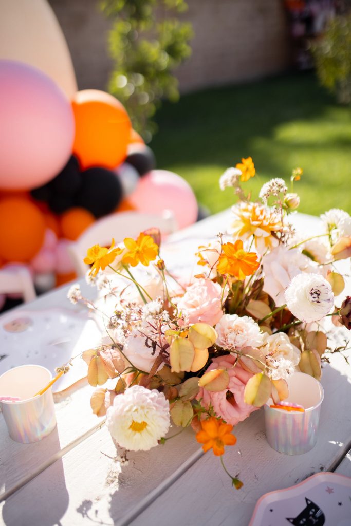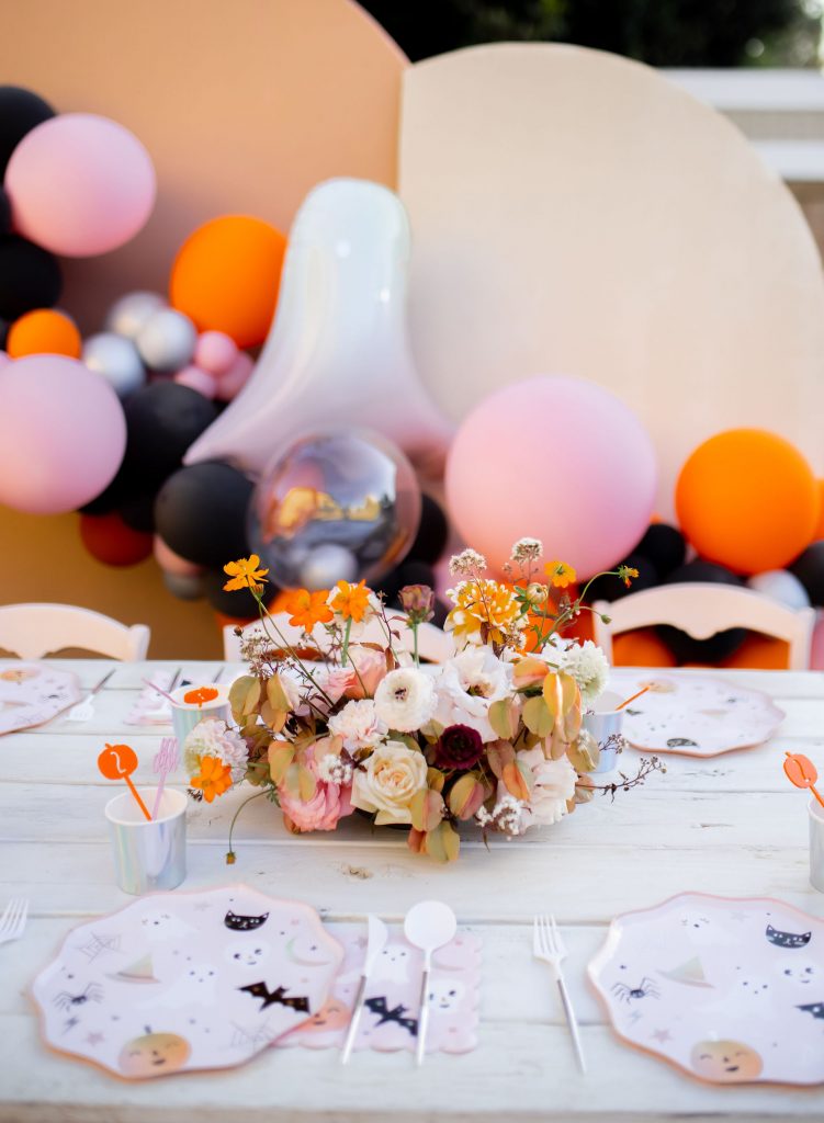 Our adorable little table was set with the cutest pink chairs from Sweet Salvage Rentals. Why is everything miniature so much cuter?! The Pop Shop brought the perfect backdrop and decked it out with more balloons! We set the table with Meri Meri’s newest pink Halloween collection and Sophistplate’s silver flatware. To make it complete Earth and Grace brought the most beautiful fall florals, gosh I love them so much!
