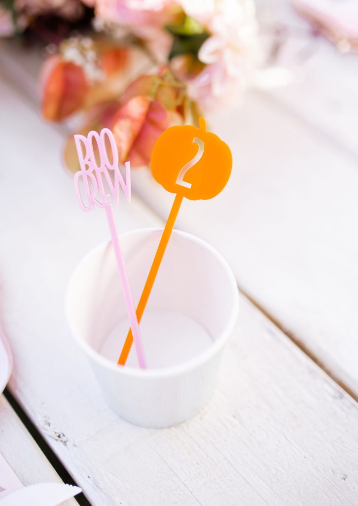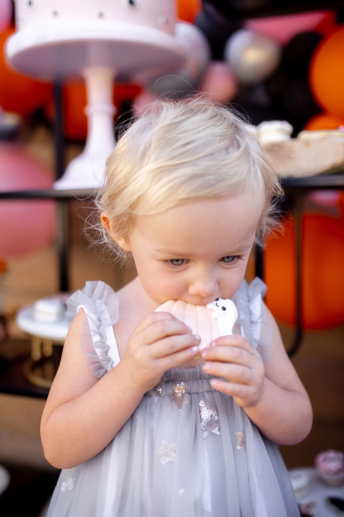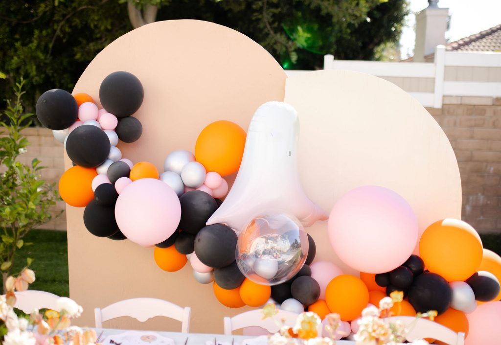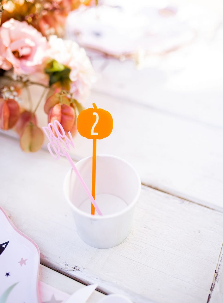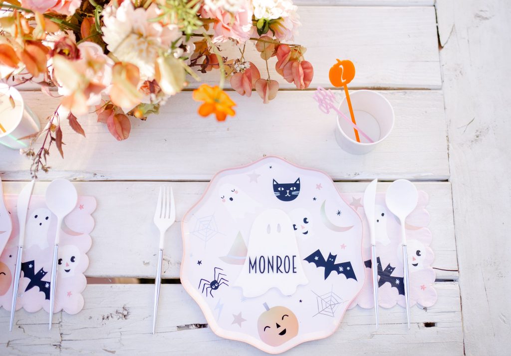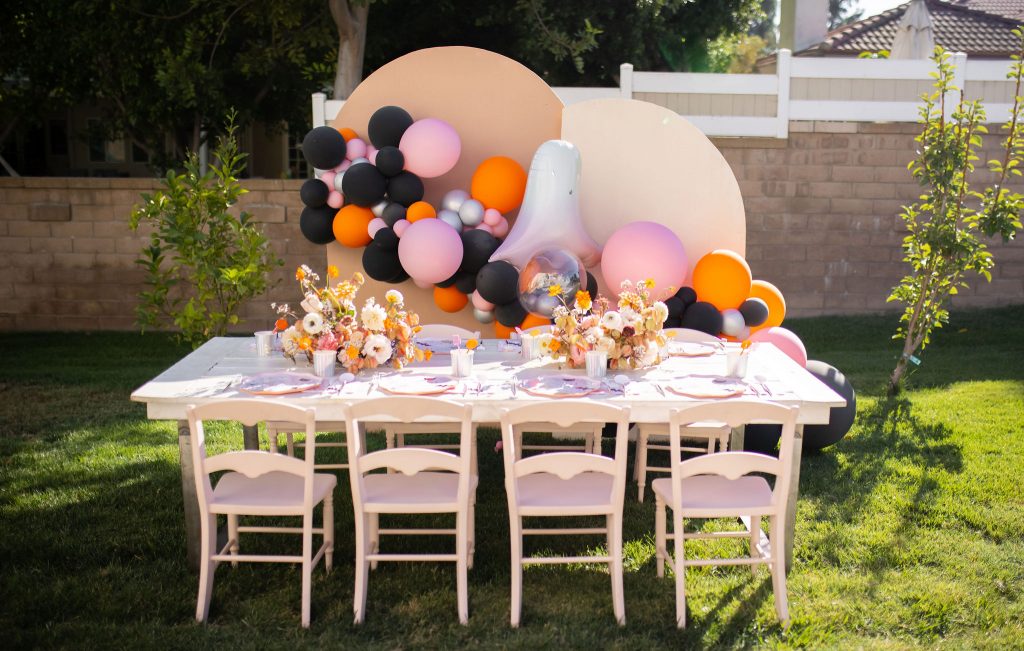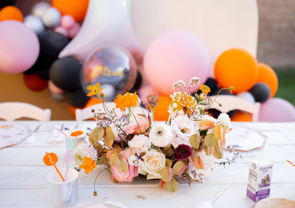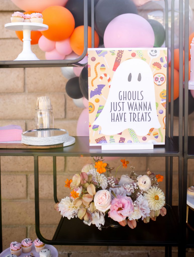 Our adorable little table was set with the cutest pink chairs from Sweet Salvage Rentals. Why is everything miniature so much cuter?! The Pop Shop brought the perfect backdrop and decked it out with more balloons! We set the table with Meri Meri’s newest pink Halloween collection and Sophistplate’s silver flatware. To make it complete Earth and Grace brought the most beautiful fall florals, gosh I love them so much!