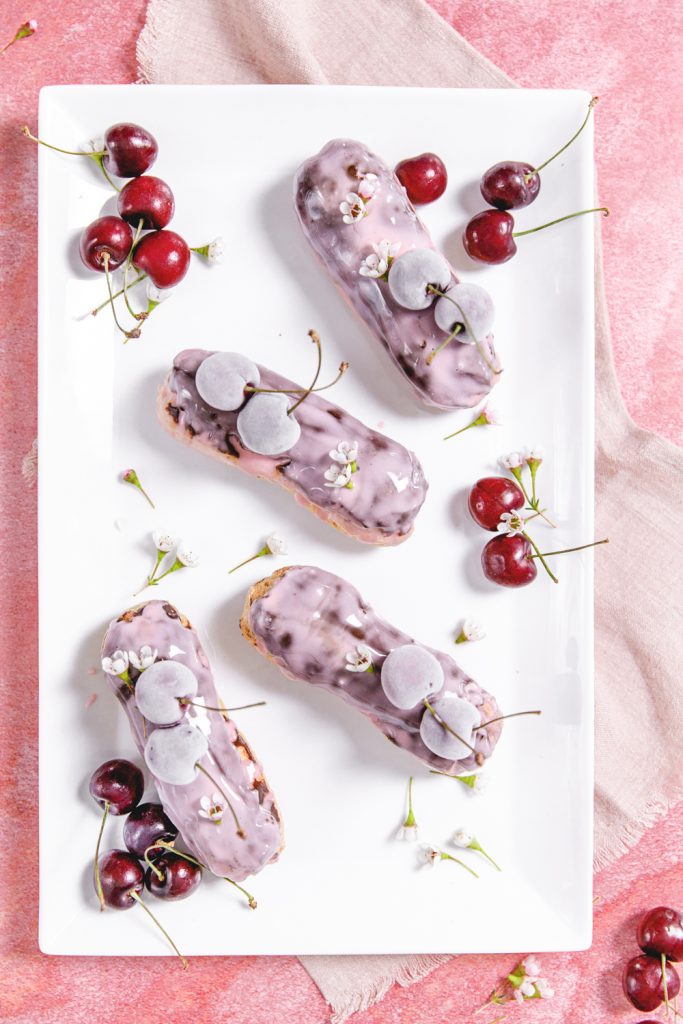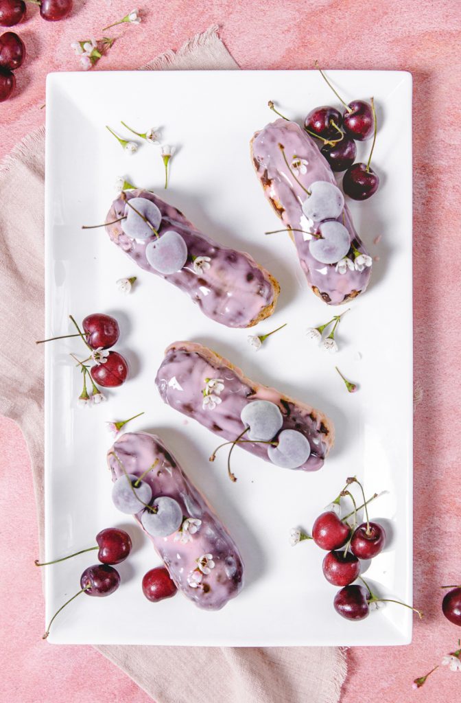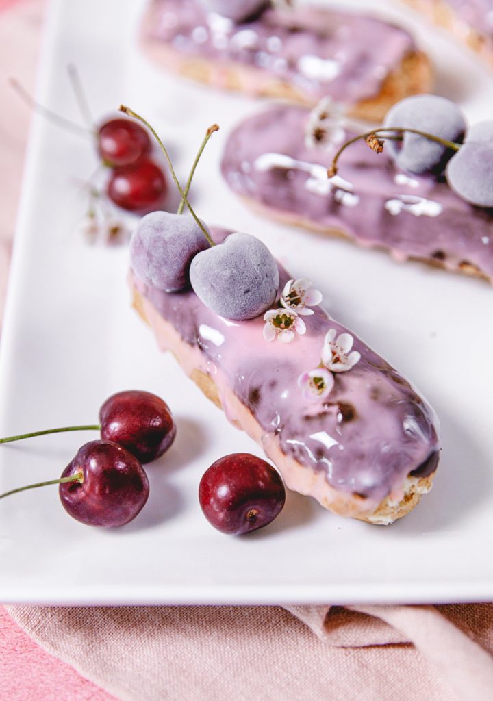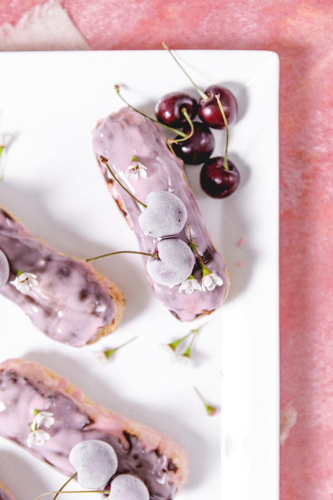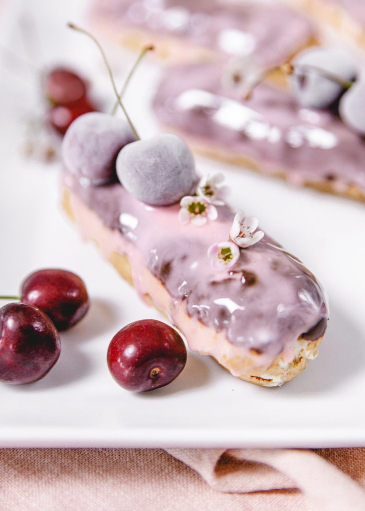 Let’s start with making the cherry glaze. Whisk the glaze ingredients in a medium shallow bowl until smooth. It’s as simple as that!! To glaze the éclair, dip the chocolate side into the glaze and place the glazed side up on a rack to set. Once all glazed, place a couple of cherries on top for a pretty garnish. You can serve immediately, but I like to set it in the freezer to have it all set. Serve up frozen fruit straight out of the freezer is so pretty, can you see that pretty iced look on the cherries?