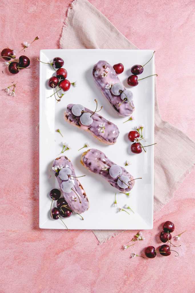 Let’s play a little dress up today in the kitchen. Did you see our fun cherry bomb feature yesterday? So cute! I had to do a little cherry recipe to go with it. With Valentine’s Day around the corner, I wanted to show you how you can take a store-bought item like a chocolate éclair and take it to the next level. There is nothing better than pairing chocolate and cherries. So if you love that combo, then you will love this fun, easy, and pretty dessert to serve to loved ones for the day of love. The sweet cherry glaze is literally the cherry on top. My mouth is watering just thinking about these yummy éclairs.
