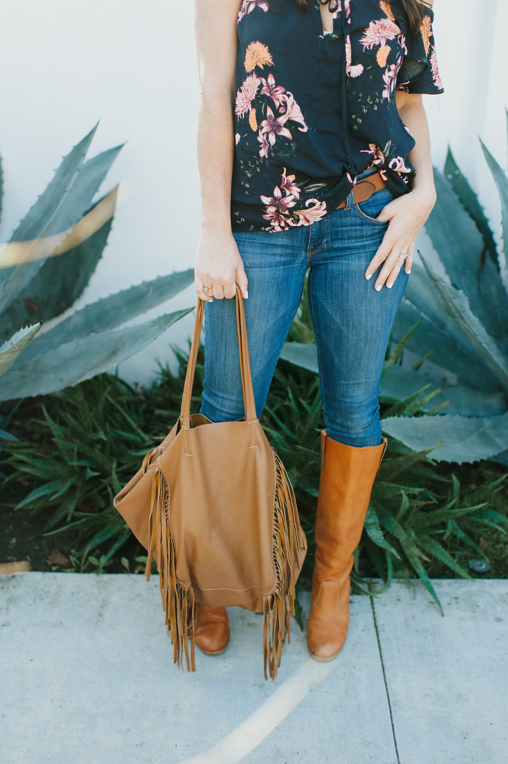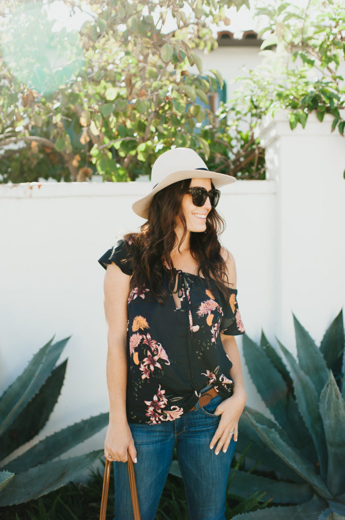 Last but not least is navy blue…  This isn’t a color I buy that often to be honest, but lately I have gravitated towards blue.  Maybe it’s because I’m a mom of boys, but blue seems to always be around me.  I’m obsessed with this top and this beautiful print Knot Sisters has, using navy with mustard yellow and Burgundy.  I’ve already worn it on a date night, but the off the shoulder makes it perfect for those fun occasions.  Just add a cute hat and some boots and you’re set!