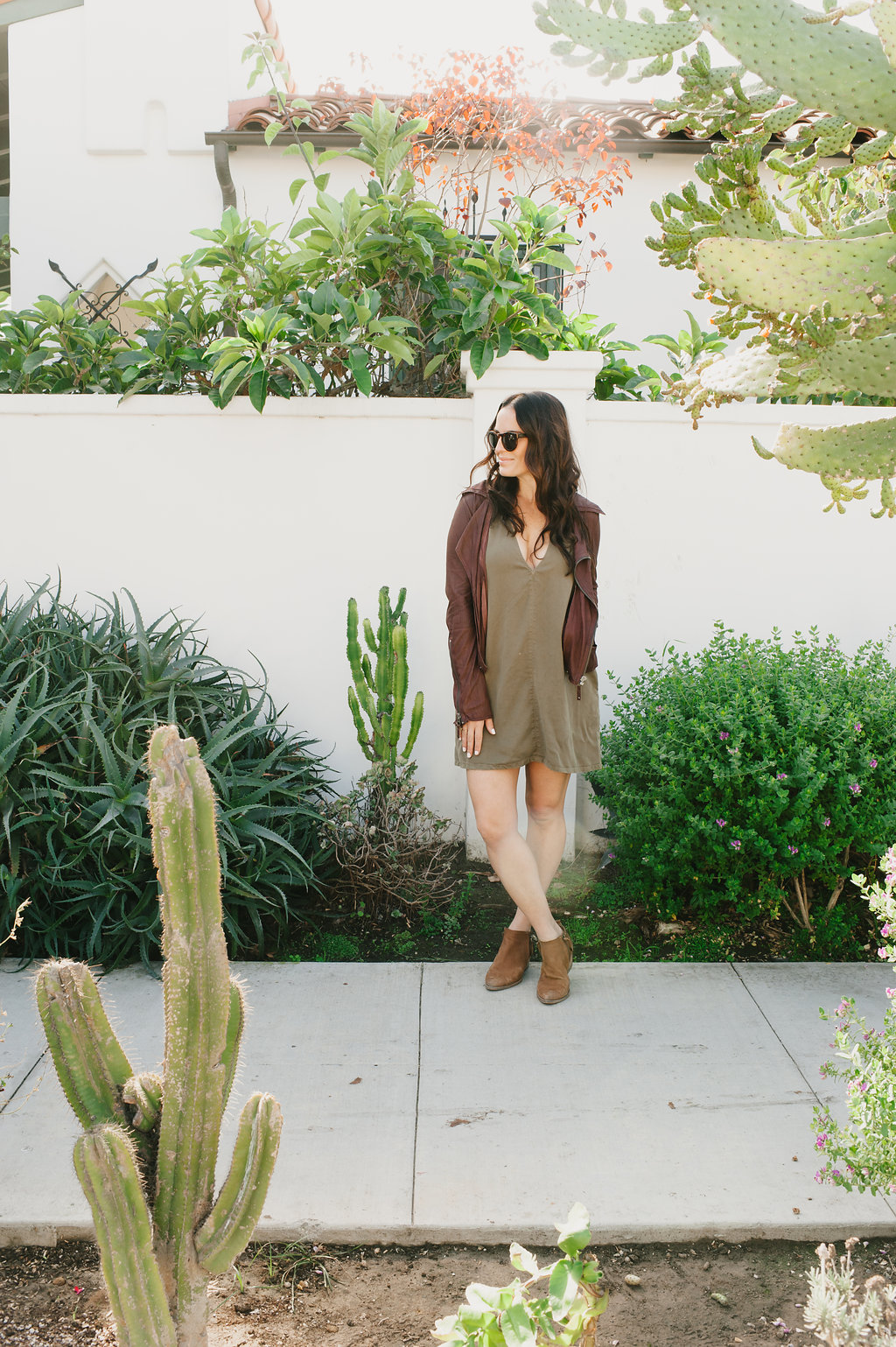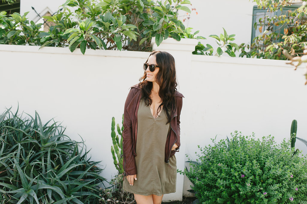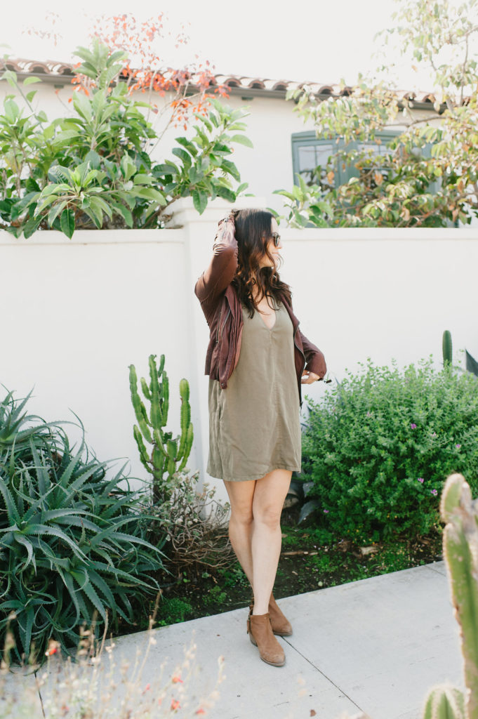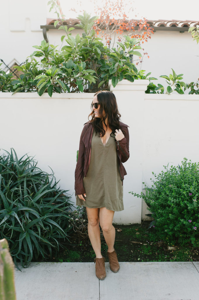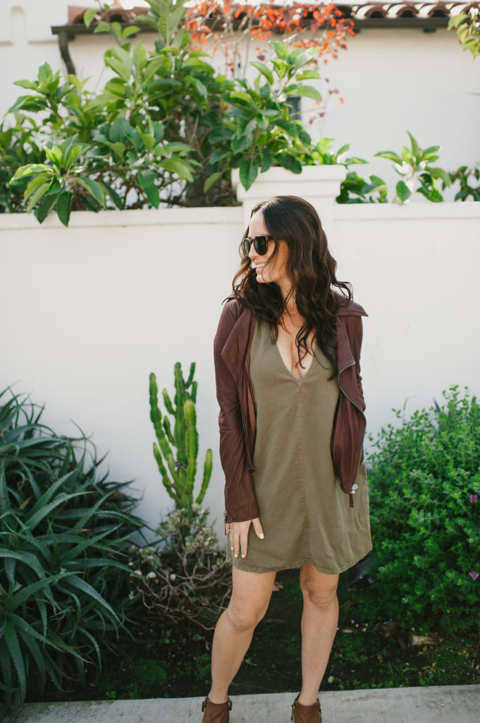 Next up is olive green… Being a green eyed gal, this is always a color I gravitate towards.  This simple dress has cute pockets and a sexy neckline.  You can pair this with so many things and dress it up or down.  I added another pop of color with my burgundy leather jacket, but the possibilities are endless!  This ones a classic piece that would be good in all of our closets!