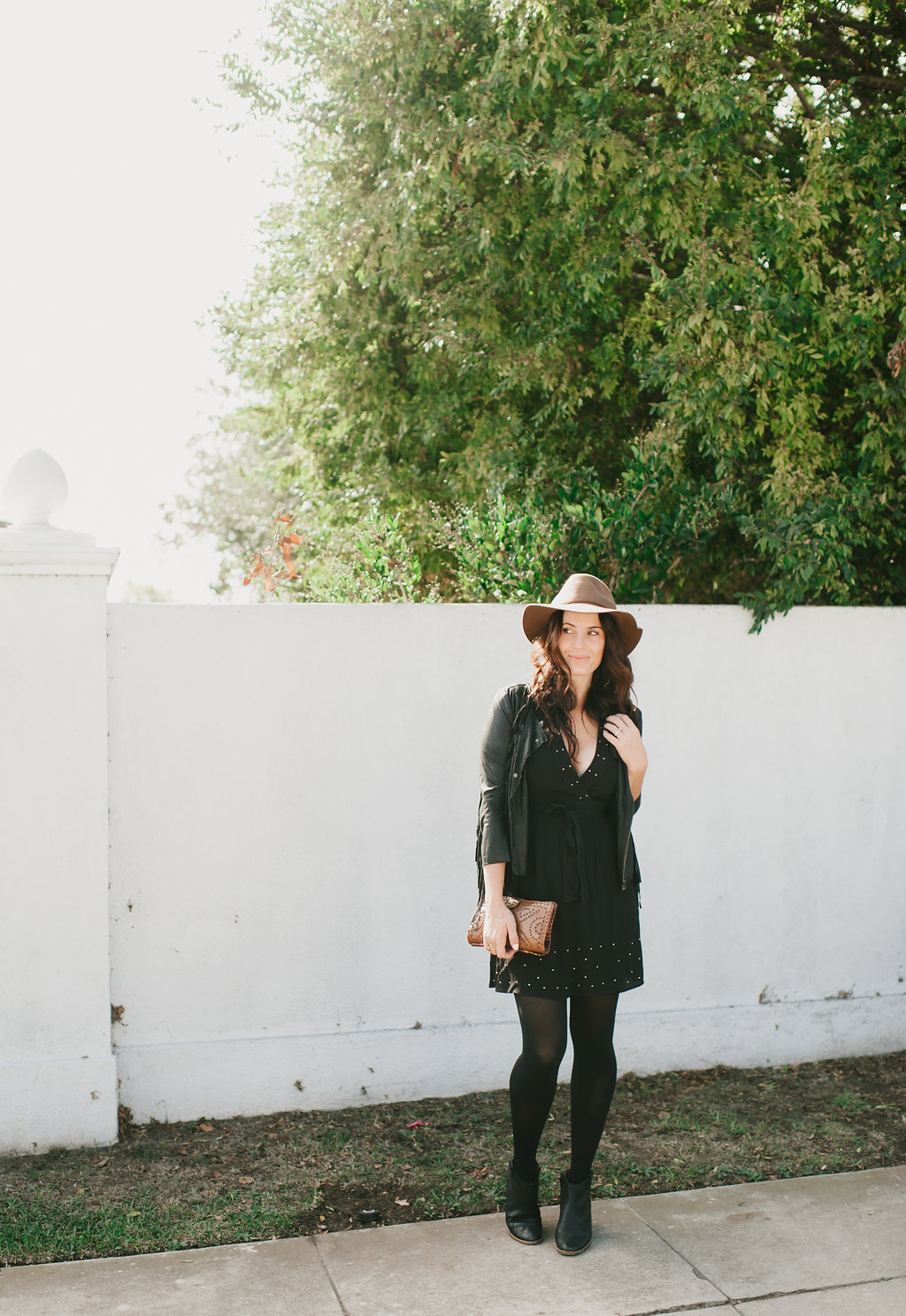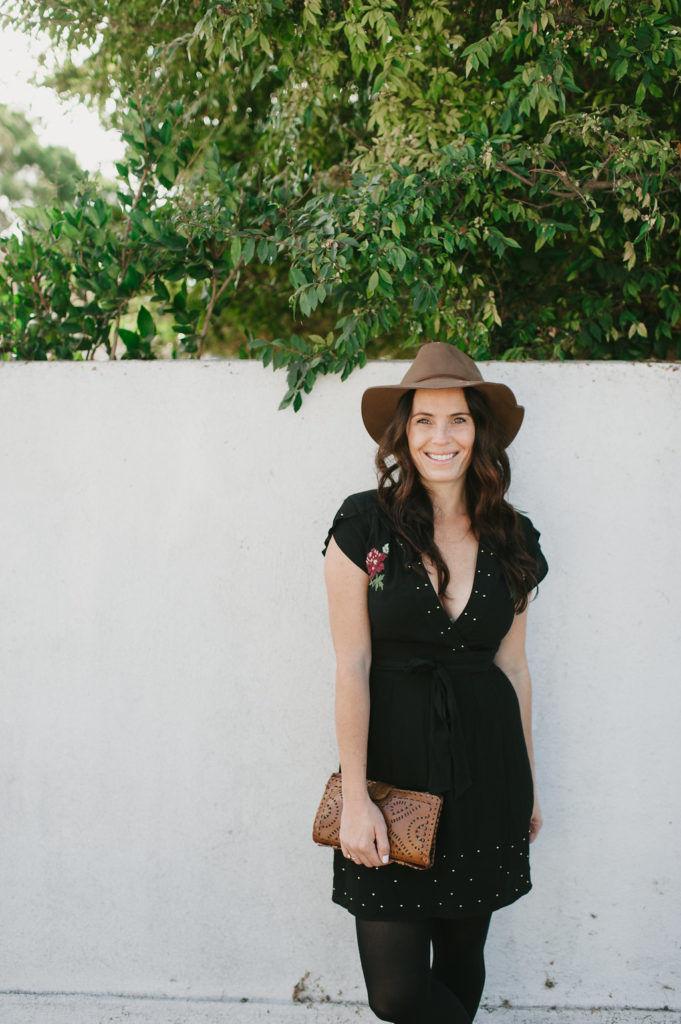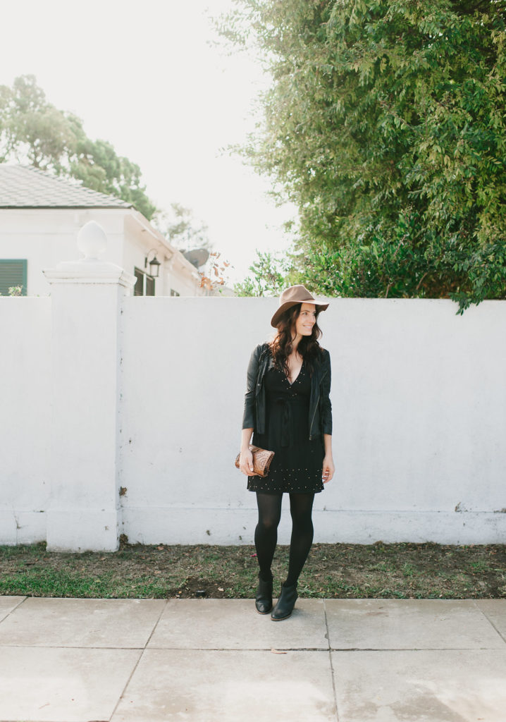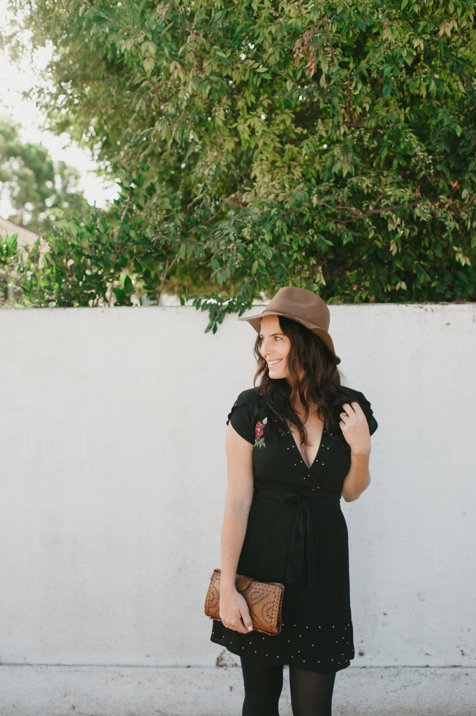 Second color on my list is classic black, because duh!  You can’t go wrong!  Black is always ok, no matter what season, so it was definitely on my list of Fall hues.  This fun little dress has the cutest embroidery detail and studs… It’s a little bit sweet and a little bit sexy, perfect for date night!  Another Fall and Winter essential, black tights, these are my favorites