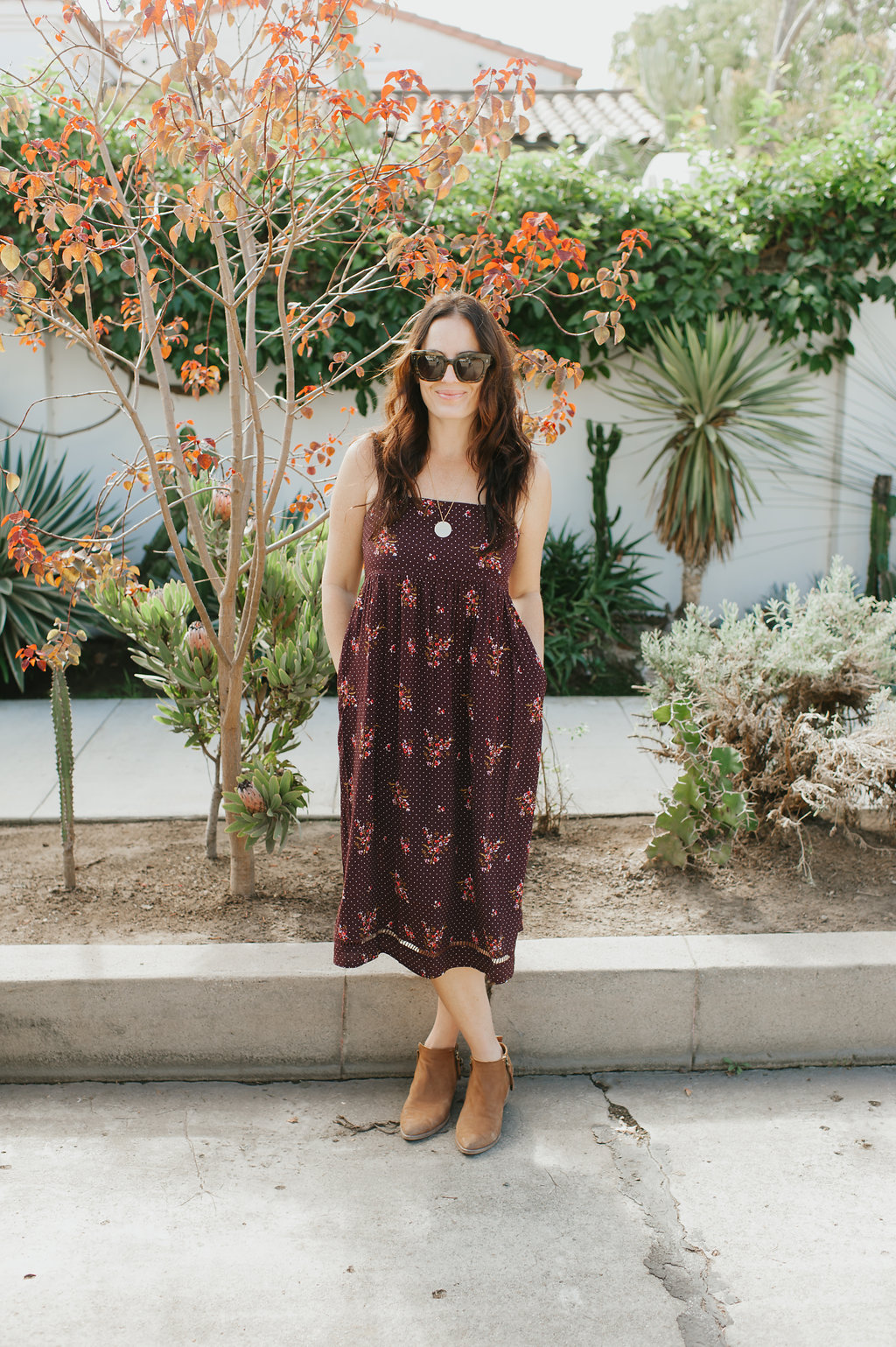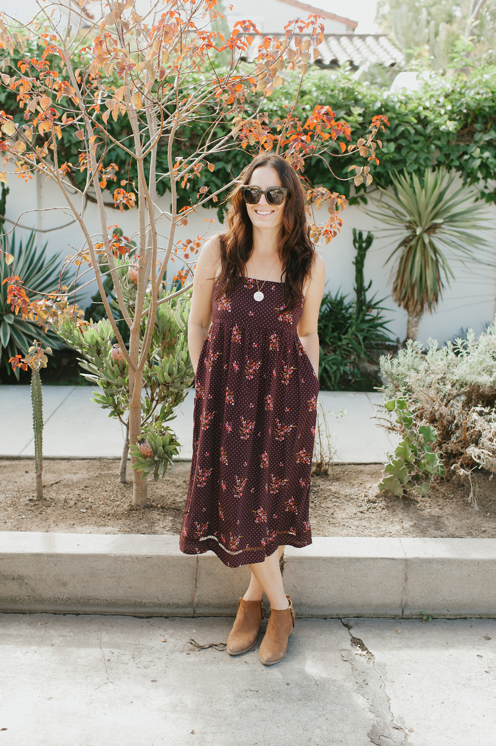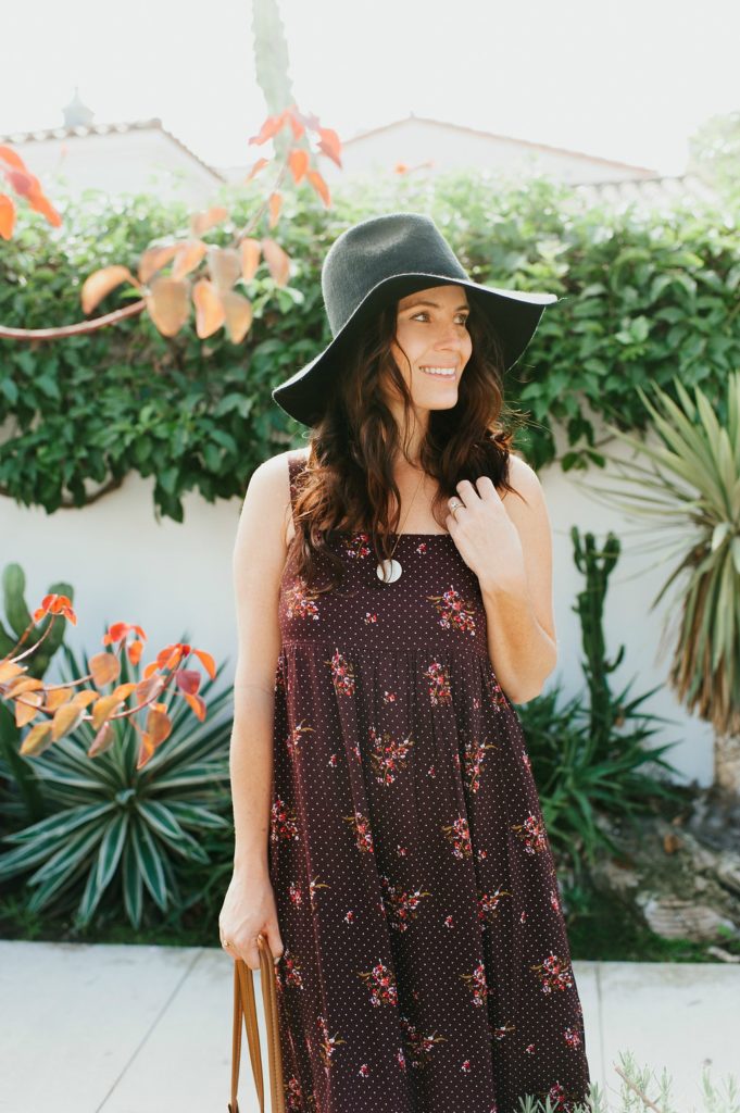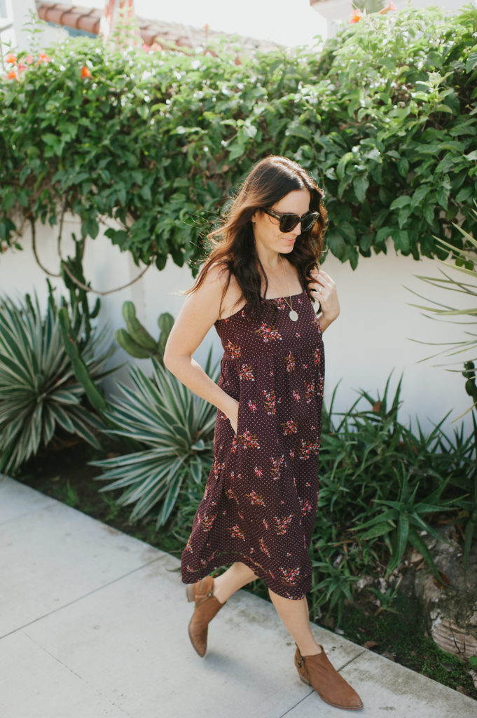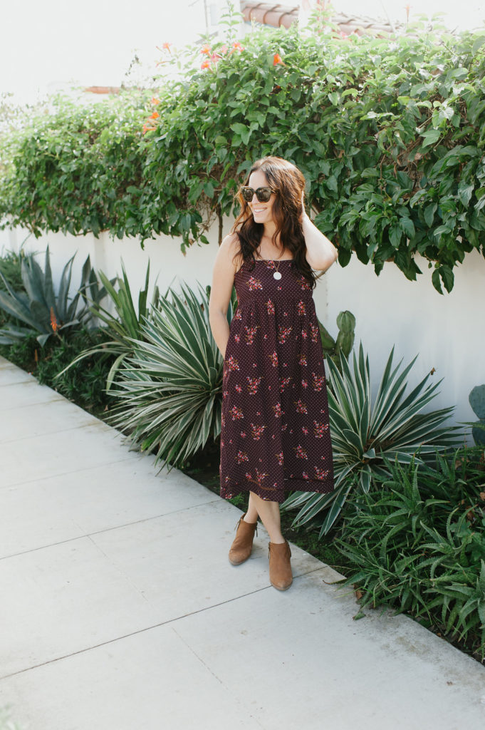 Let’s start with one of my favorite colors and my new favorite dress!  Burgundy is a beautiful Fall tone that looks great on so many skin tones.  I especially love this dress because it is flowy, comfortable, the print is adorable and well, I just feel good in it!  It’s something I would wear during the day and easily throw on a jacket and a pair of heels to wear in the evening.  Gotta love that boho easy vibe it has.  My necklace here is from James Michelle and sunglasses by Wyeth
