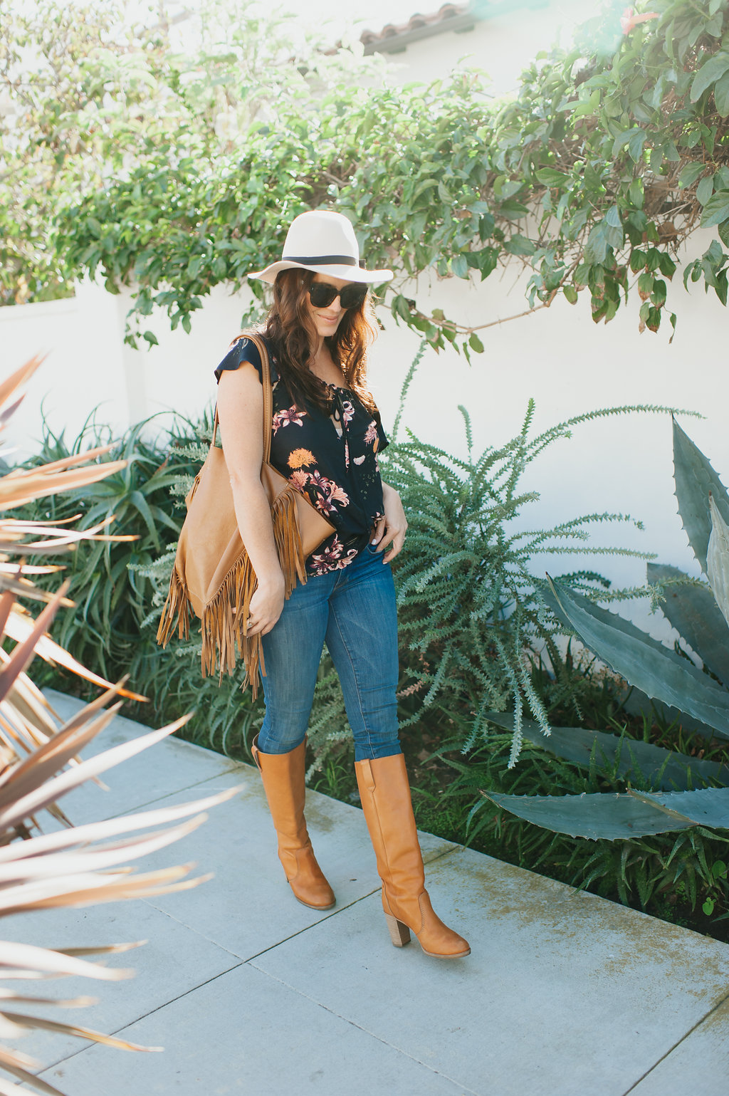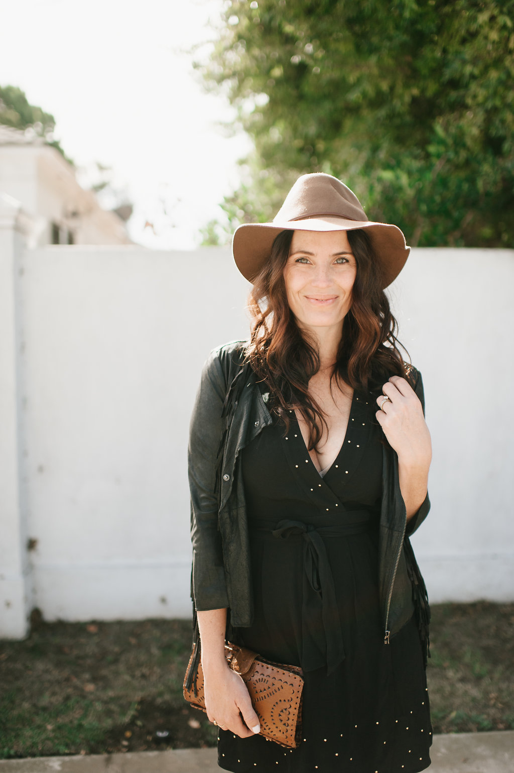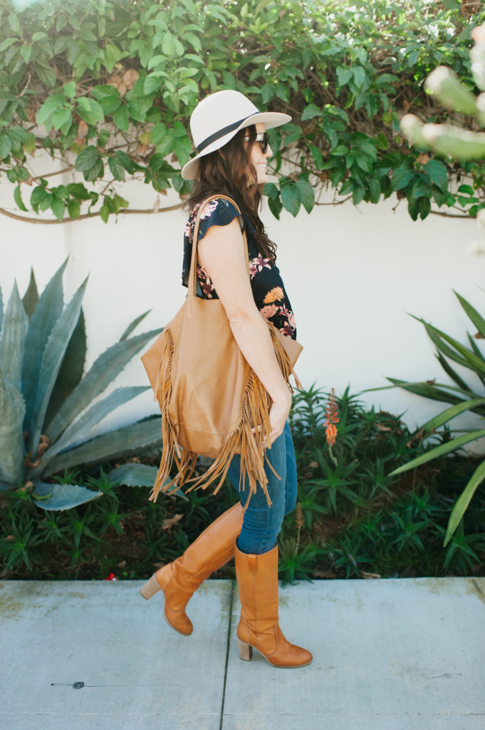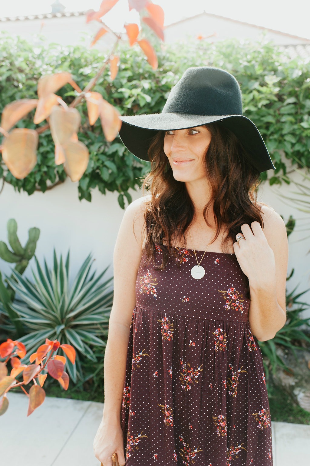 Let’s start with one of my favorite colors and my new favorite dress!  Burgundy is a beautiful Fall tone that looks great on so many skin tones.  I especially love this dress because it is flowy, comfortable, the print is adorable and well, I just feel good in it!  It’s something I would wear during the day and easily throw on a jacket and a pair of heels to wear in the evening.  Gotta love that boho easy vibe it has.  My necklace here is from James Michelle and sunglasses by Wyeth