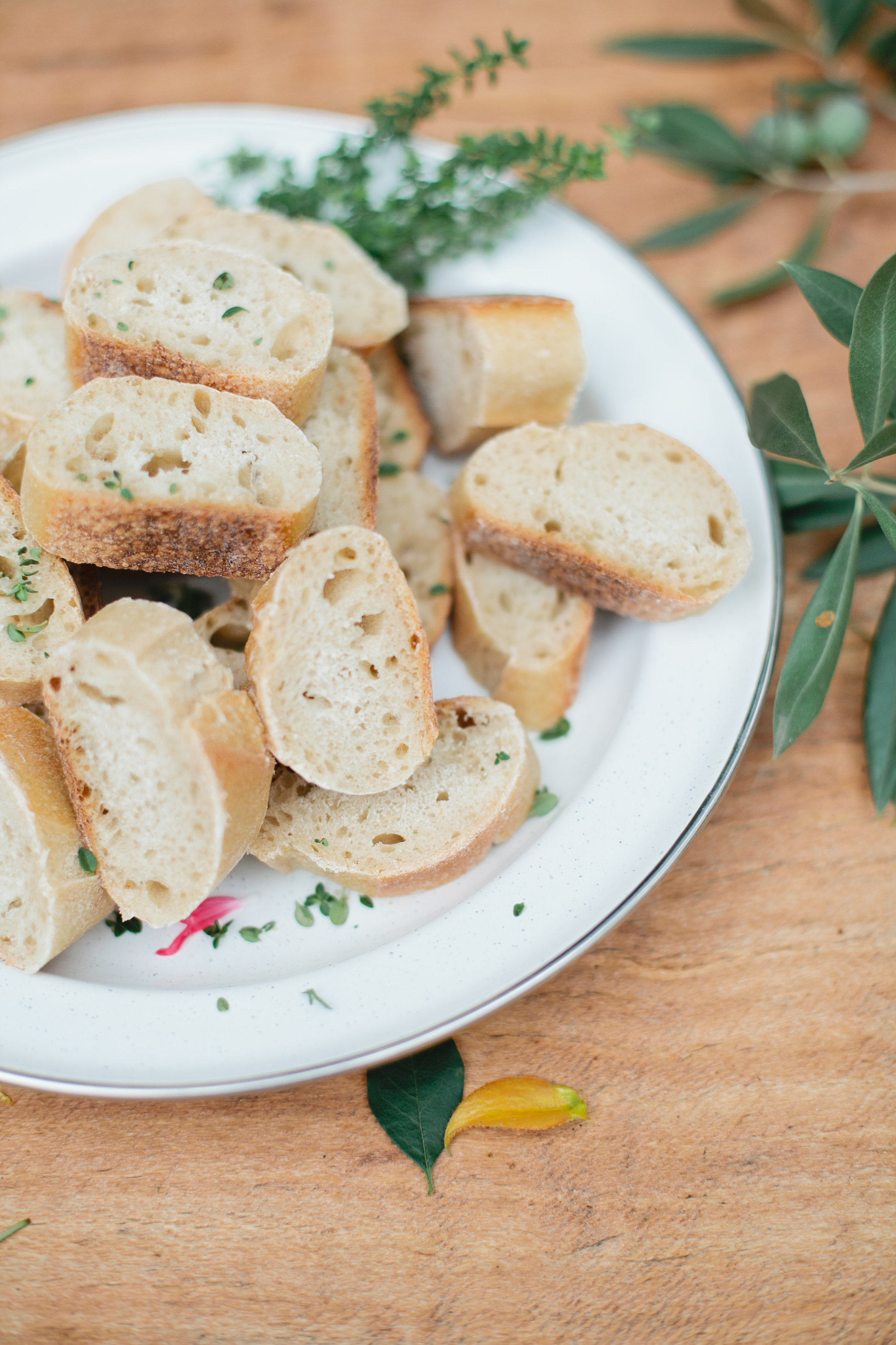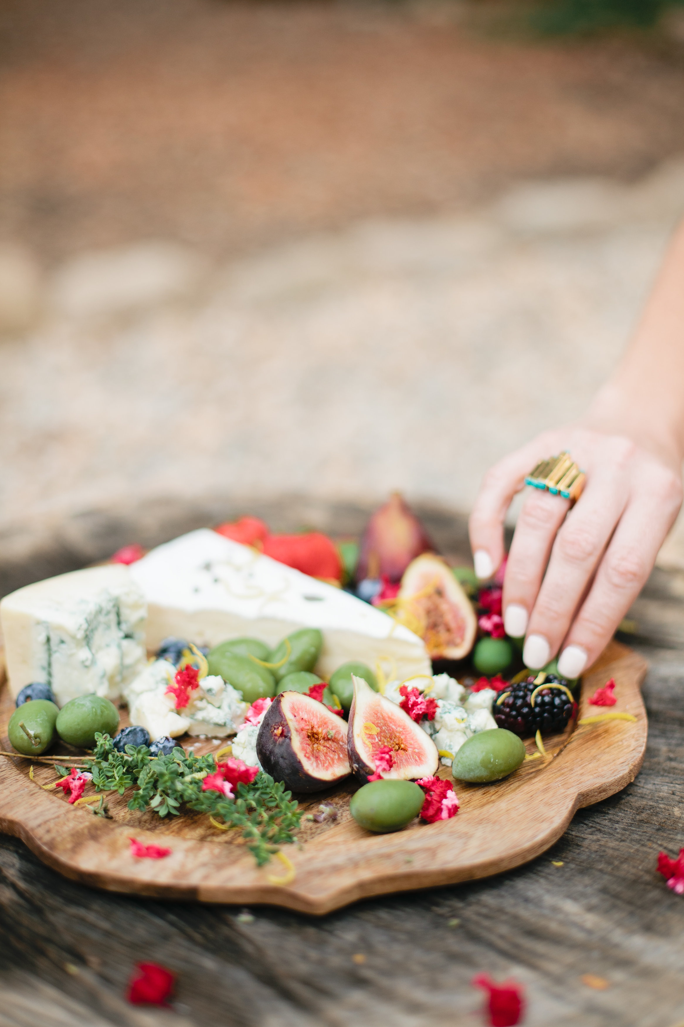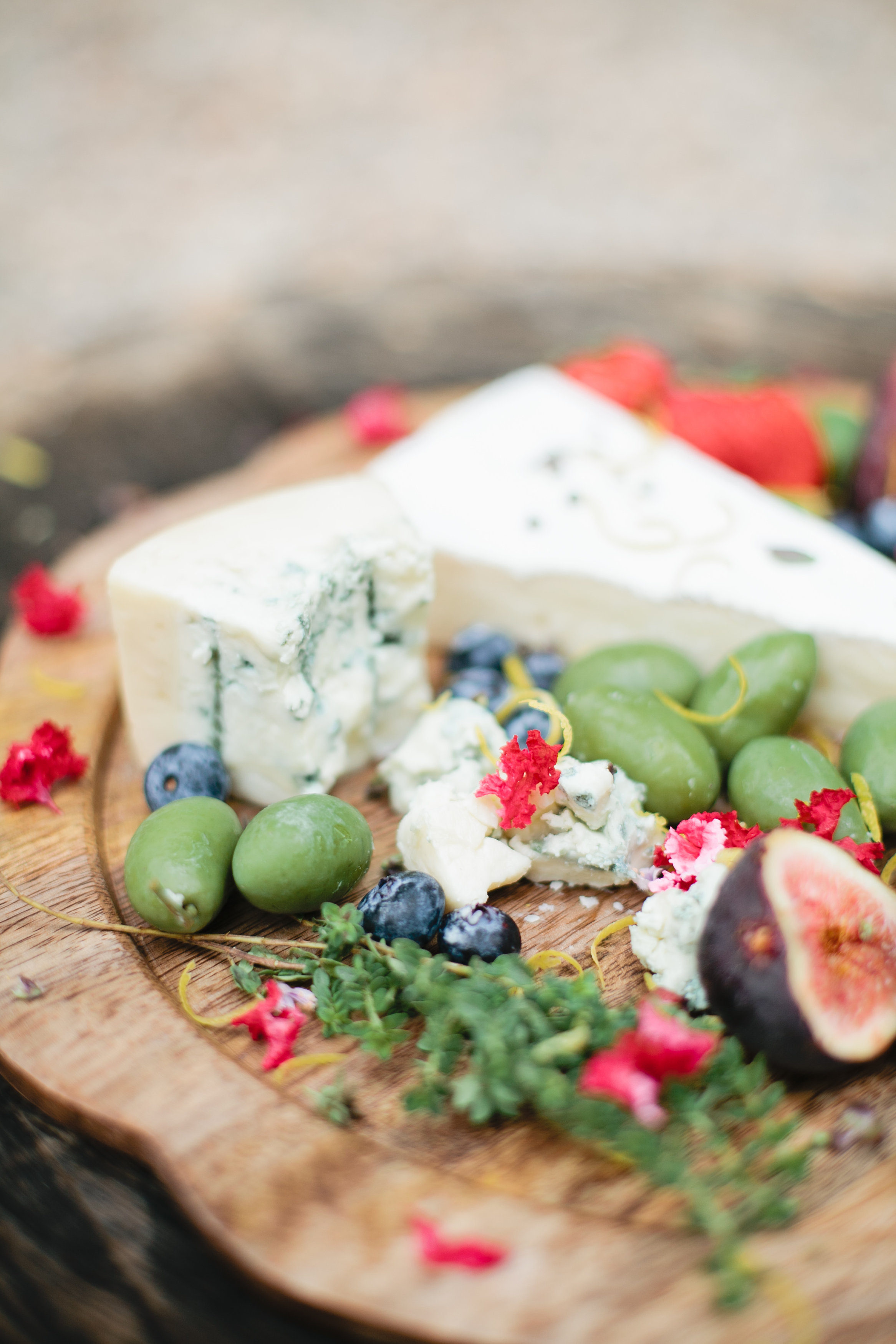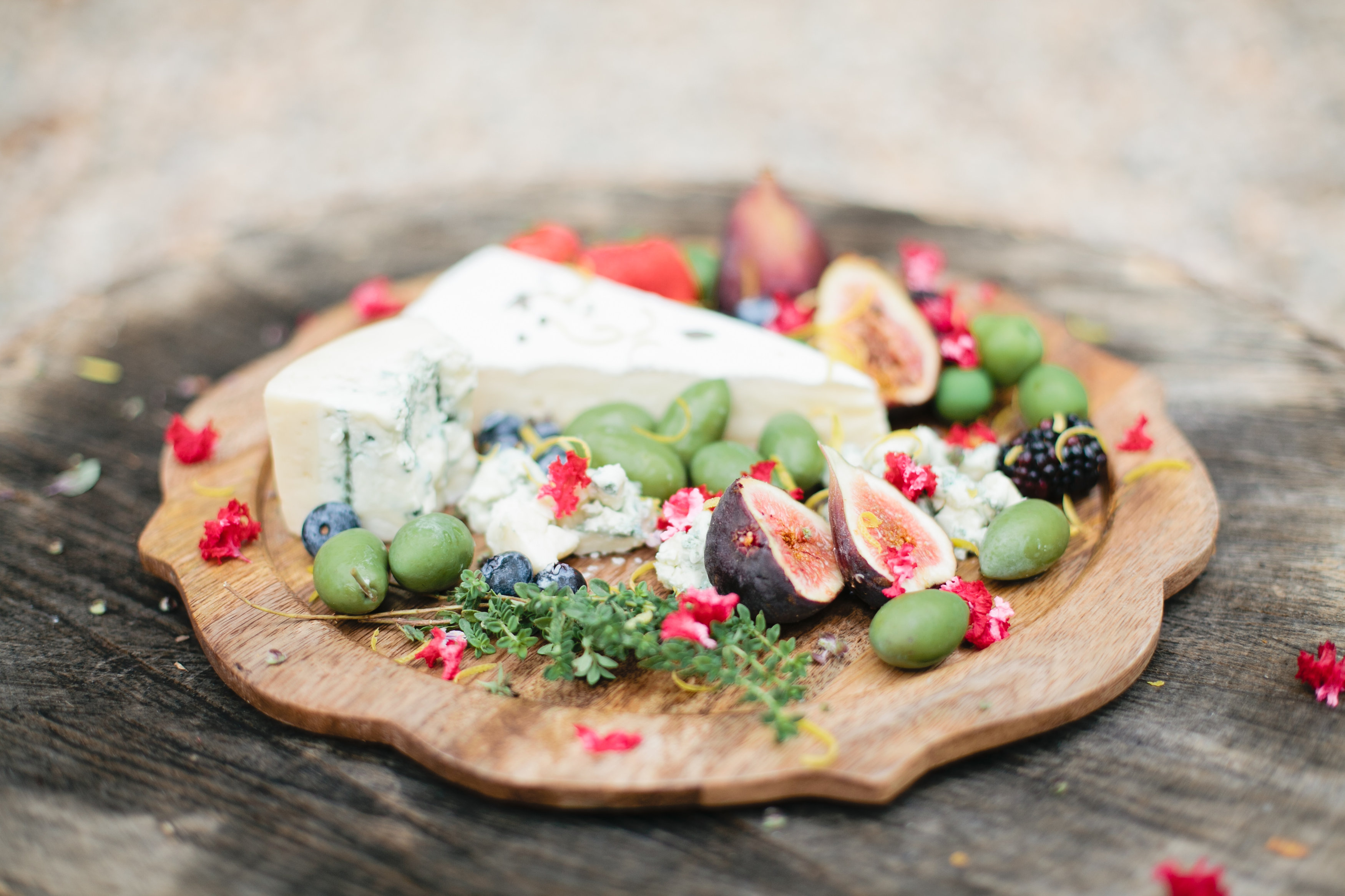 To assemble, just place your cheese on your plate, and then break apart some of the cheese. This will allow your guest to easily grab some pieces, and it creates a less structured looking plate. Then add your fruits, nuts, and olives to the plate. Scatter them around the cheese. If you are using figs, cut them in half to show the pretty pink inside and its easier to eat. Lastly, add some fresh herbs to the plate. I We also added fresh lemon zest and flowers to add pops of color. Serve bread on the side as well.
