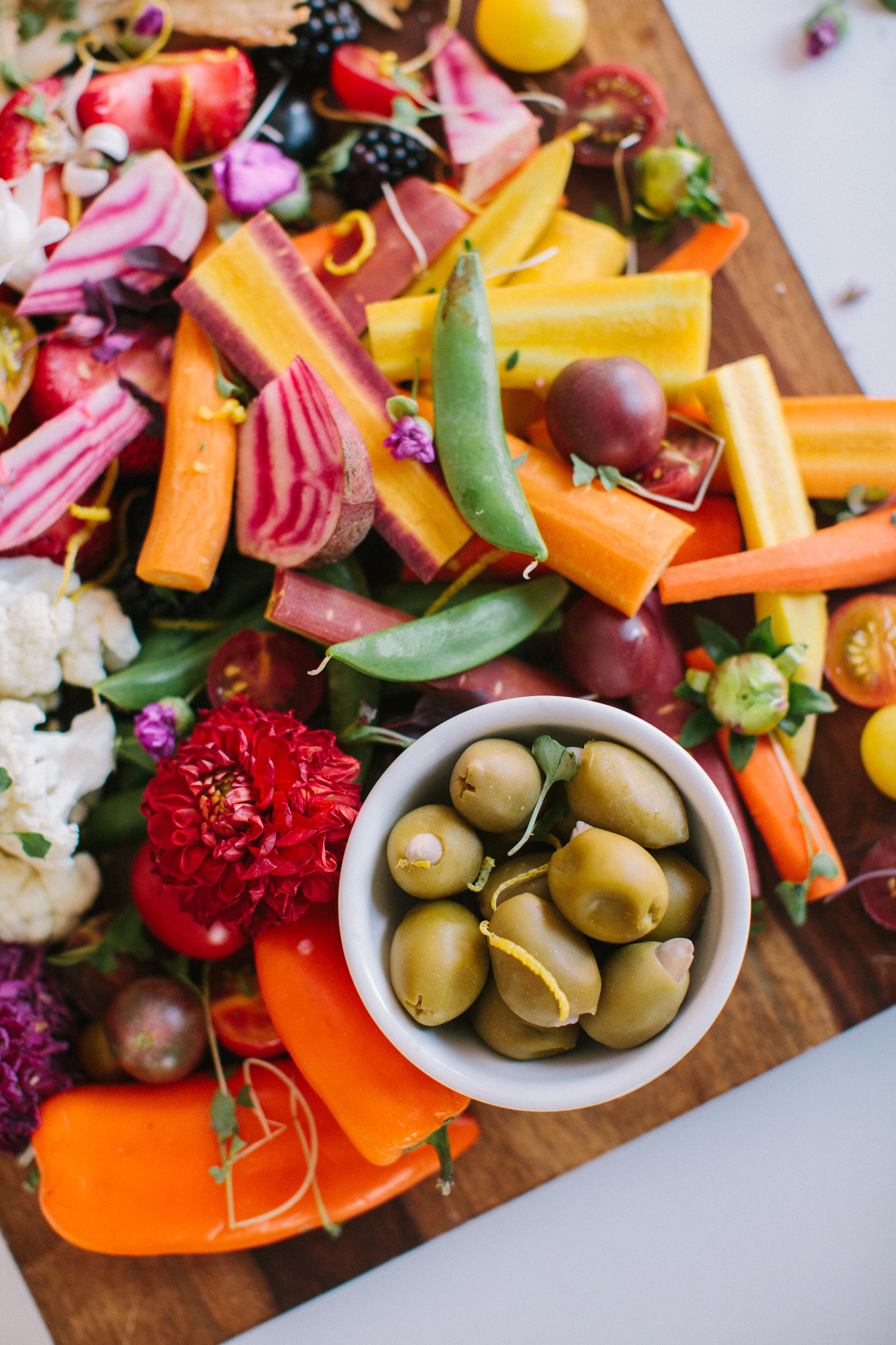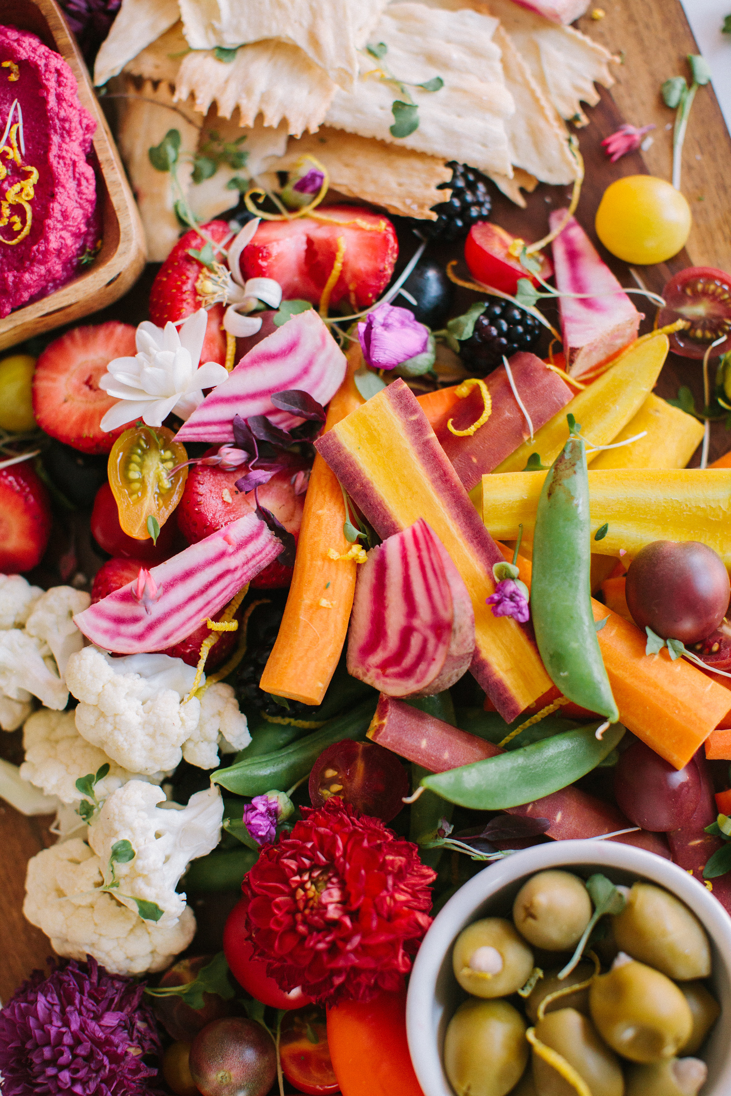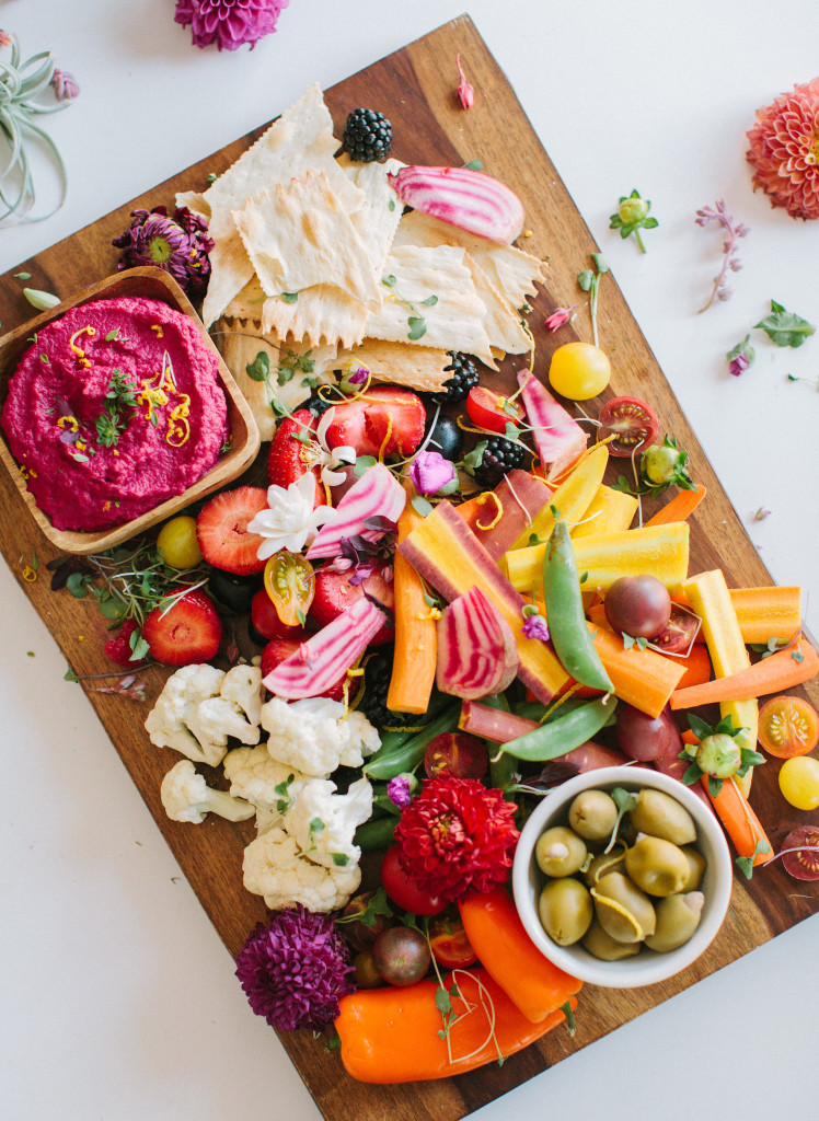 Serve with your favorite dipping vegetables, fruit, and crackers. I love to pick bright colors to have one pretty eye catching platter. Add micro greens and edible flowers for that pretty detail.