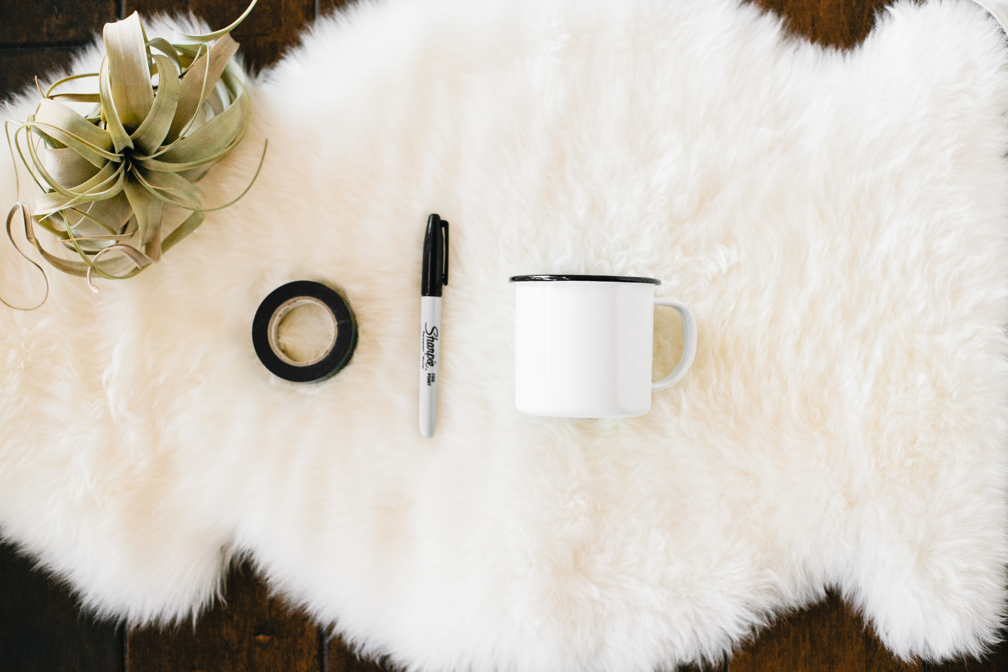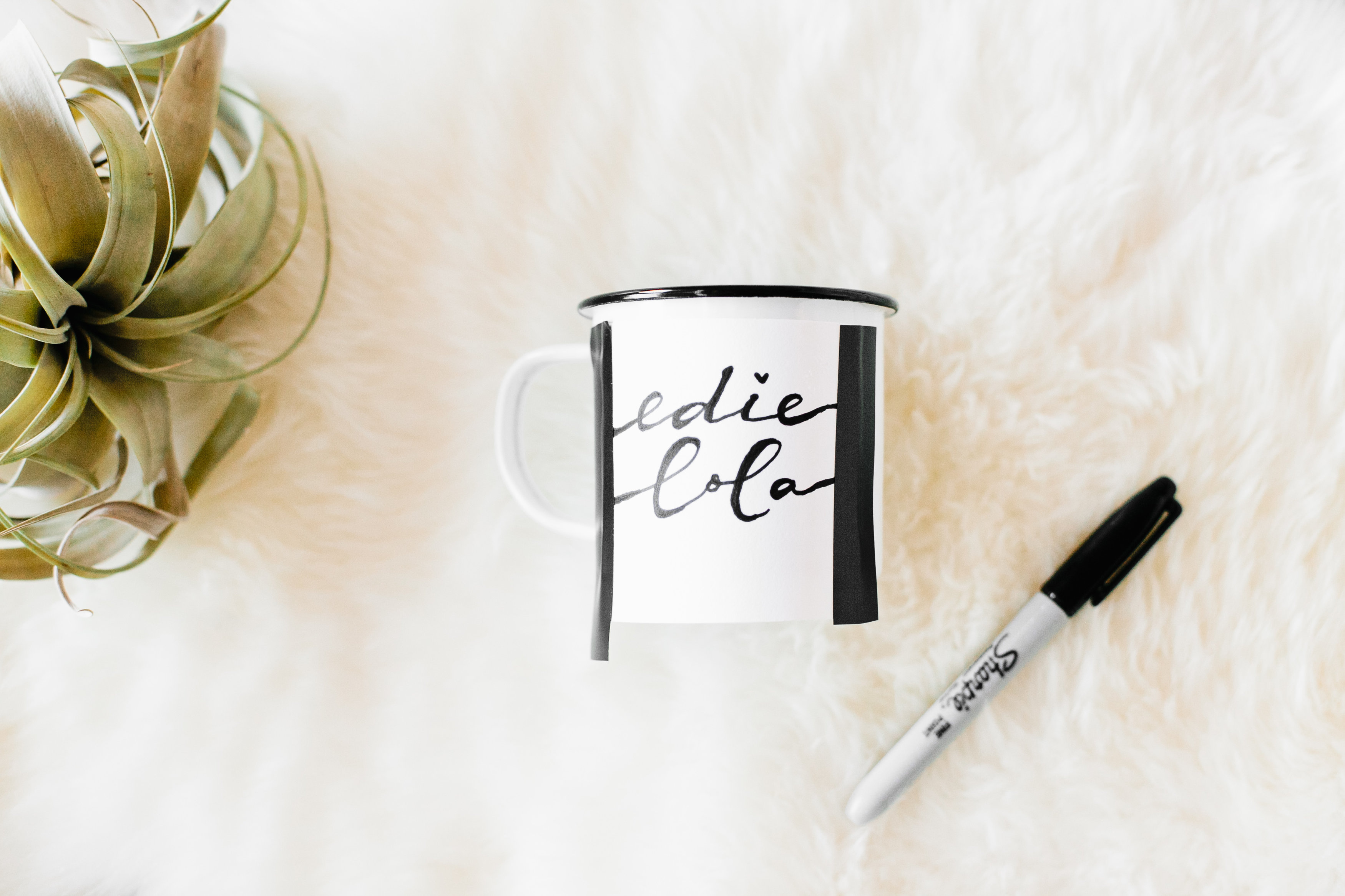 Step One…You need a blank enamelware mug, a good old trusty sharpie, and some tape.