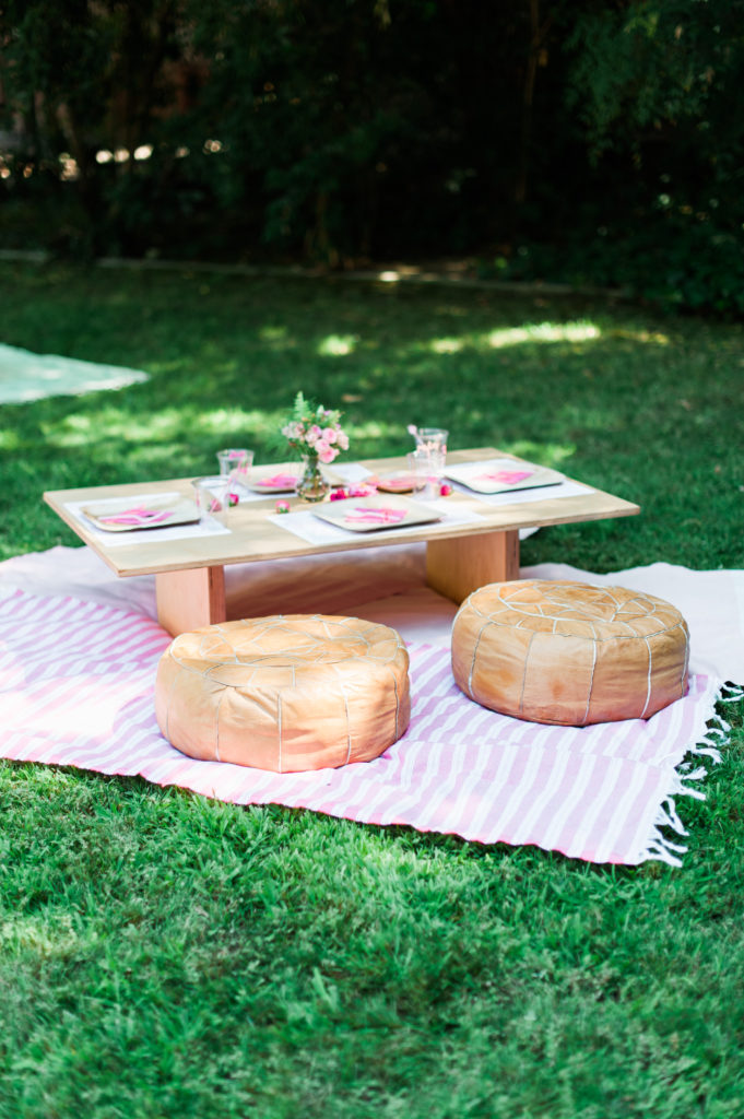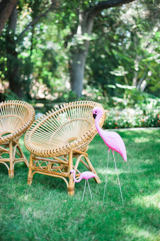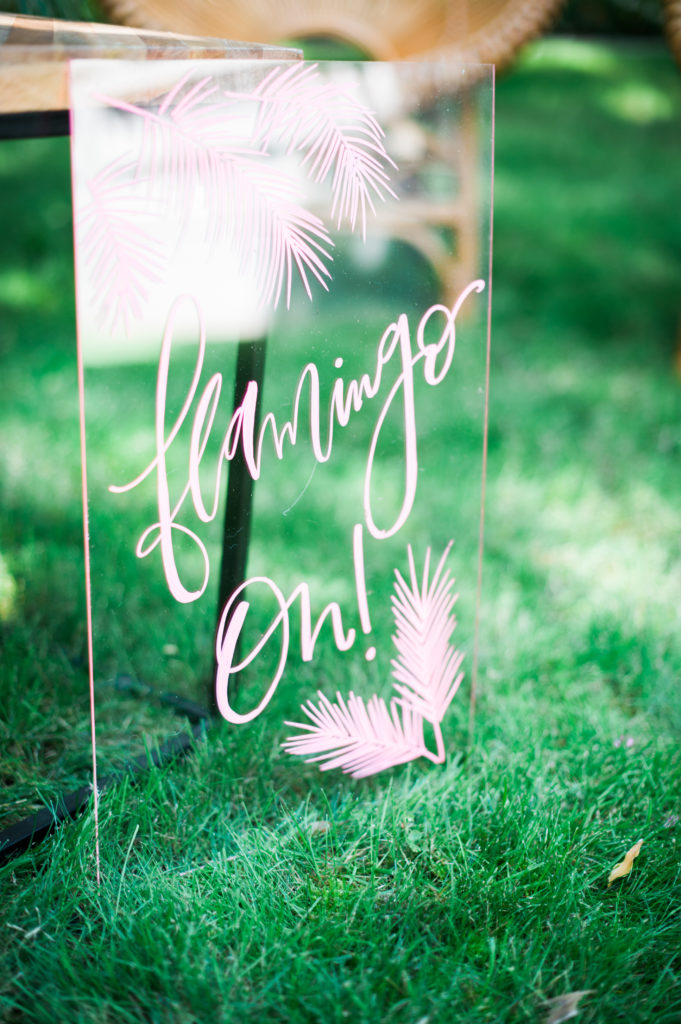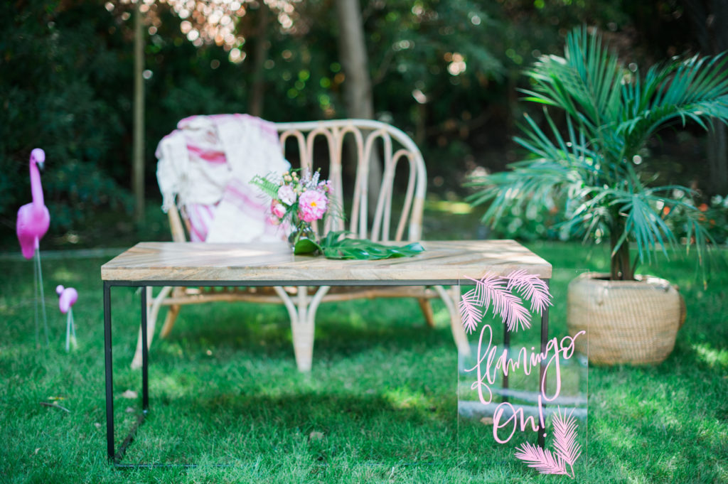 A rattan lounge area is our jam, and this sweet little setup was a great area for the adults to relax and have a cocktail at. Cultivate Rentals has the best boho inventory in Nothern California! We can’t get enough of all her goodies! I spy some Meghann Miniello signage! Adding fun signage like this “Flamingo On” acrylic sign is a great detail to add to any party.