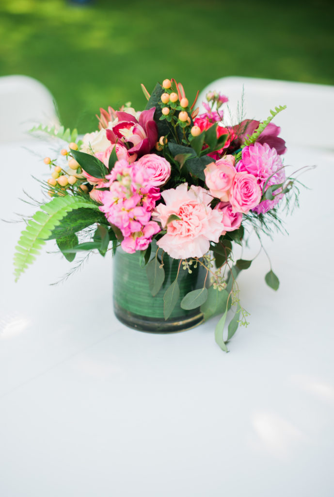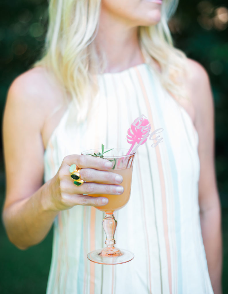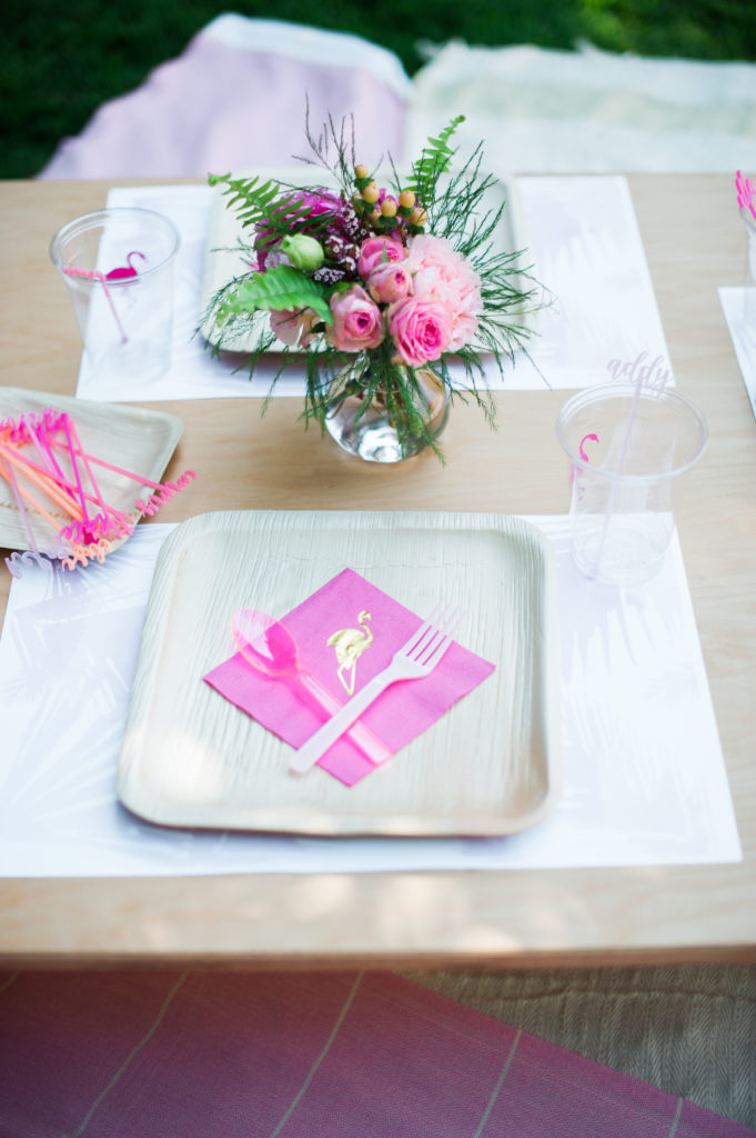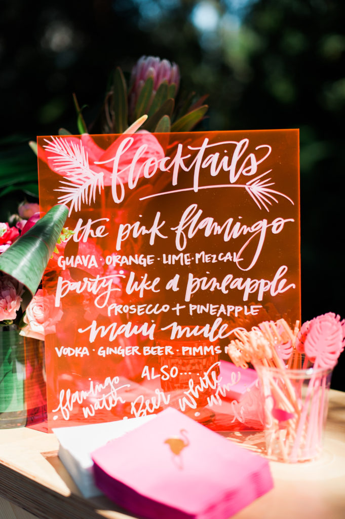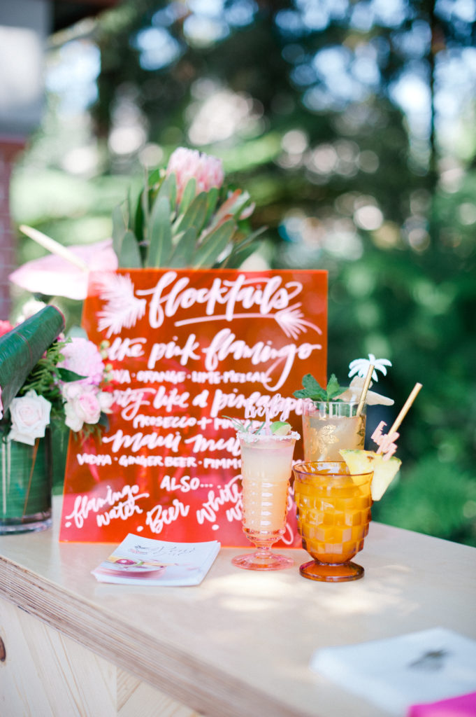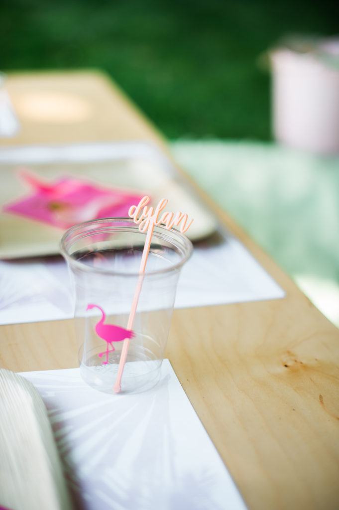 Everly’s mommy kept the tables pretty simple. But of course adding some fun detail with tropical leaf placemats and fun cocktail stirrers that The Nic Roc Shop created for each guest, personalized with their names in fun pink hued colors.
