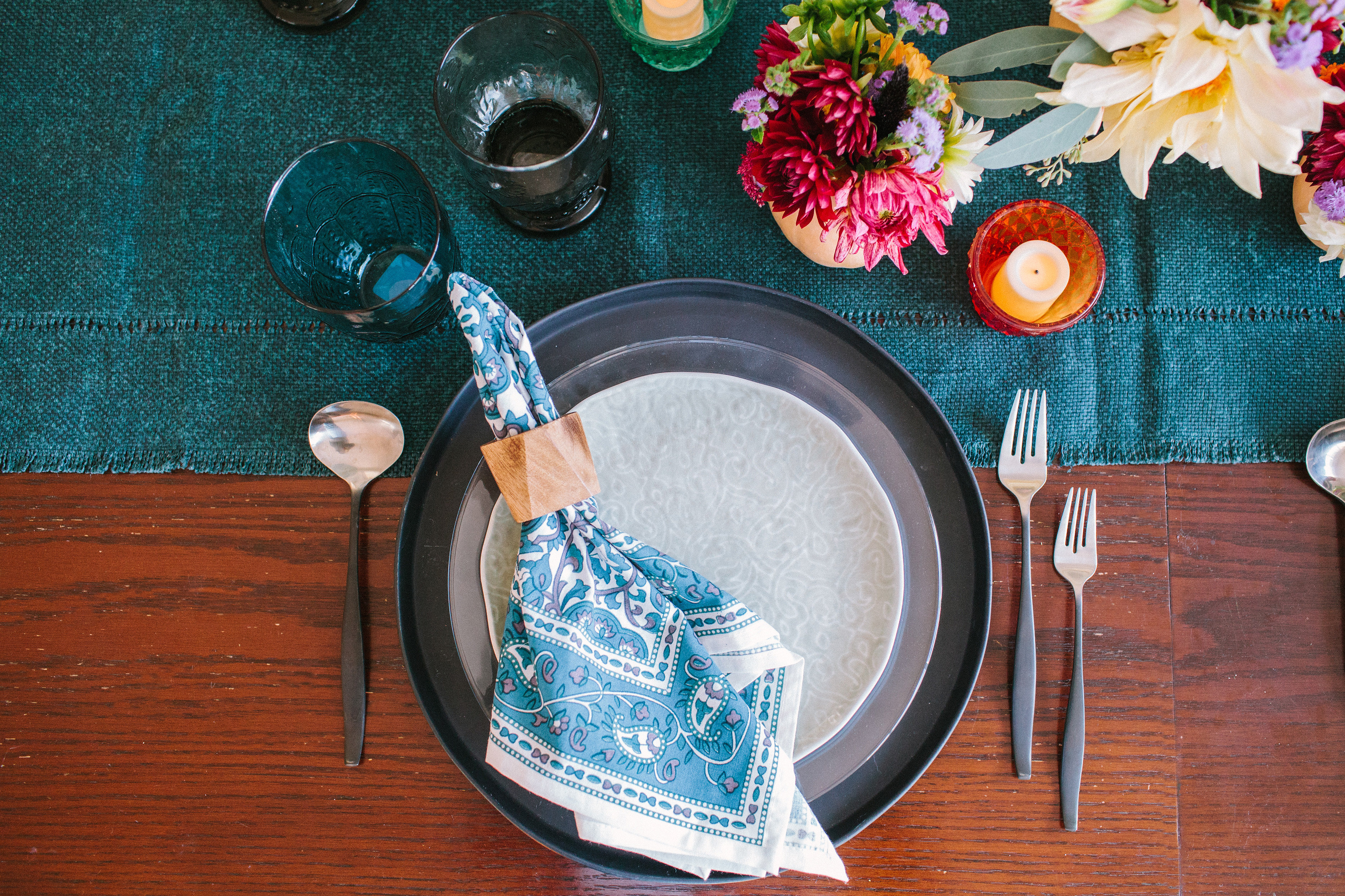 To achieve this look, simply take out: indigo runner, black charger, blue tumbler, black flatware, tea lights and blue indigo floral napkin.