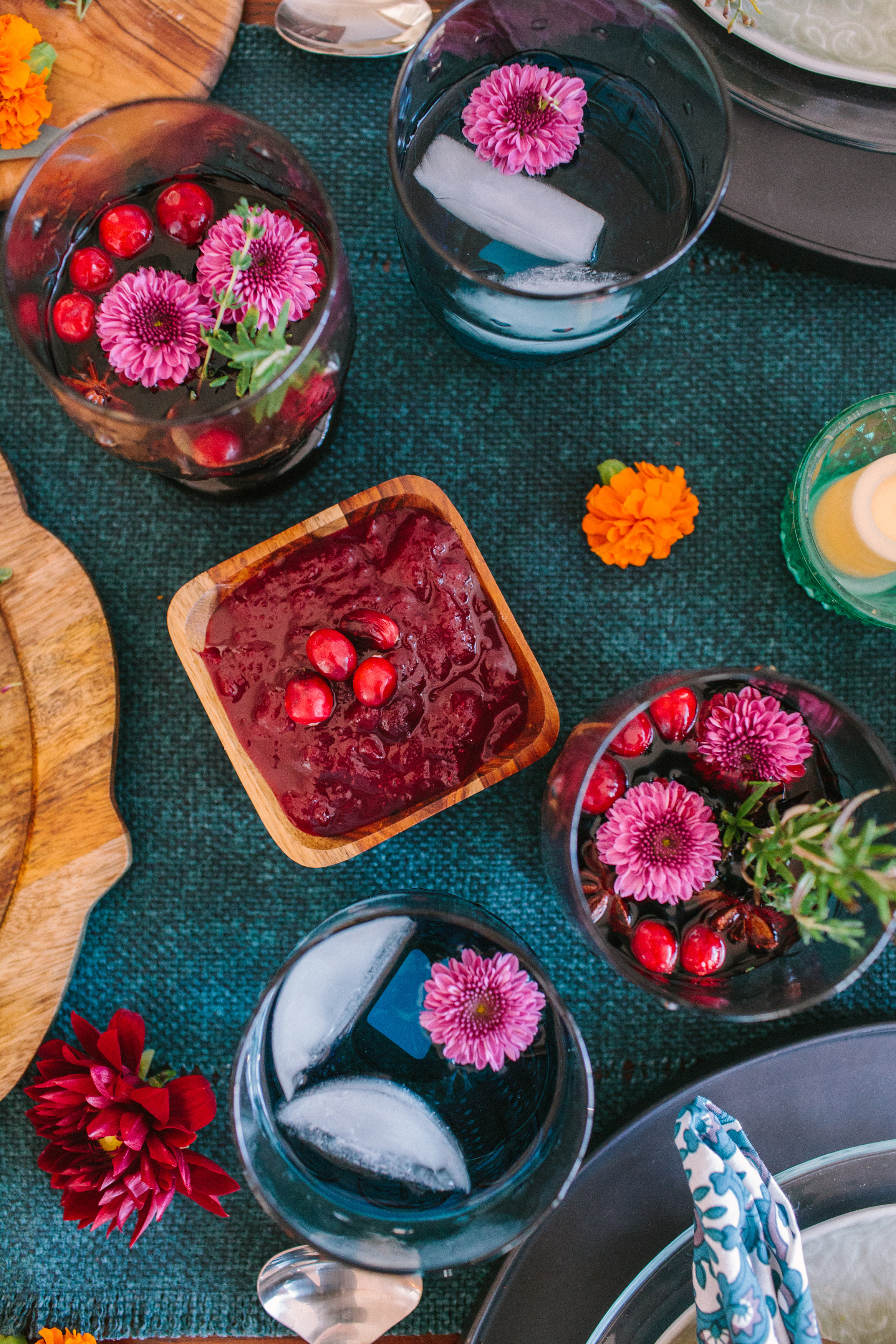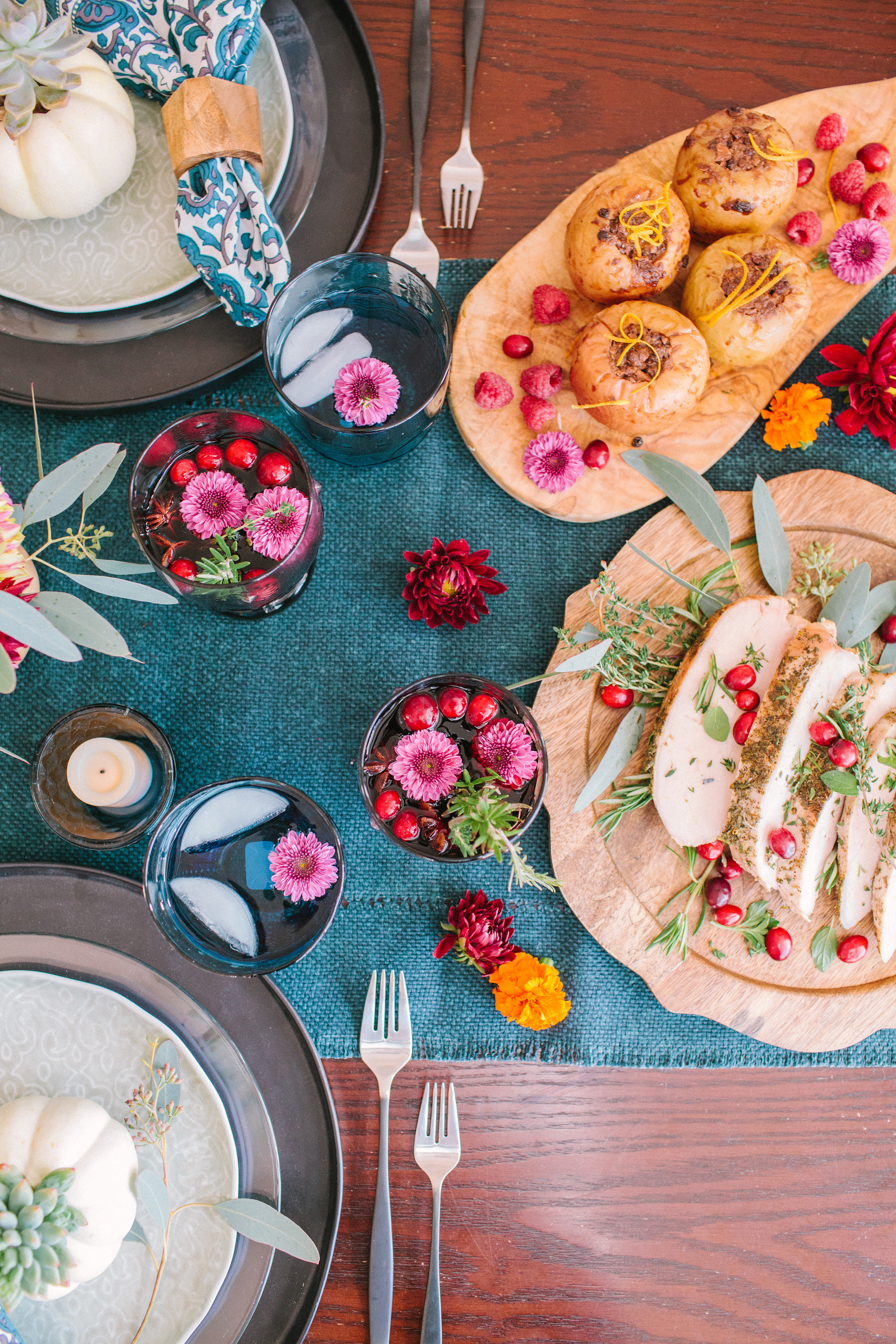 Lastly, add garnish and flowers for a pretty detail. Flowers truly give you a pop of color for the table, and you will wow your guests.
