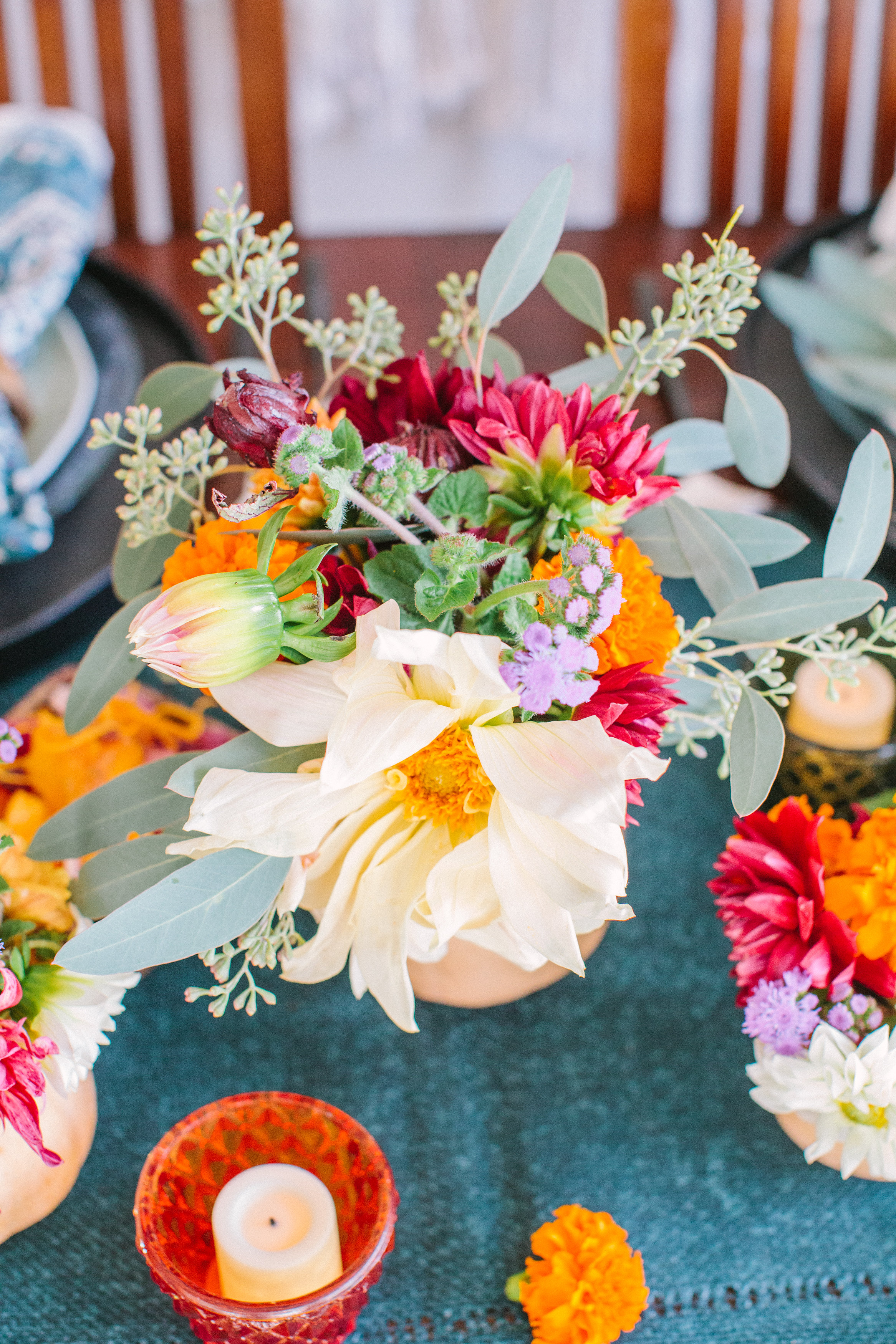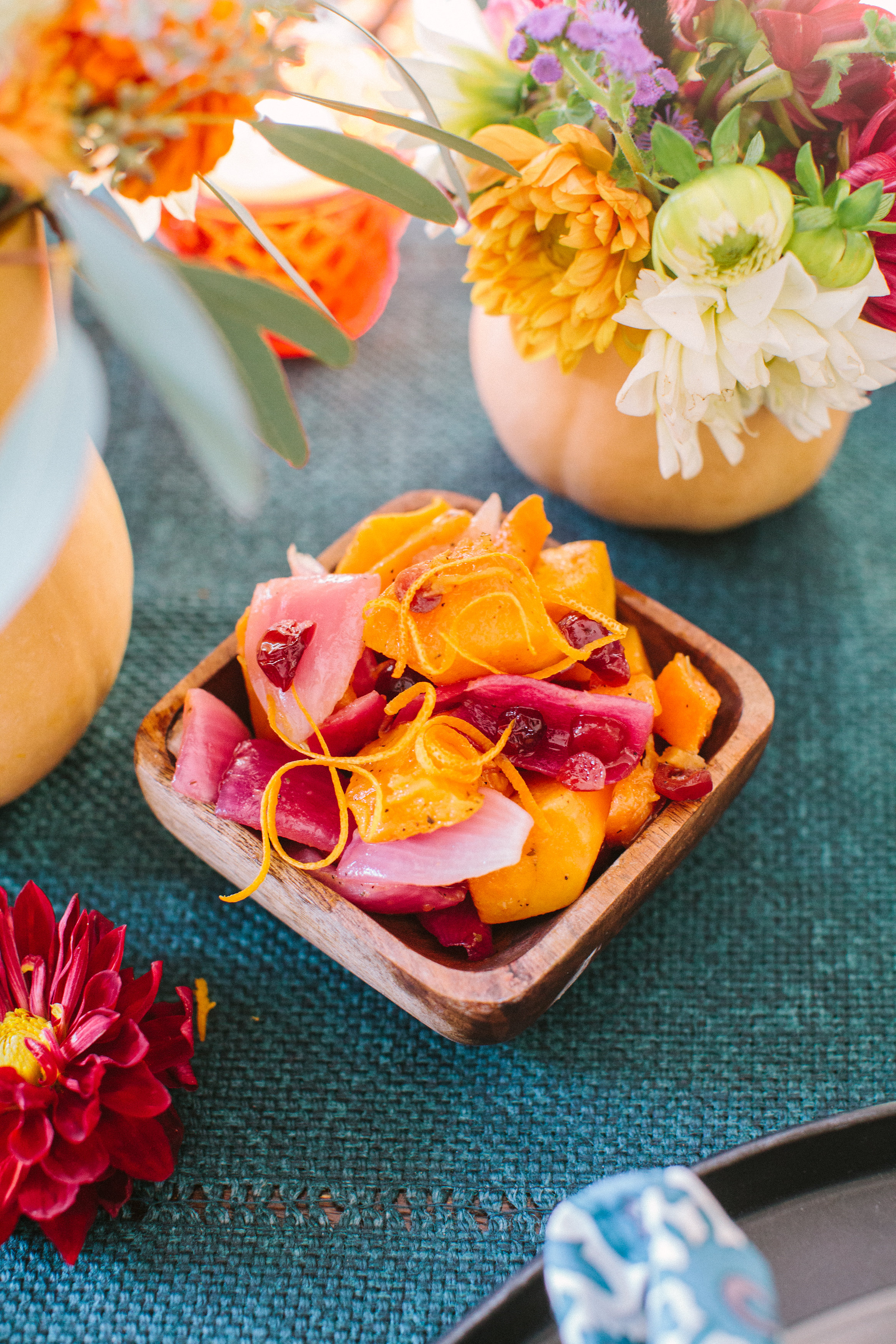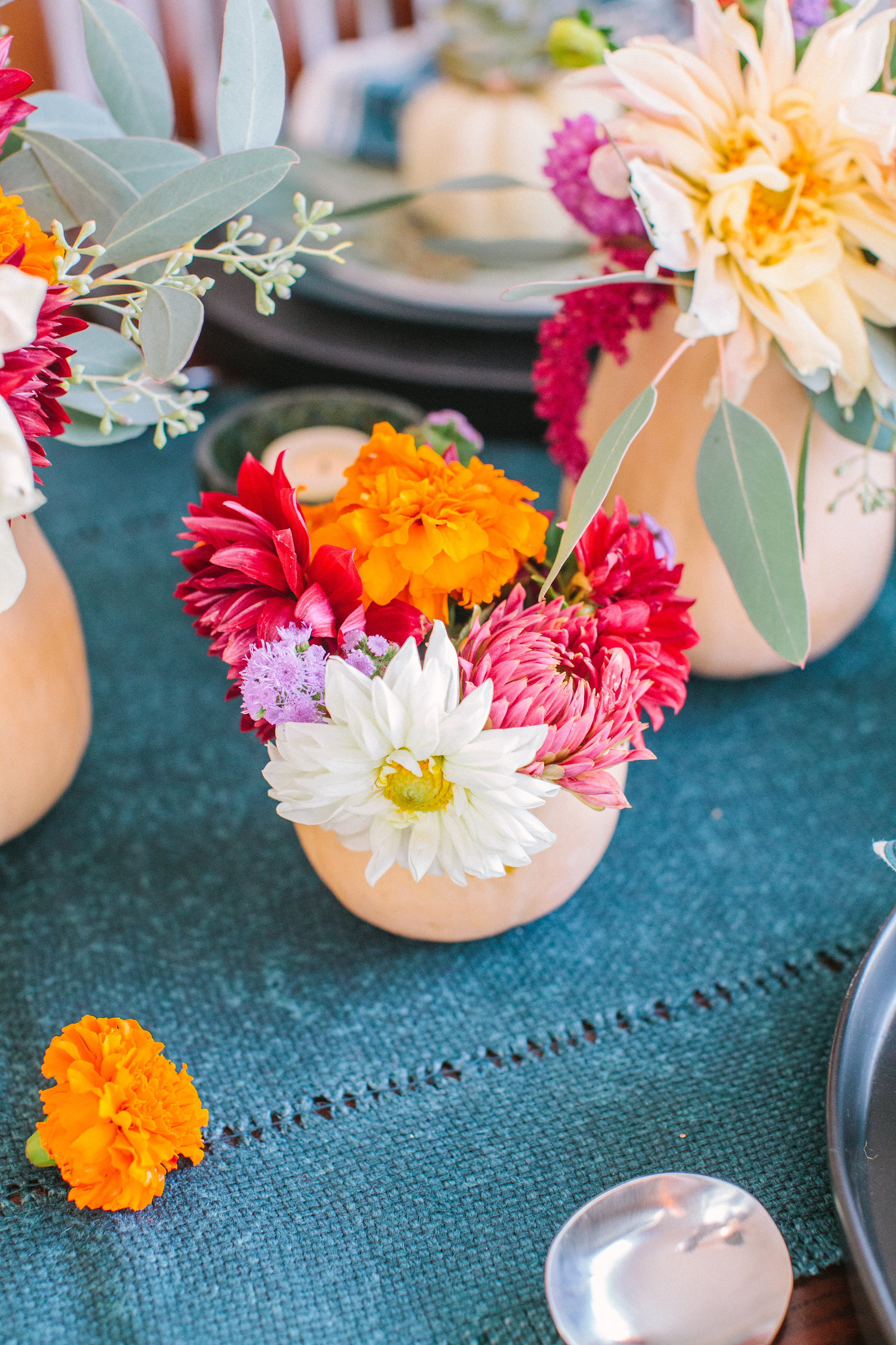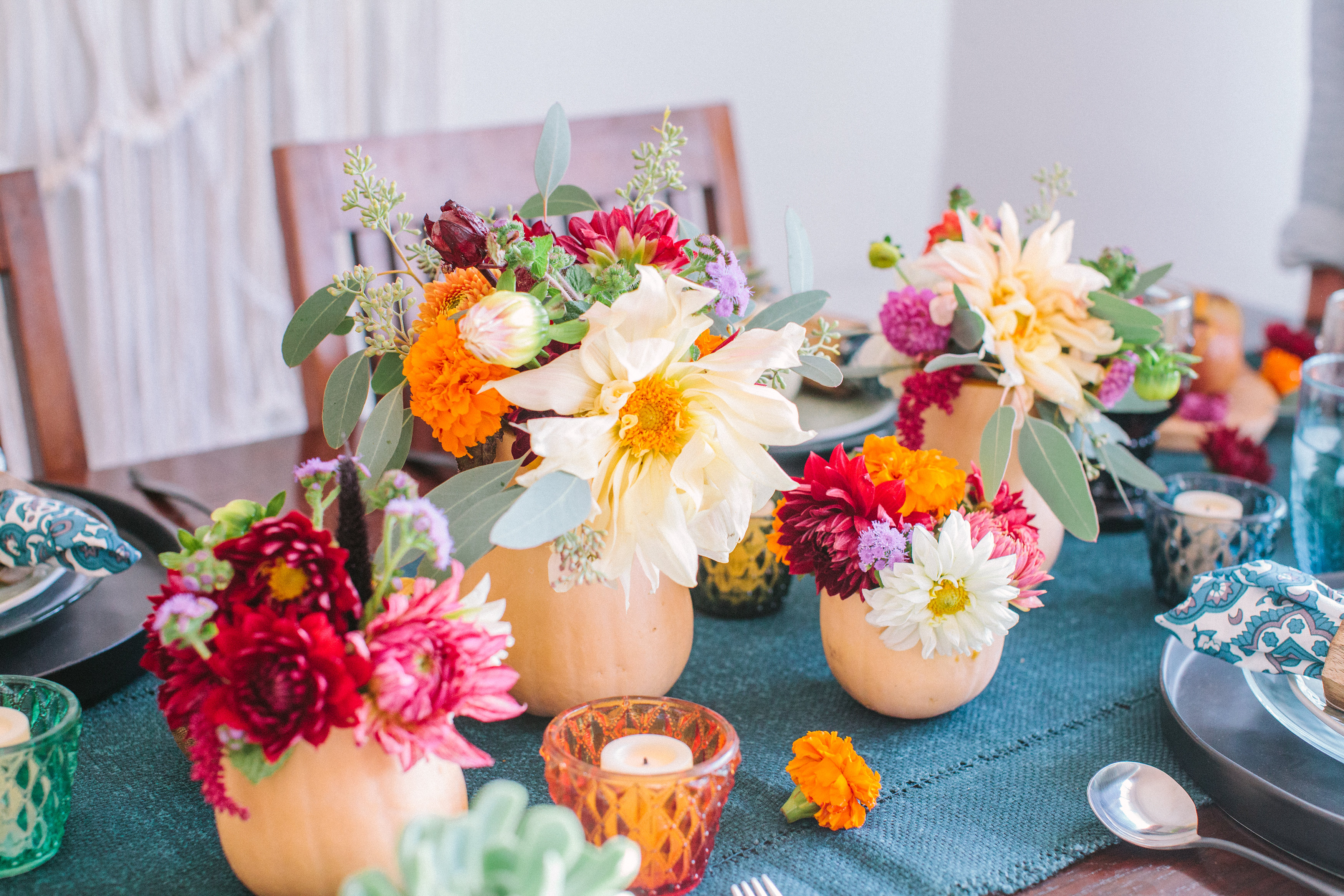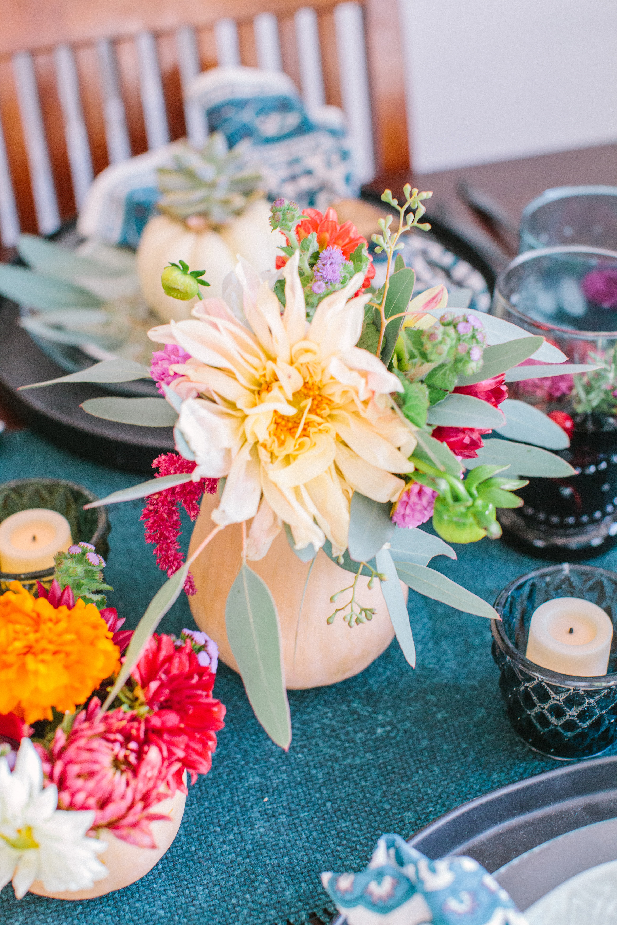For flowers, I simply went to Whole Foods and got some pretty fall colors and assembly the bouquets into butternut squash.