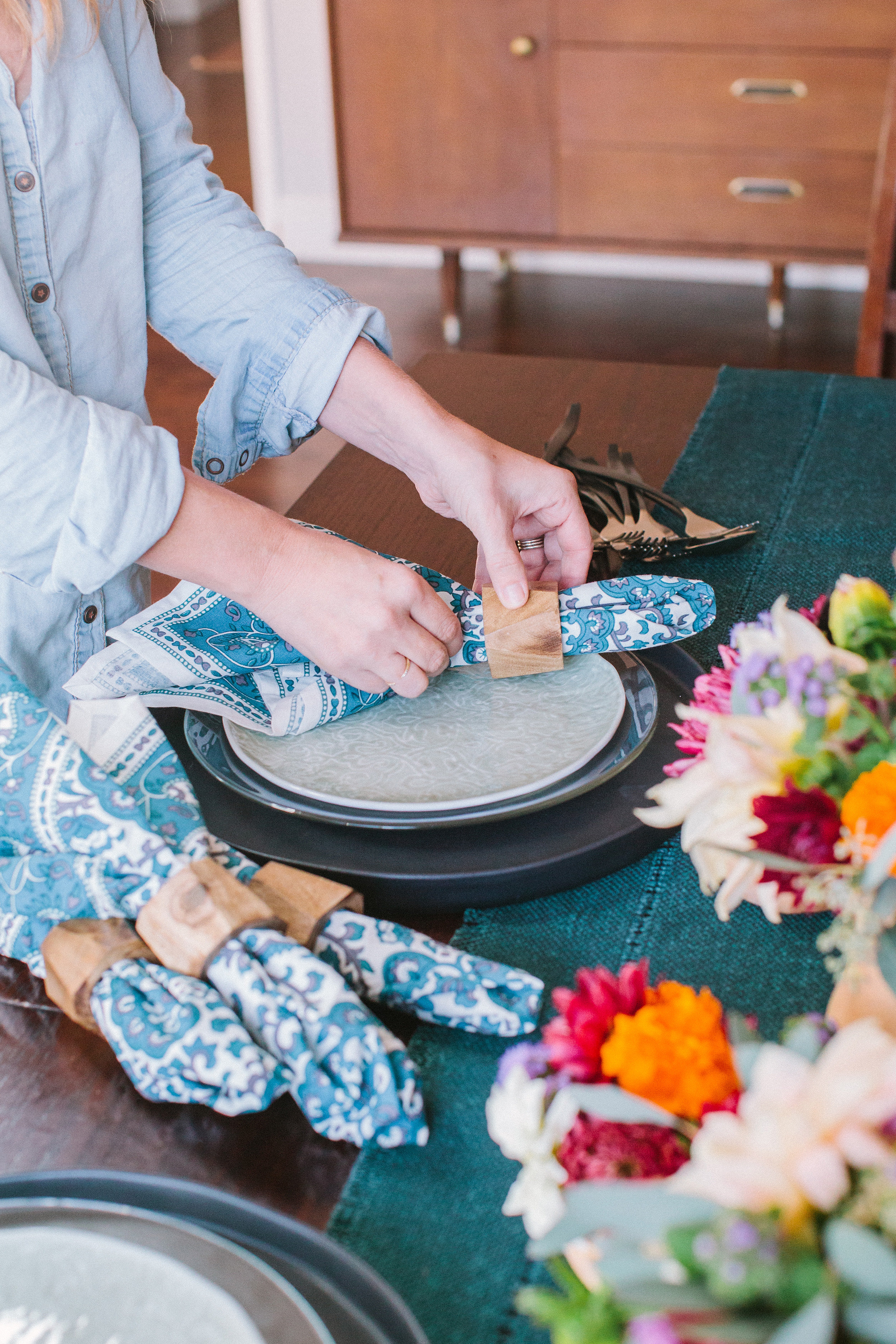 Then place your indigo blue floral baroque napkins on top of your plate, giving it a slight slant.