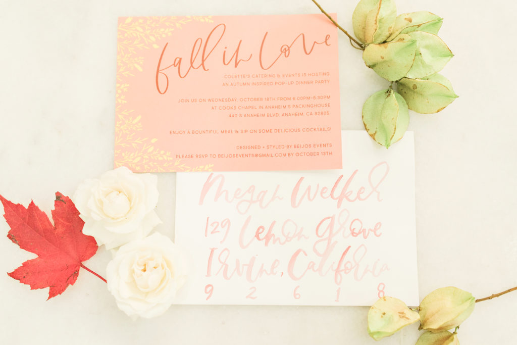 At Colette’s Catering & Events, we really try to focus on seasonal, locally sourced ingredients. Our Executive Chef Colleen Zielinski produces new menus every season for our clients, so we wanted to do something different to showcase our new autumn menu. A pop-up dinner came to mind and what a better way to really focus on the food and try something we haven’t done before. This dinner had to be at a special location, so we chose one of our favorite venues; Cooks Chapel in Anaheim’s Packing District. Of course, we had to reach out to our ever-so-talented friends of Beijos Events, to design the dinner and set the look and feel for the event.