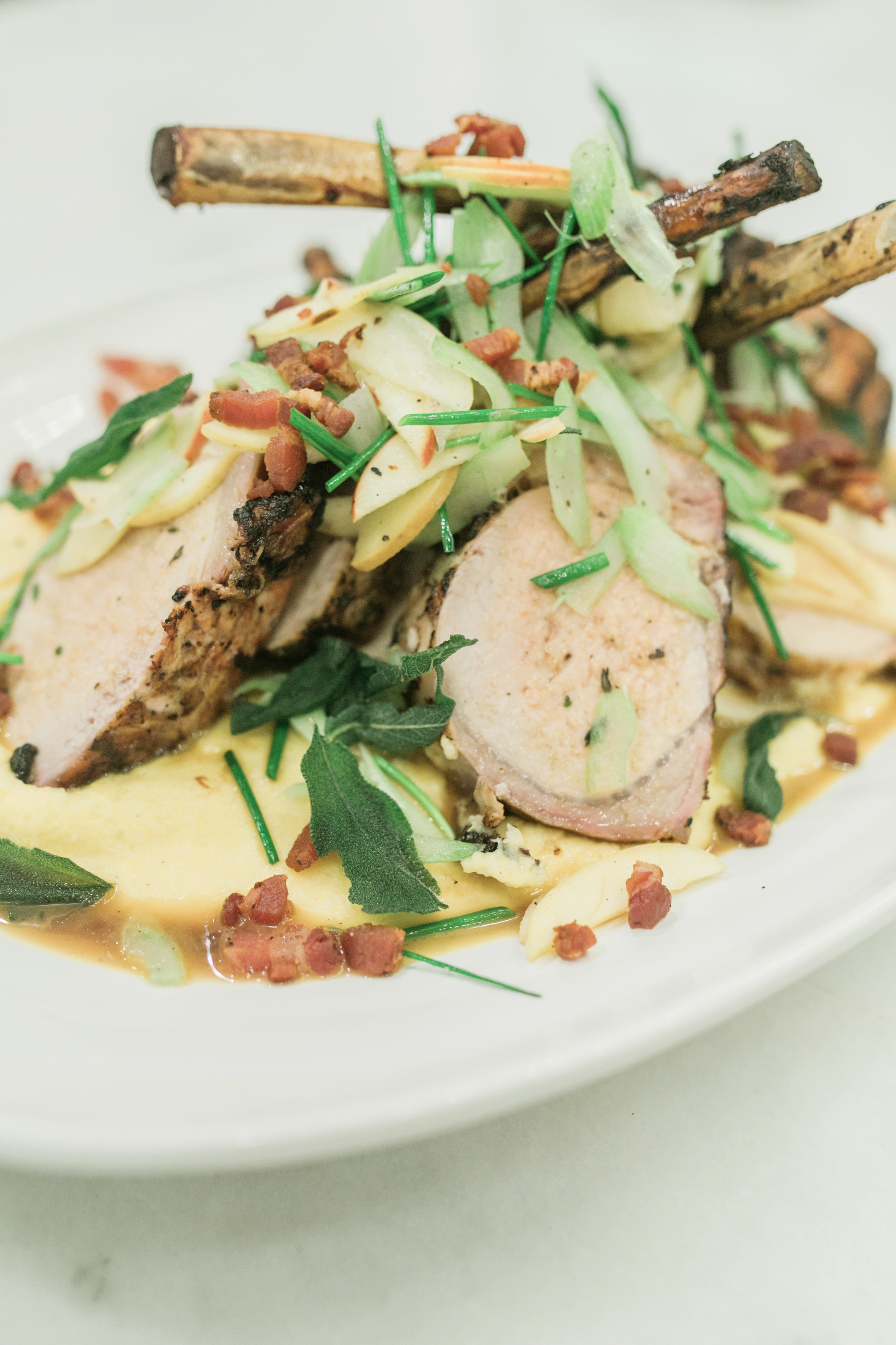 Pan Roasted Petite Tender, Cranberry Demi, Spiced Sweet Potato Puree, Shaved Brussels Sprouts Grilled Pork Tomahawk, Aged Cheddar Polenta, Pancetta, Sage Pickled Apple Slaw, Bourbon Jus Cauliflower, Brown Butter, Marcona Almonds, Petite Herb Salad, Anchovy Crumb