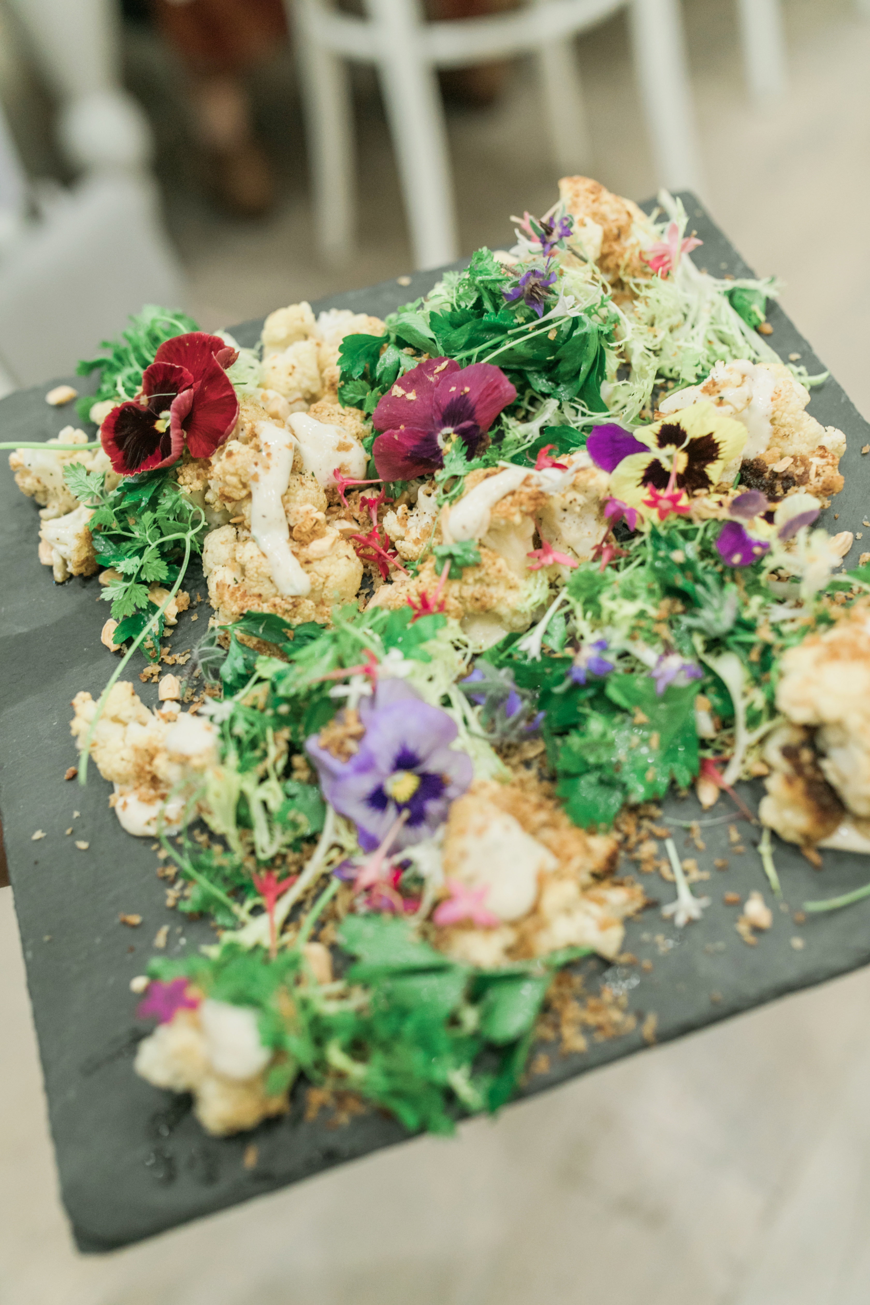 The tables were set in front of the chef’s station, where they prepared delicious dishes while we watched! Urban Gardener did the gorgeous floral arrangements that ran the length of the tables and through-out the space.