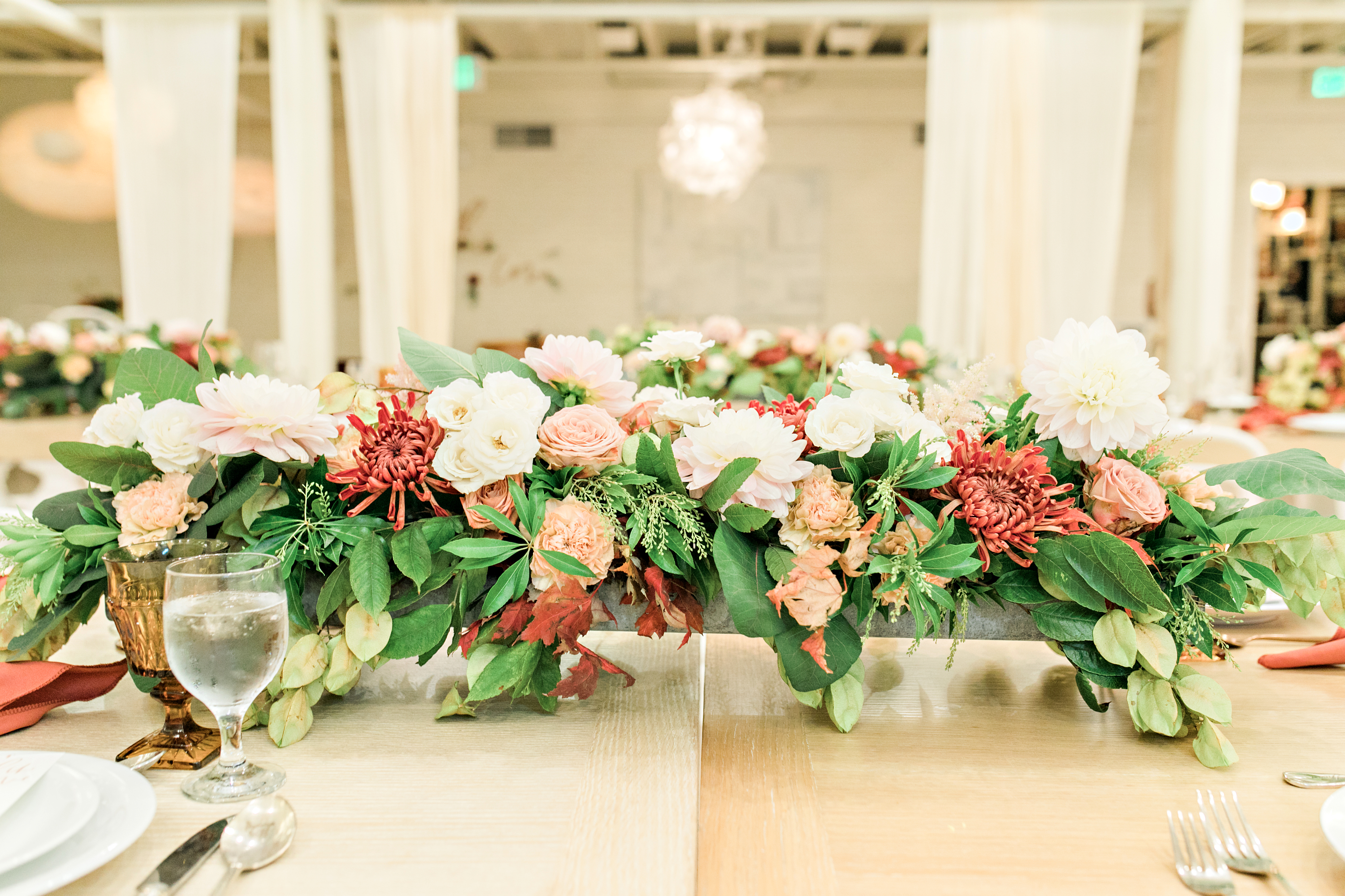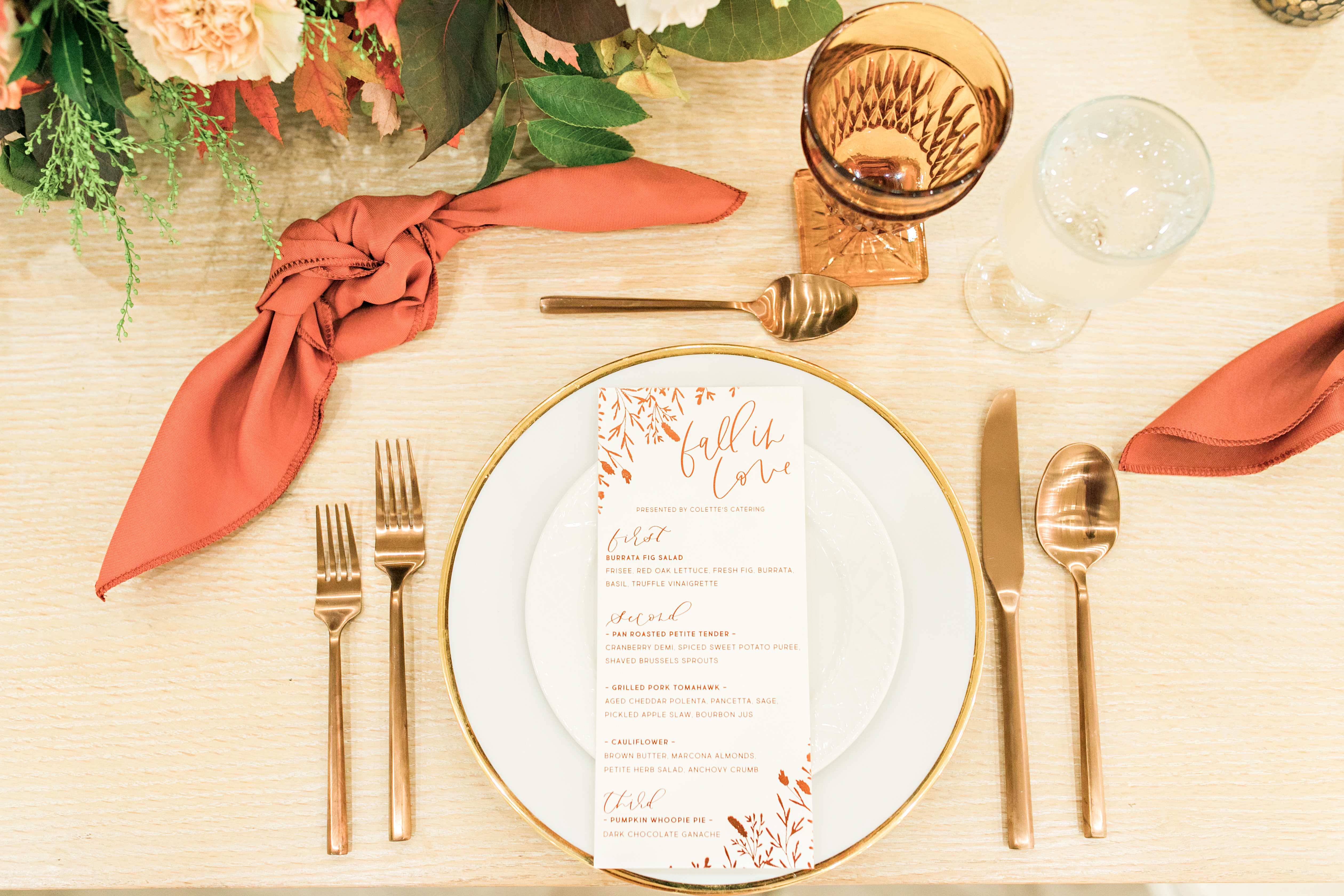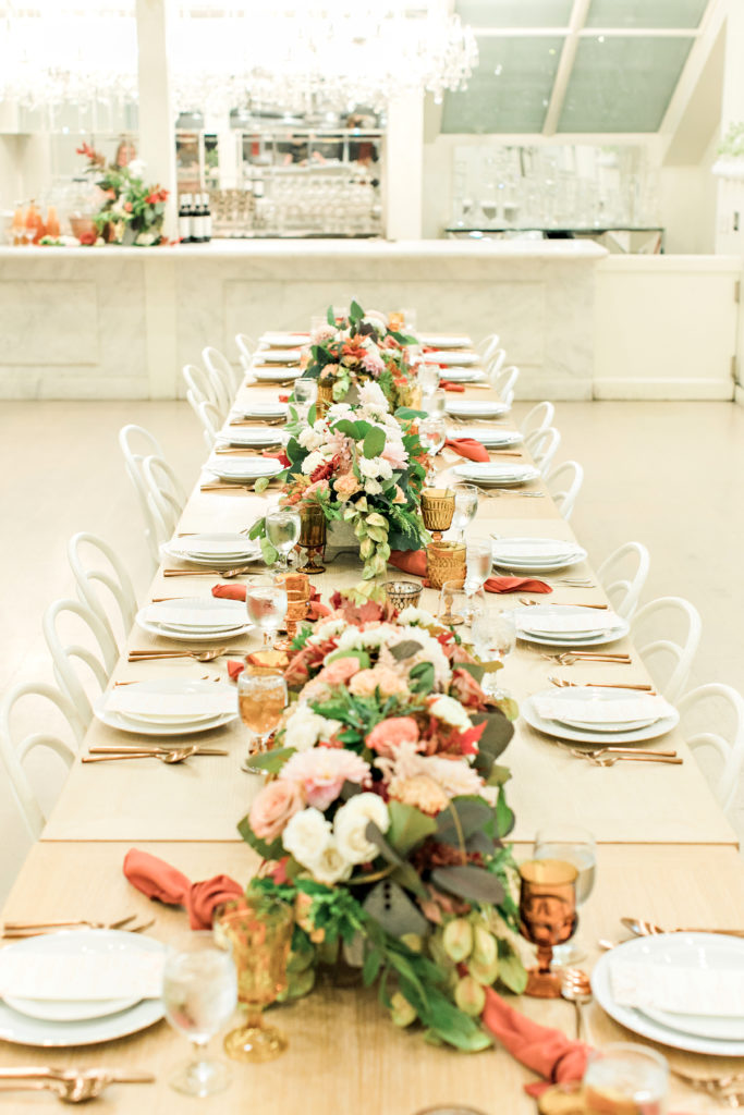 We worked with some of our favorite vendors and some new friends to bring this night to life. Our venue, Cooks Chapel at the Anaheim Packing house, is gorgeous already so it didn’t need much to make it pretty. The feel had to reflect the delicious menu Colette’s created inspired by the Autumn season. For the colors we went classic Fall with burgundy, copper and amber, nice warm tones reminiscent of the season.