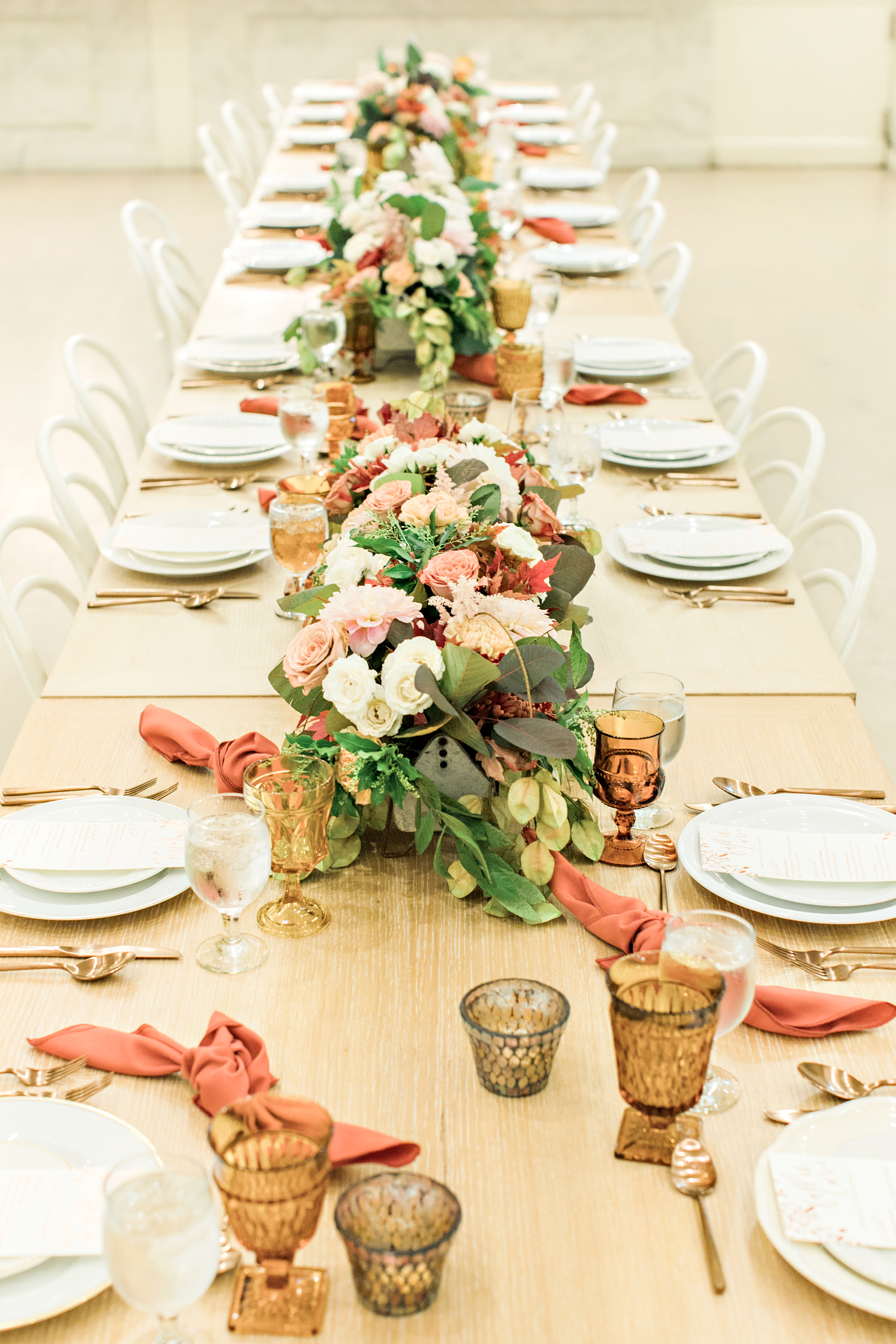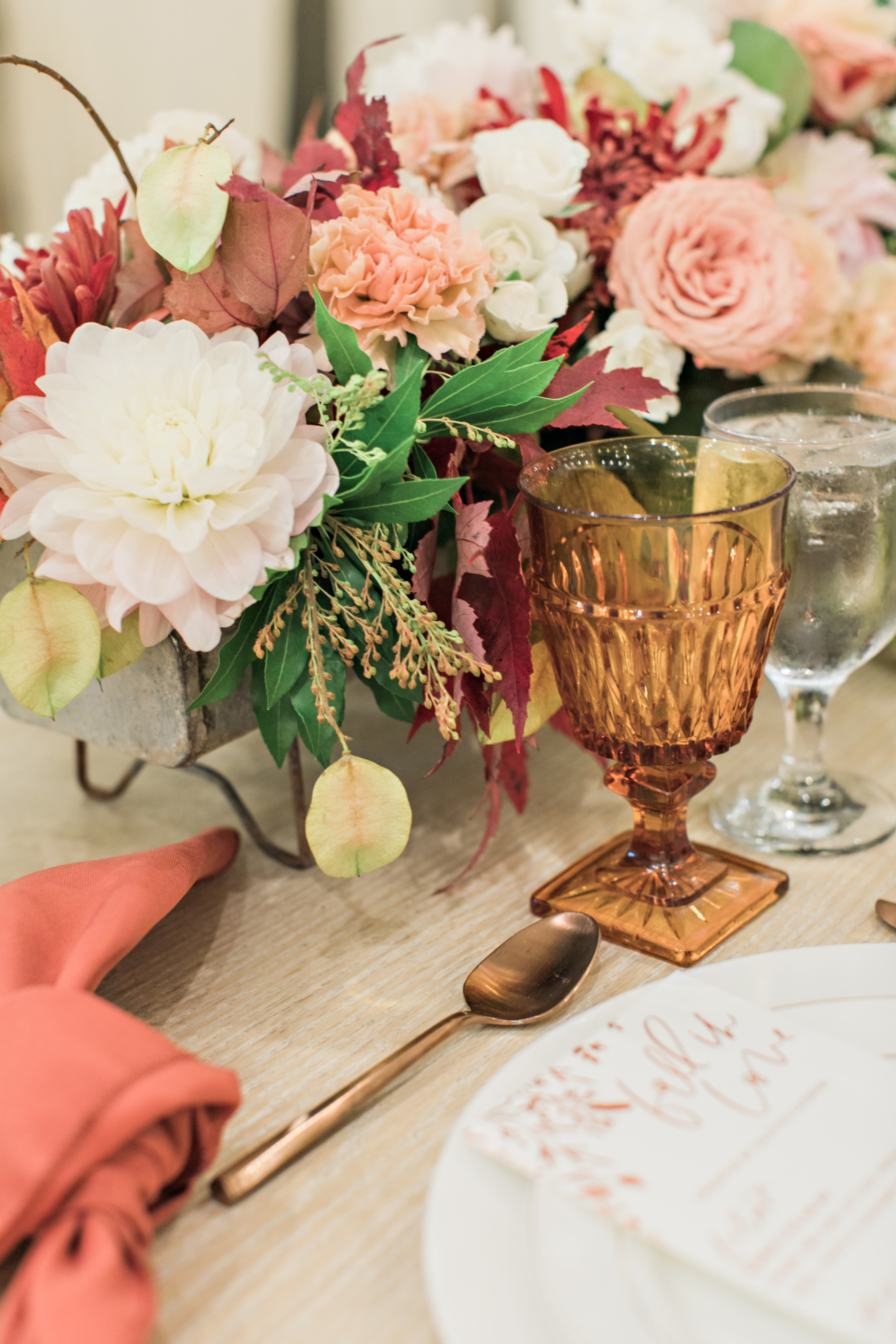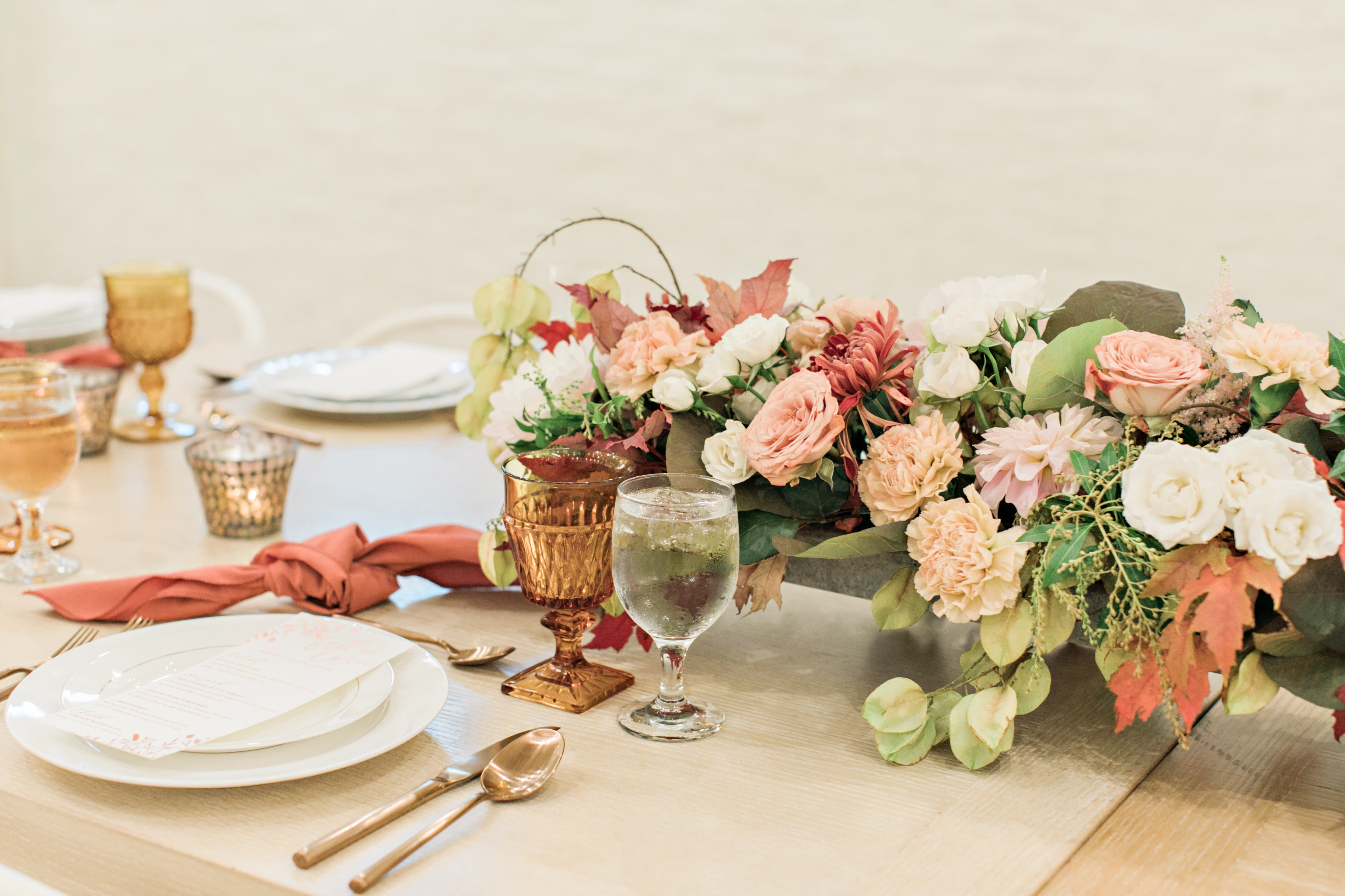 We worked with some of our favorite vendors and some new friends to bring this night to life. Our venue, Cooks Chapel at the Anaheim Packing house, is gorgeous already so it didn’t need much to make it pretty. The feel had to reflect the delicious menu Colette’s created inspired by the Autumn season. For the colors we went classic Fall with burgundy, copper and amber, nice warm tones reminiscent of the season.