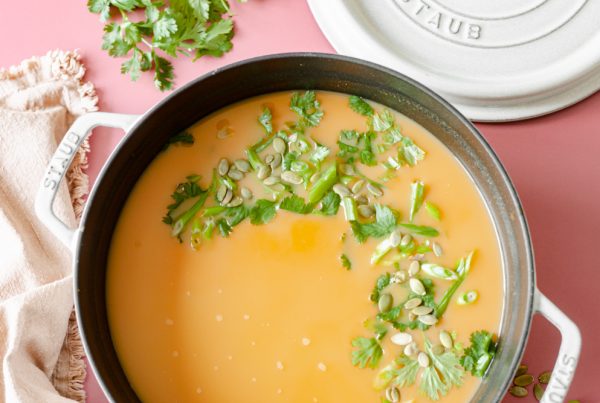 Meanwhile, add the coconut oil to a large soup pot set over medium heat. Once hot, add the red pepper and cook for 3-5 minutes or until soft. Add the cubed butternut squash, spicy curry powder, smoked paprika, cumin, cinnamon, cayenne, and thyme. Season with salt and pepper. Cook for 3-5 minutes then pour in the coconut milk and veggie broth. Bring the soup to boil, reduce the heat, cover and simmer for 20-25 minutes or until the butternut squash is fork tender.