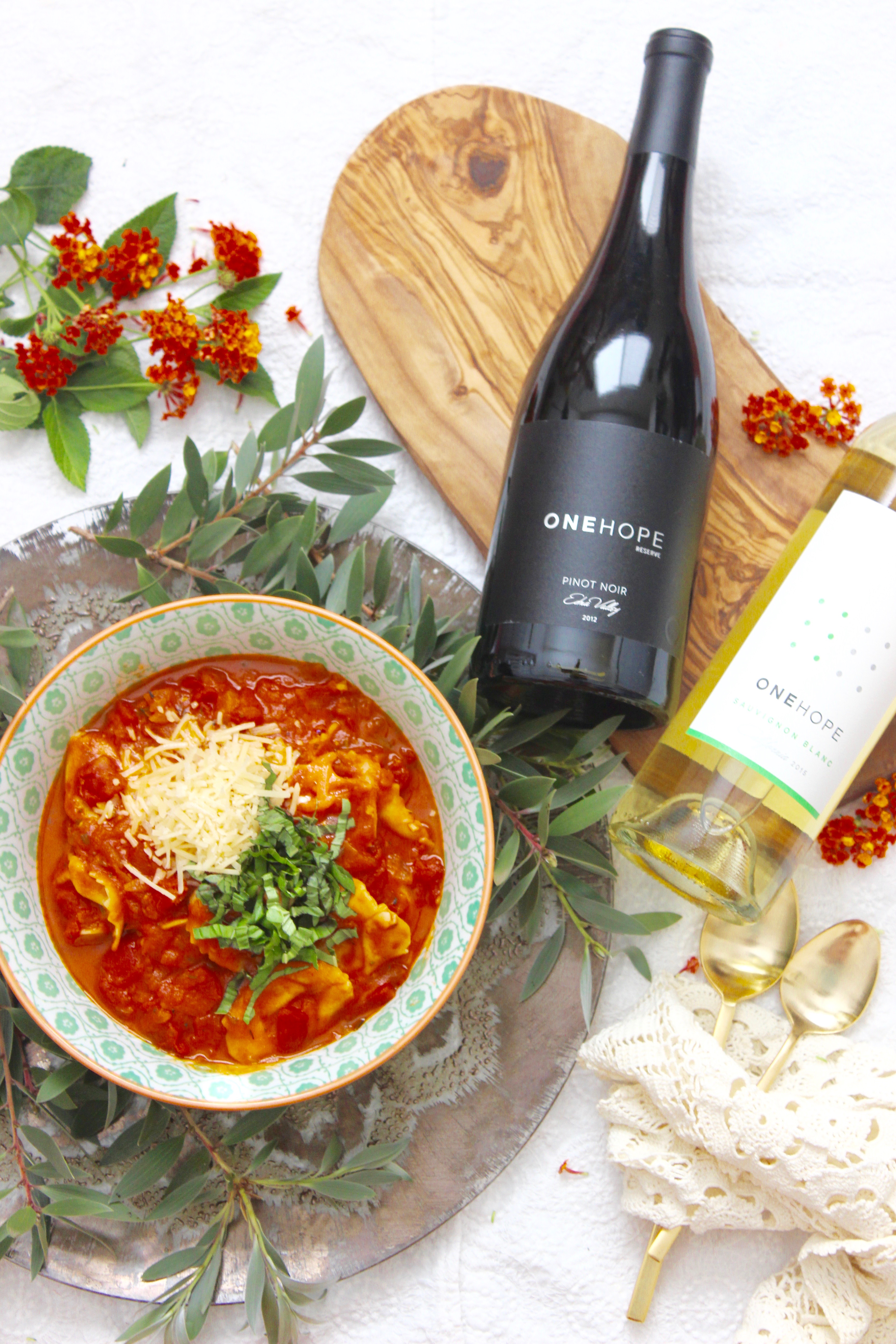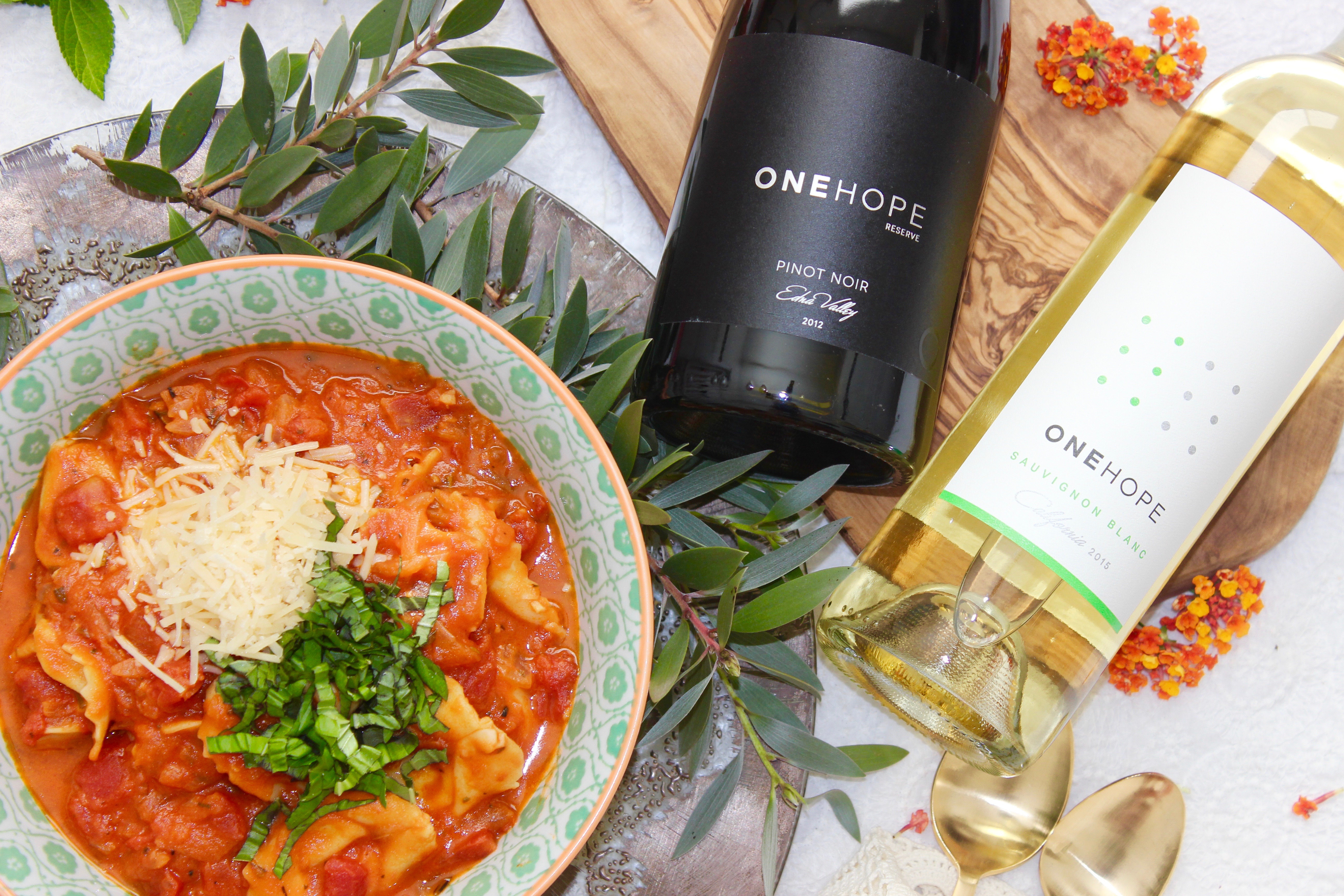 Hey, hey, hey…It’s Friday, yay!!! You know what that means right? It’s soup and wine parings for the month of November in collaboration with One Hope wine. Today we are taking a trip to Italy as we were inspired by this yummy fall soup. Even before you see the pictures your mouth starts watering when you say it….Creamy Tomato Tortellini Soup. And boy is it yummy. Now I’m a true lover of tomato soup so when you add cheese tortellini and some basil, it’s like a flavor explosion. When I made it this week, the aroma in my house was so dreamy. Plus my husband loved it because it’s hearty almost like a pasta dish. Anyway, let’s get to sharing with you shall we…