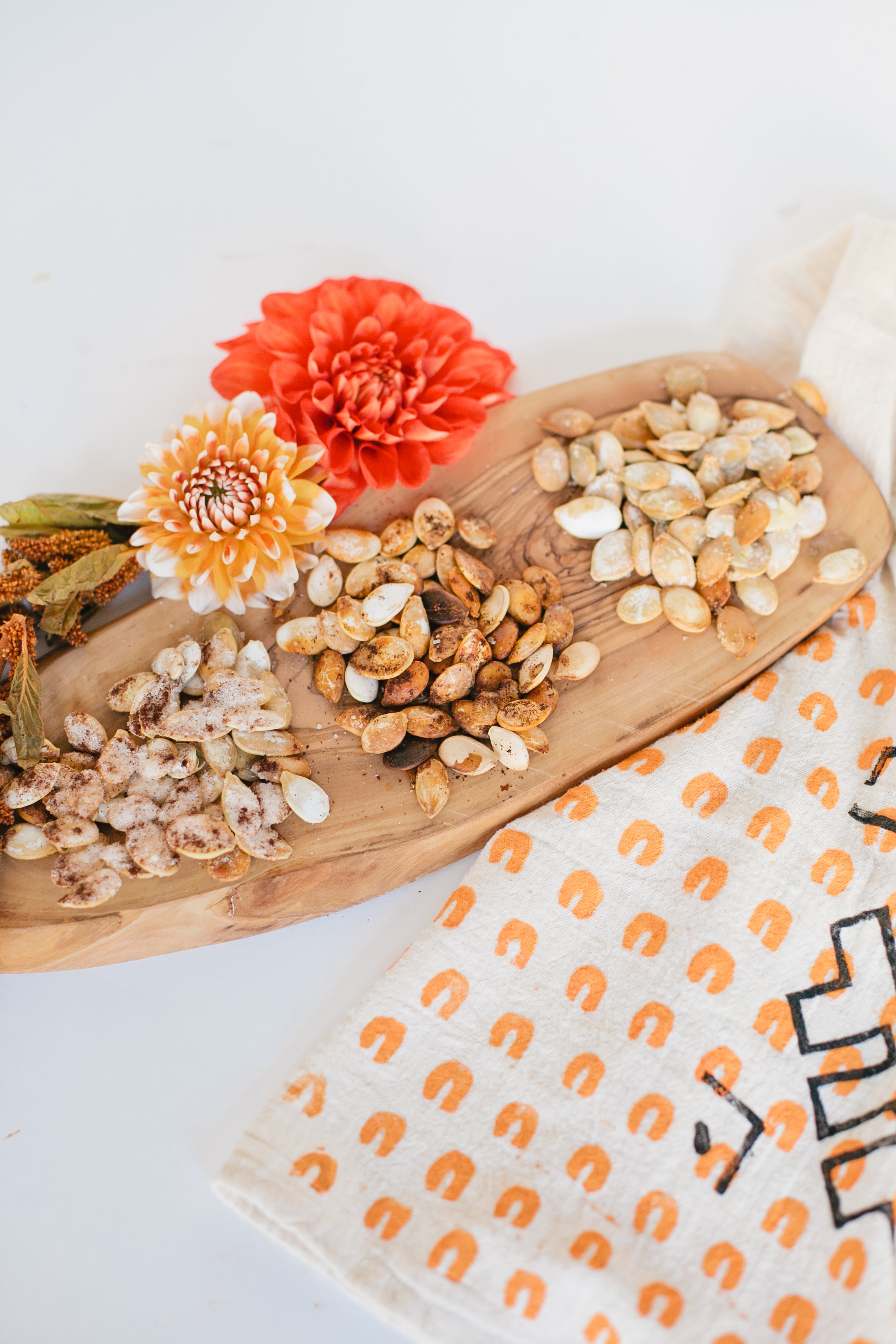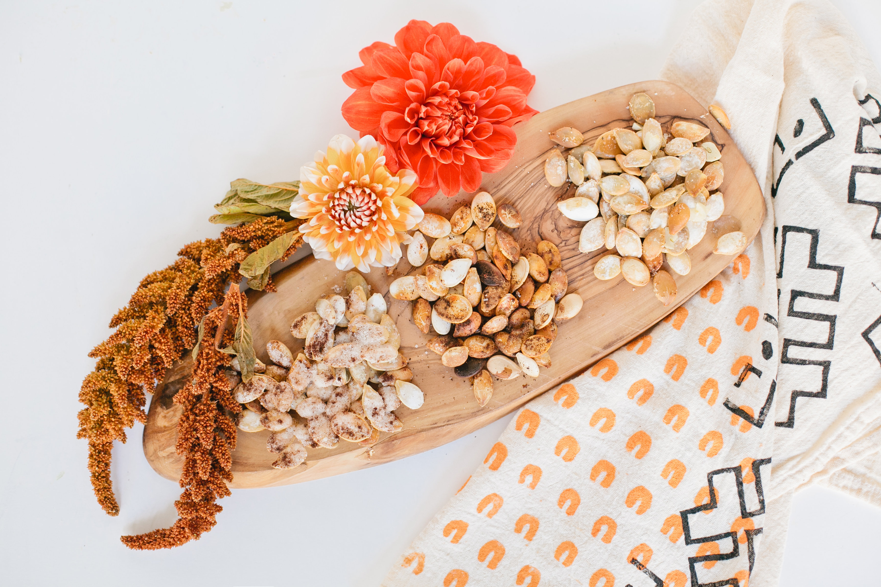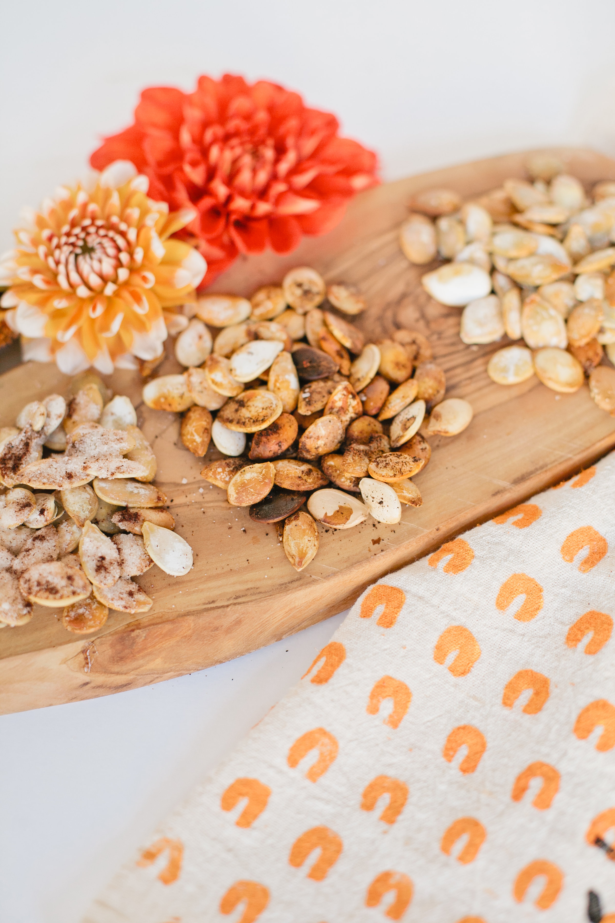 Another Friday so another Fall recipe for you… It’s getting close to the time where you will be carving up those pumpkins!! Although it’s fun to get all messy and creative with your friends and family, one of our favorite parts of that tradition is the yummy pumpkin seeds you get out of it! So we decided to try to do our pumpkin seeds a few different ways with some fun seasonings and flavors. The good old olive oil and salt standby is always amazing, but why not add a little flair?! We tried some out and are here to share the results, which by the way were delicious!