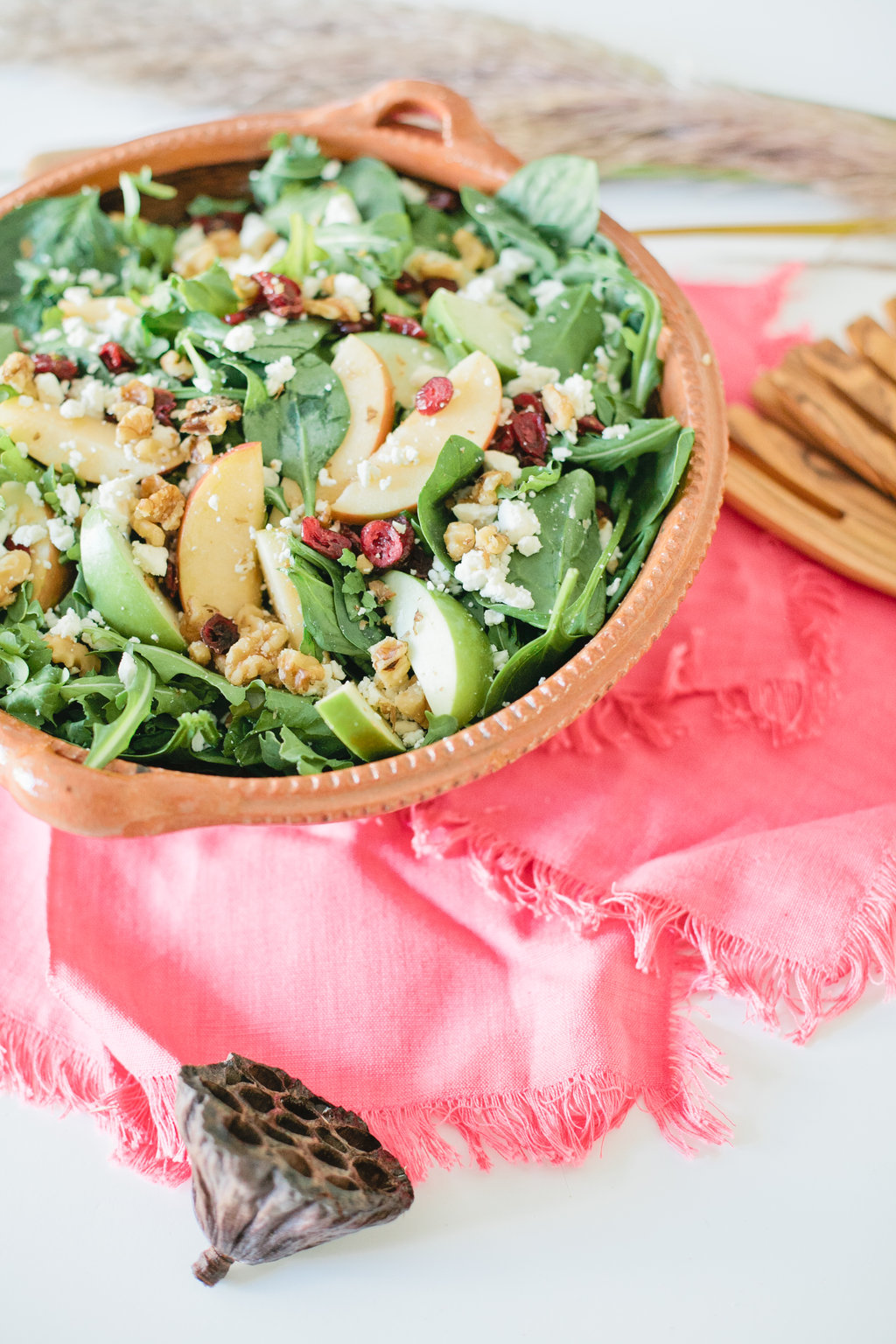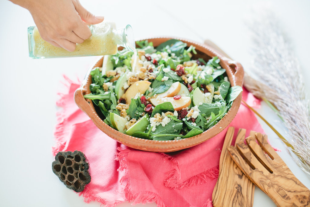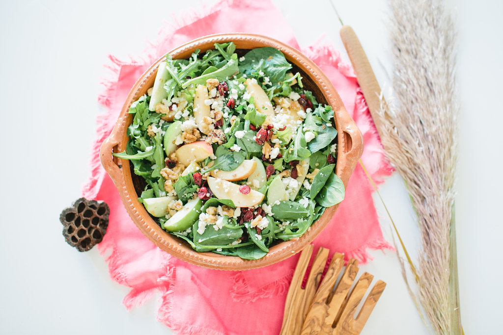 I don’t know about you guys, but I love this combo of ingredients, the title says it all right?? I love the mixture of apples with dried cranberries for Fall. It’s the perfect refreshing combo for your leafy greens. Since it’s still a little warm here in So Cal, it’s a great salad for our indian summer, and super easy to whip up!
